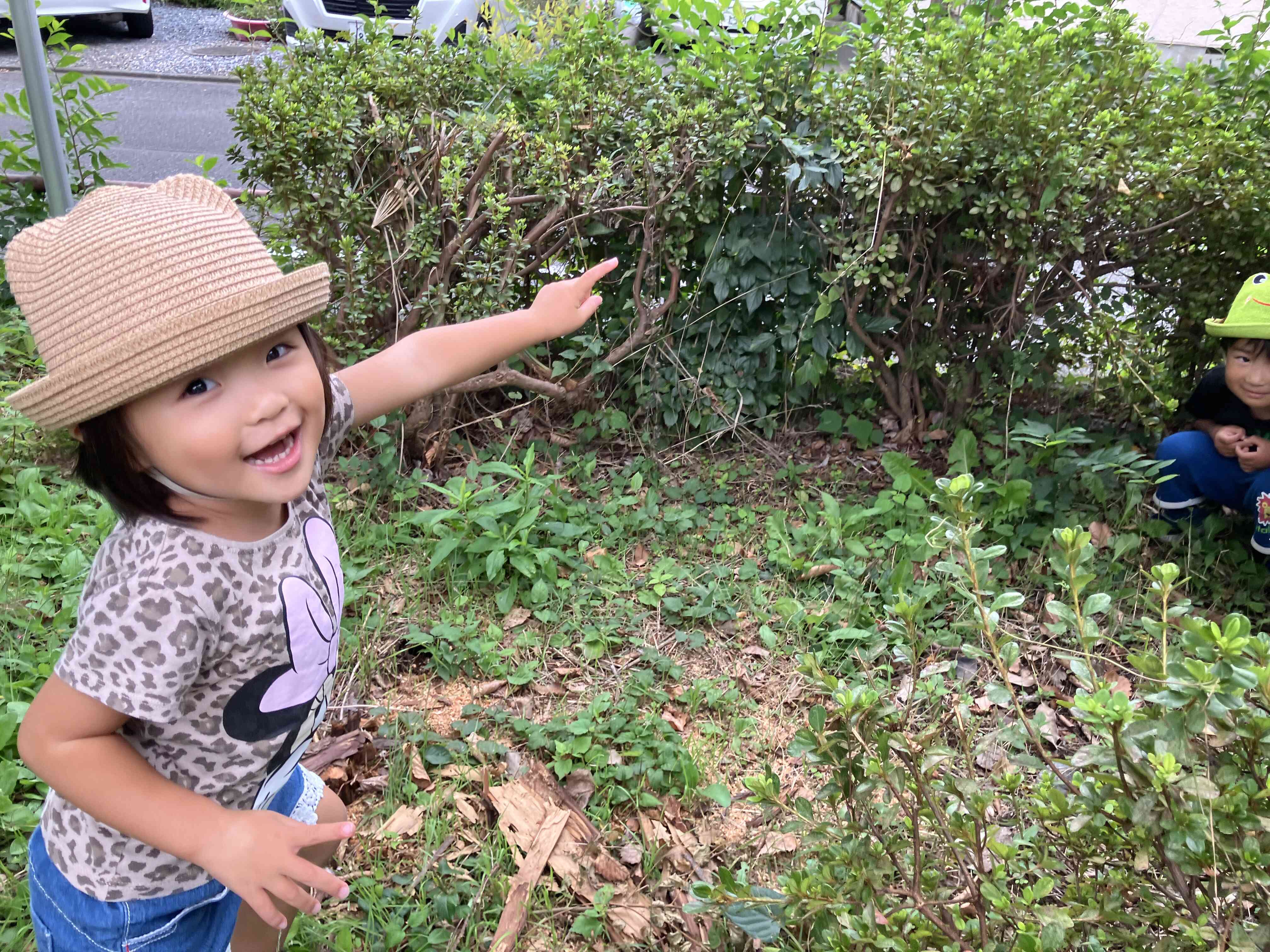「あそこに隠れてるー!」鬼さんに見つかってしまいました。ルールのある遊びを楽しんでいます。