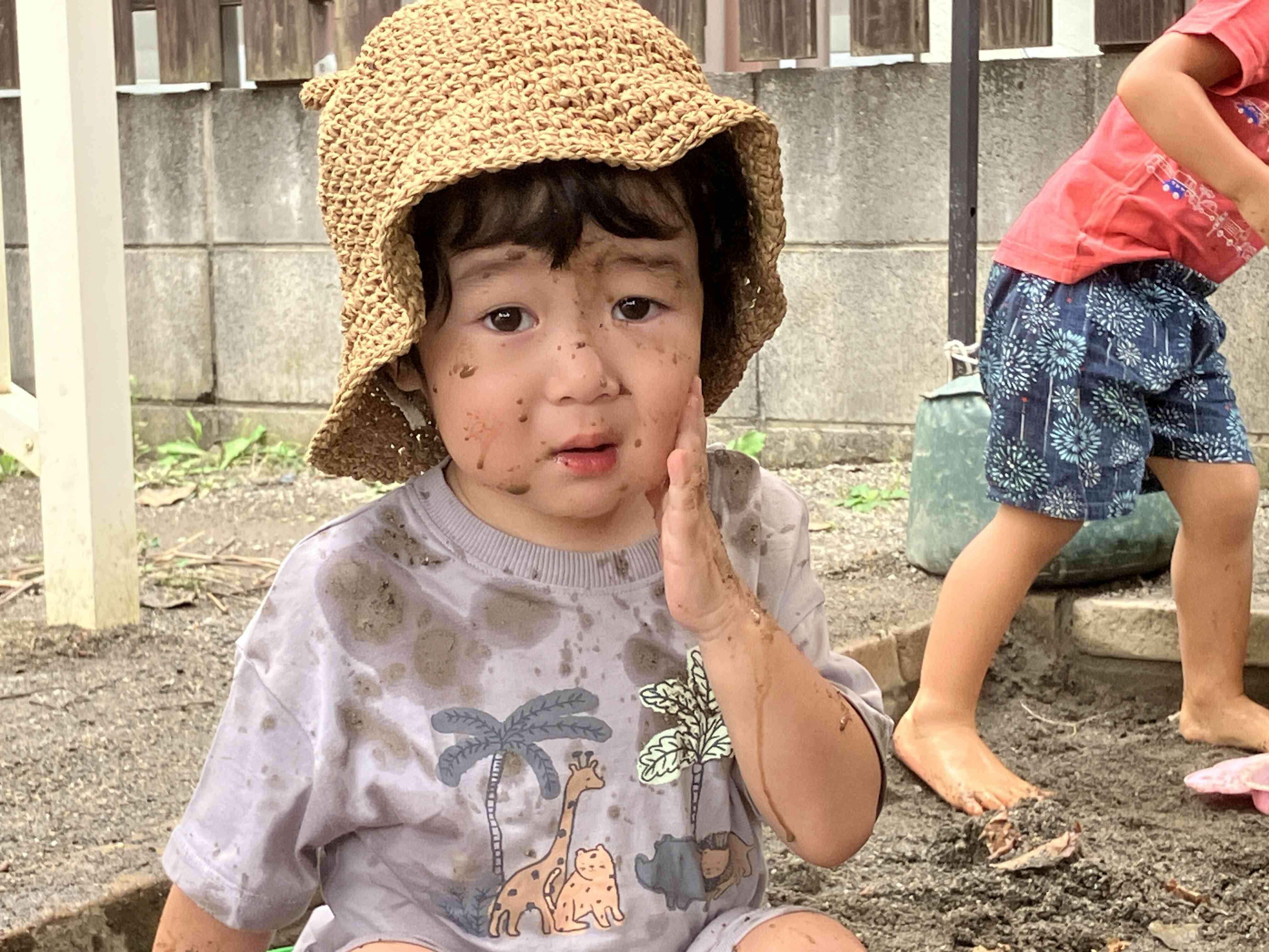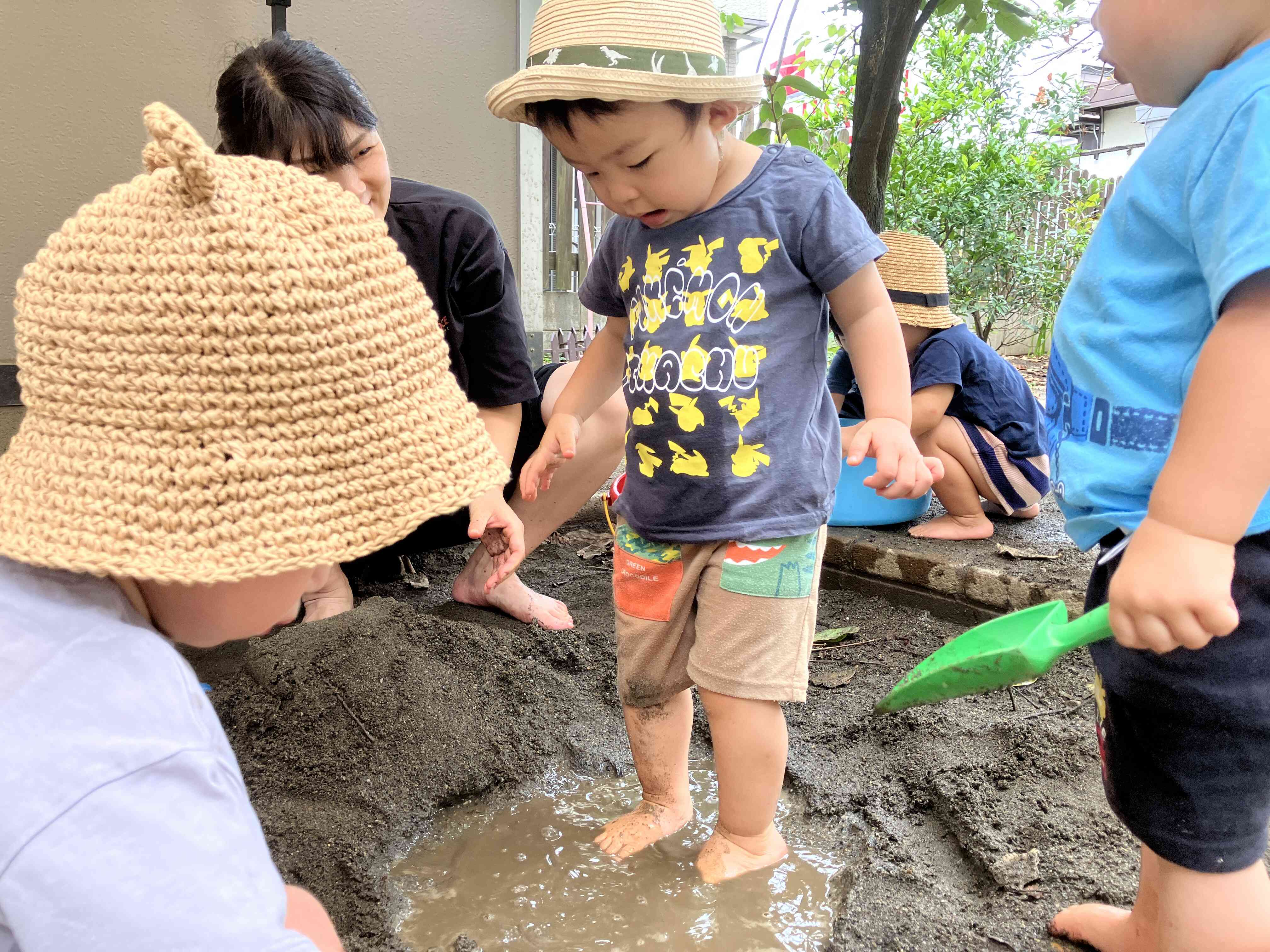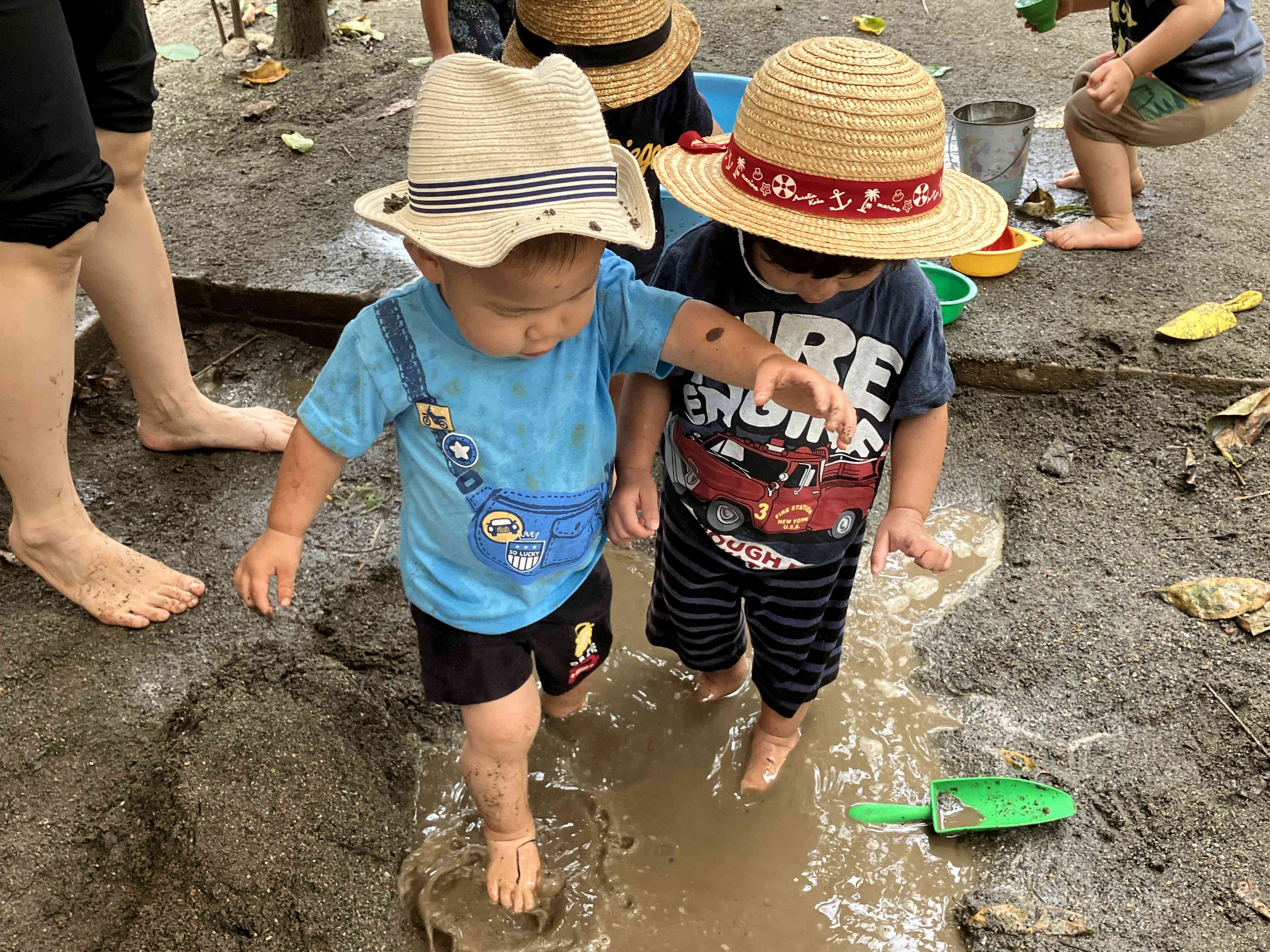 1歳児さんは園庭で泥んこ遊び♪泥んこの中にびちゃびちゃ。