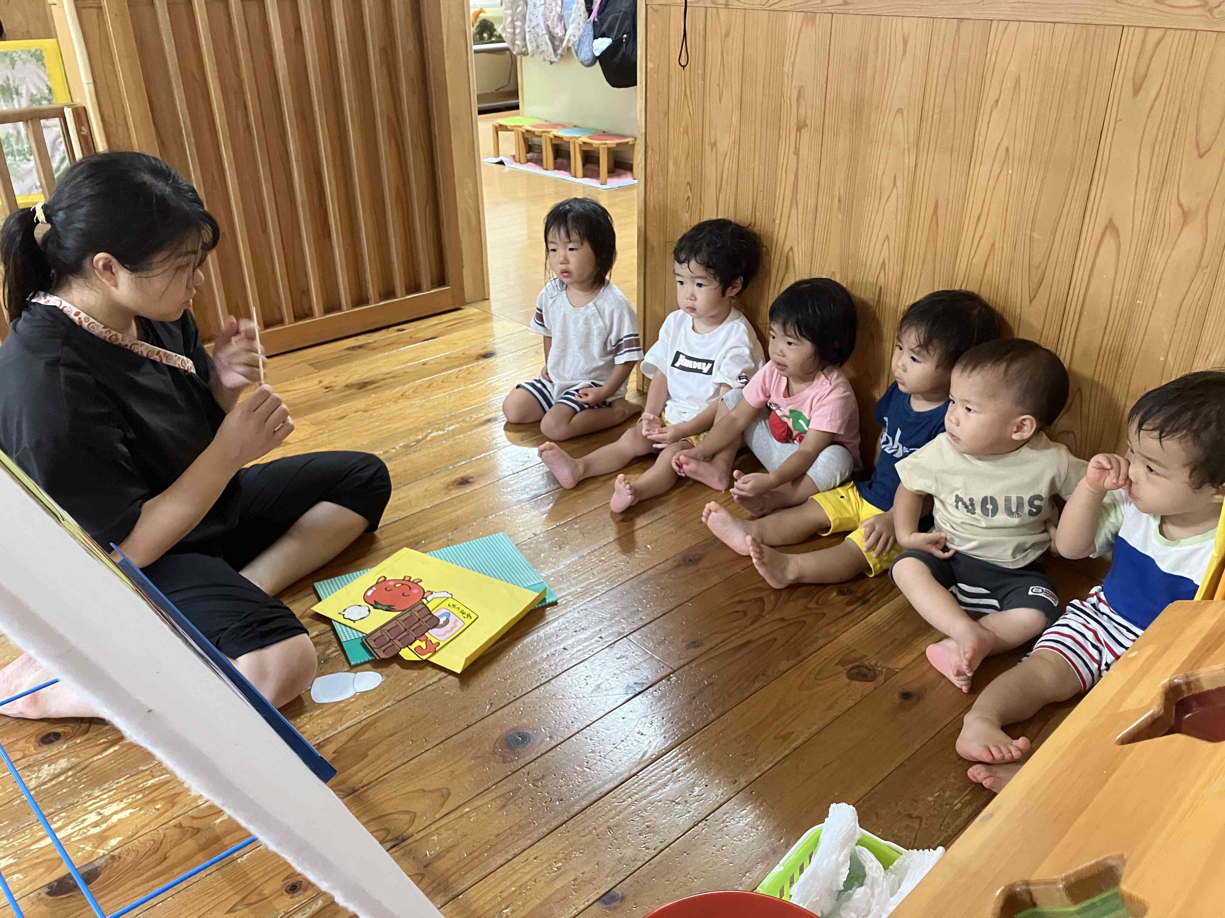 昼食前にカレーライスのパネルシアターを見ました。お話にくぎ付けな子ども達です♬