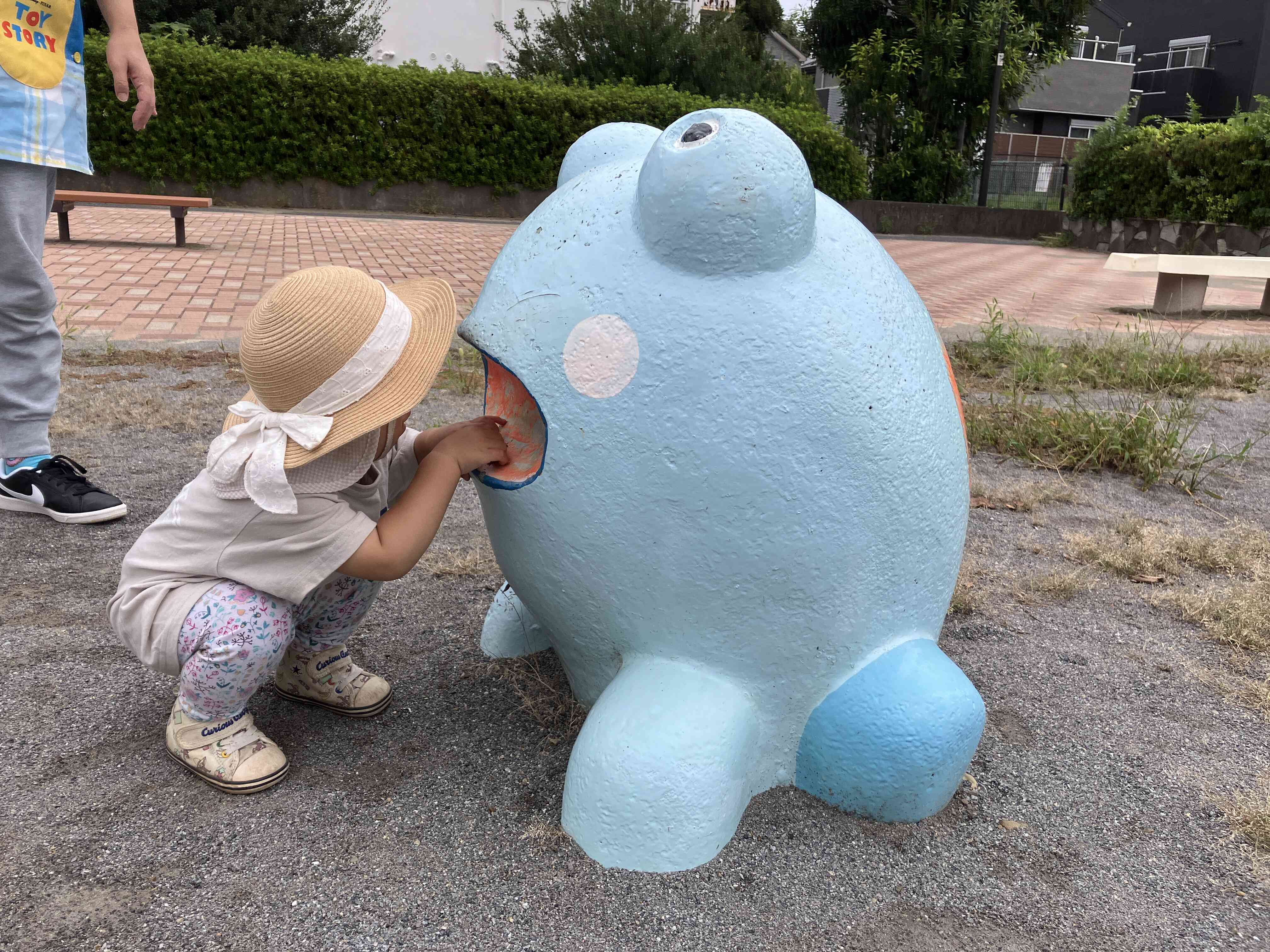 カエルさんどーぞ!お口にあーん。一緒にモグモグと口を動かして楽しんでいました。
