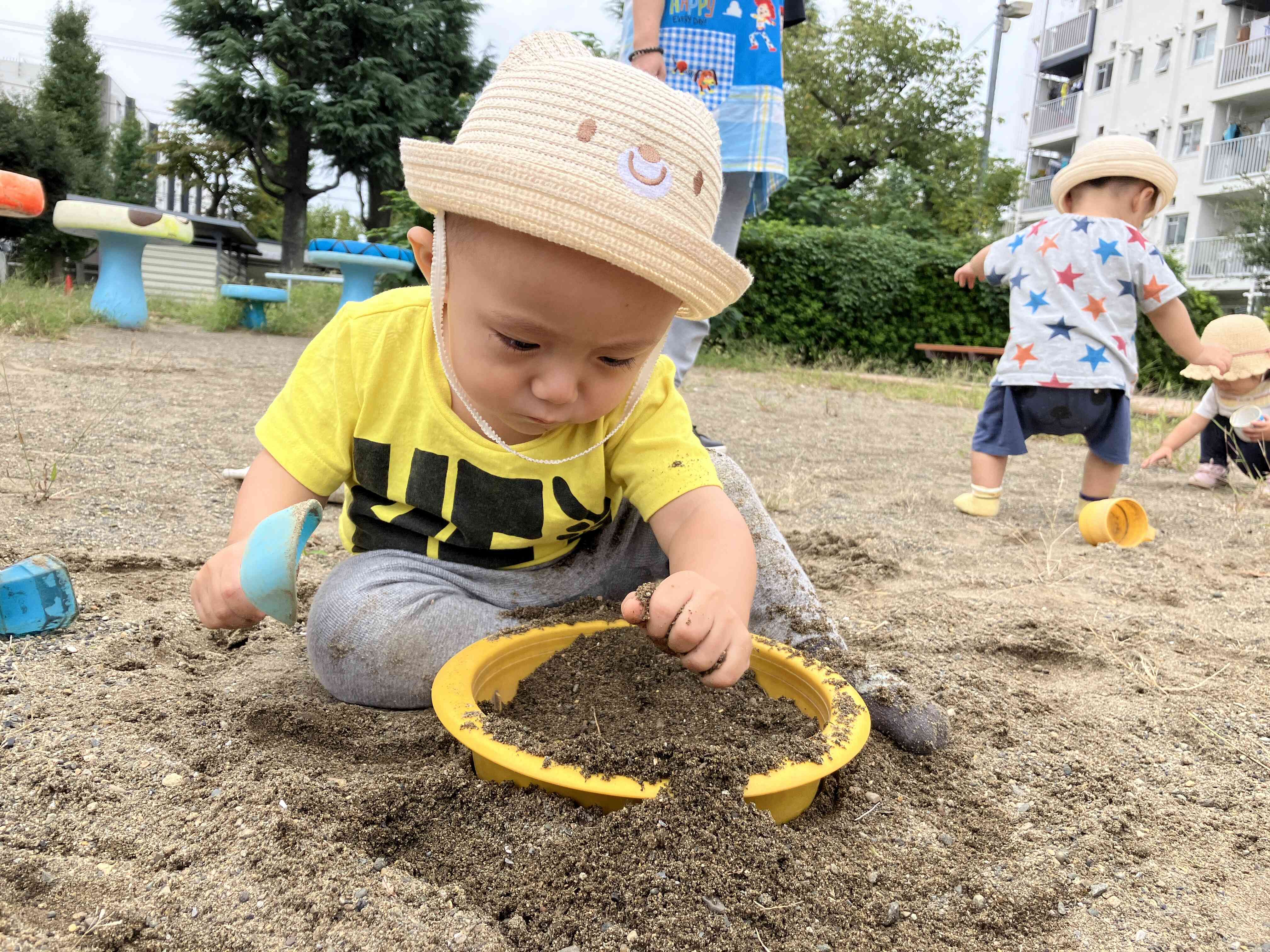 ぎゅと握ったり開いたり、夢中で砂の感触を楽しんでいます。