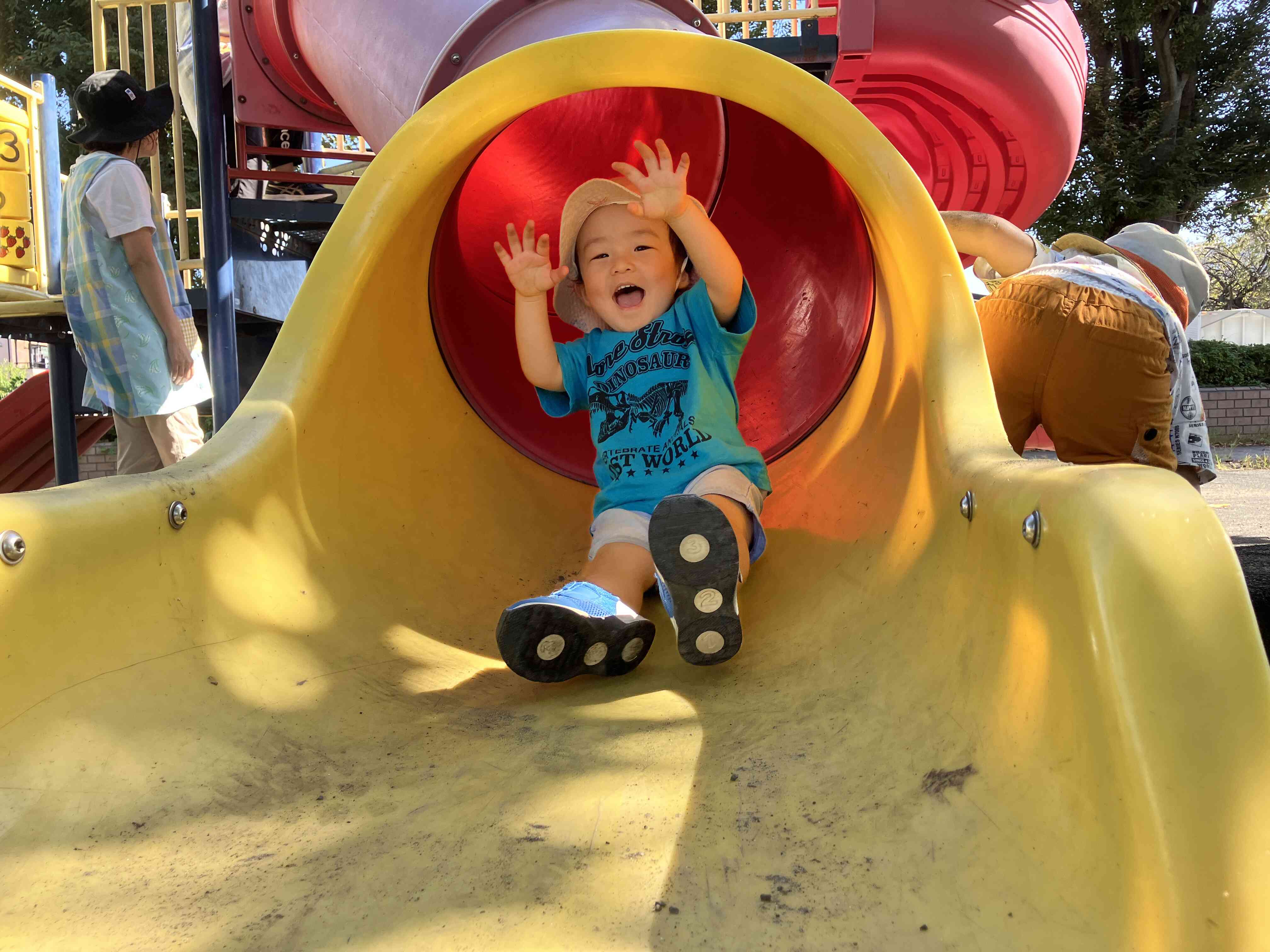 • トンネル滑り台がお気に入りの1歳児さん。両手を上げて「わーい!!」