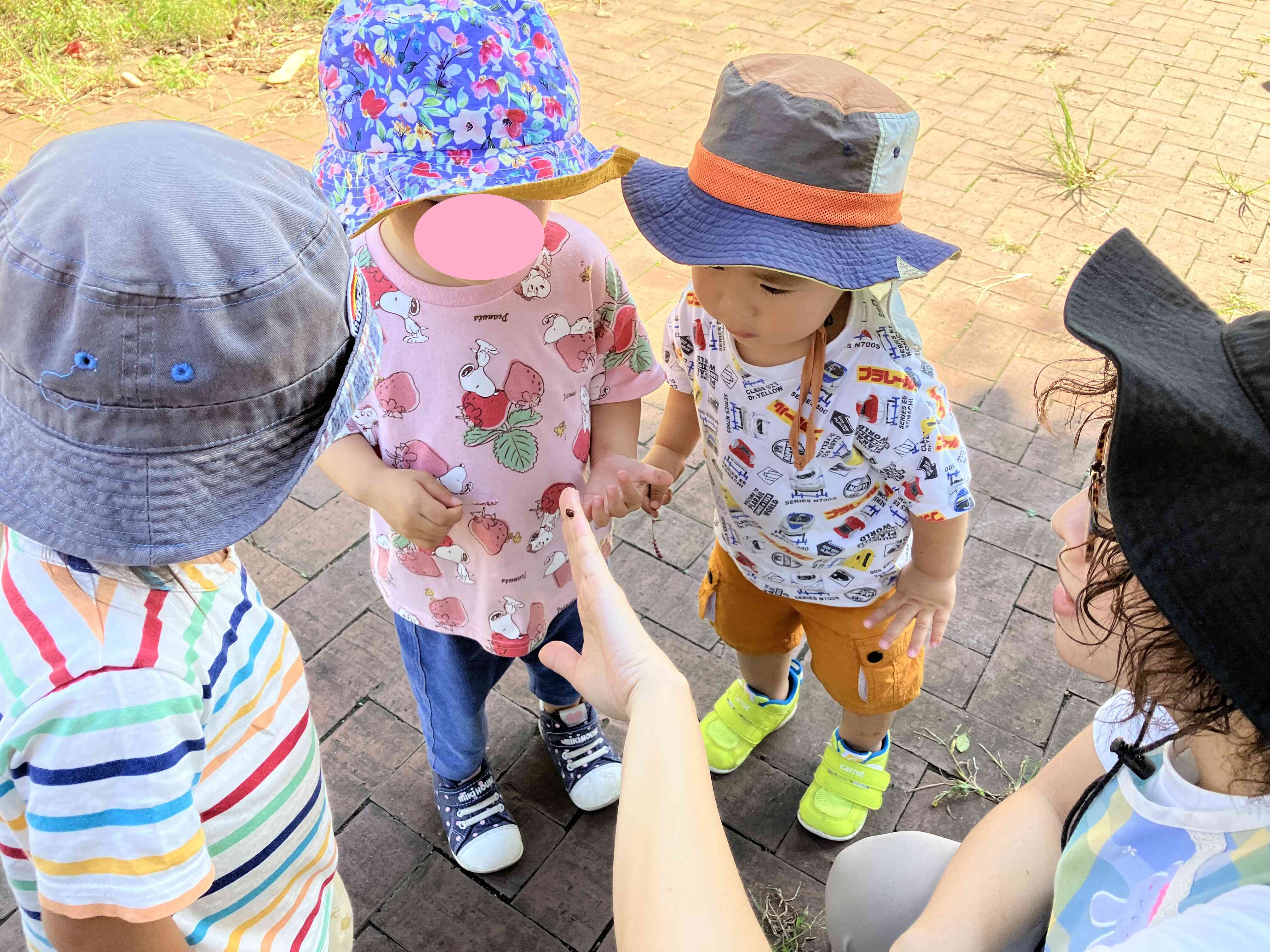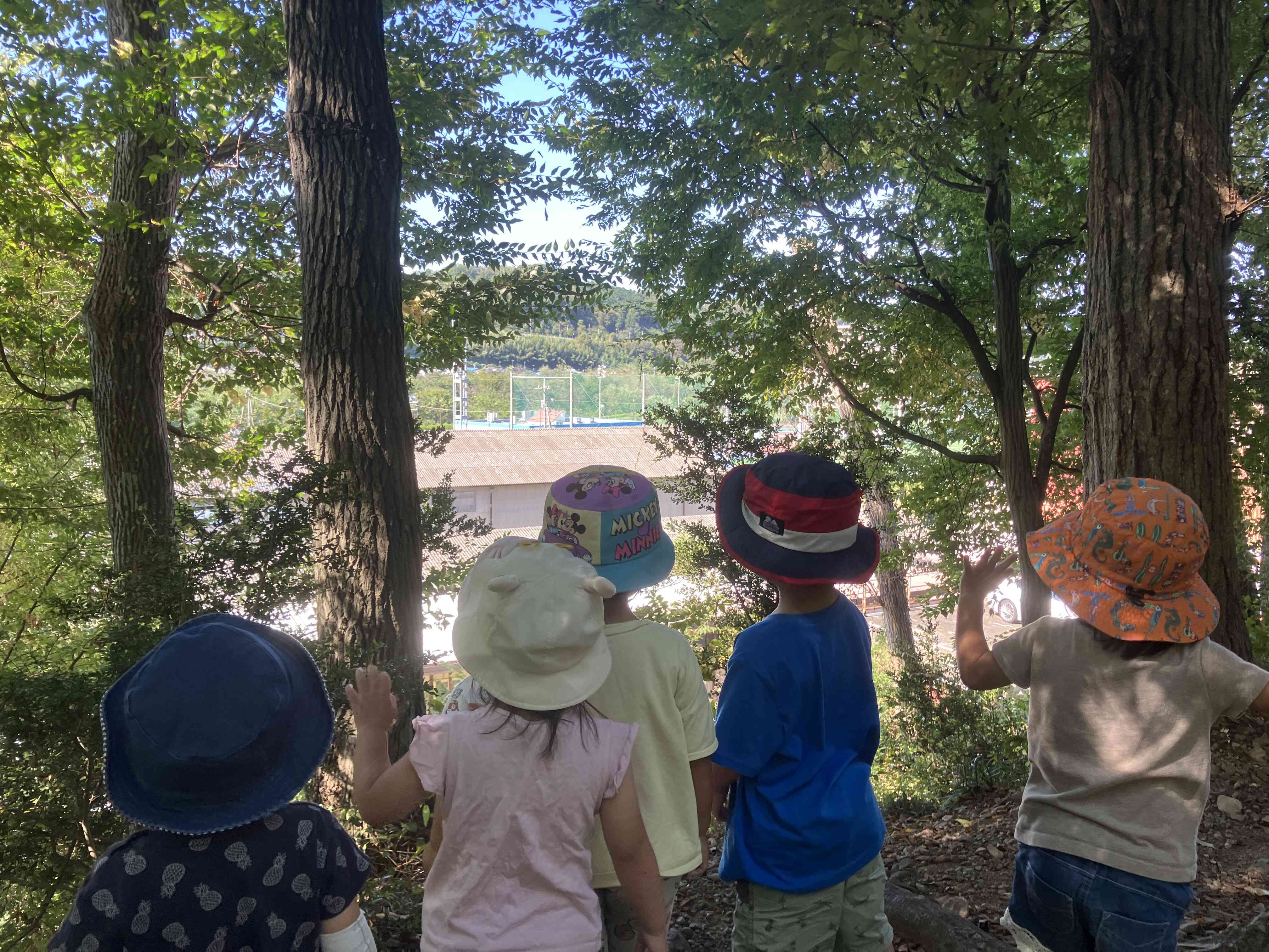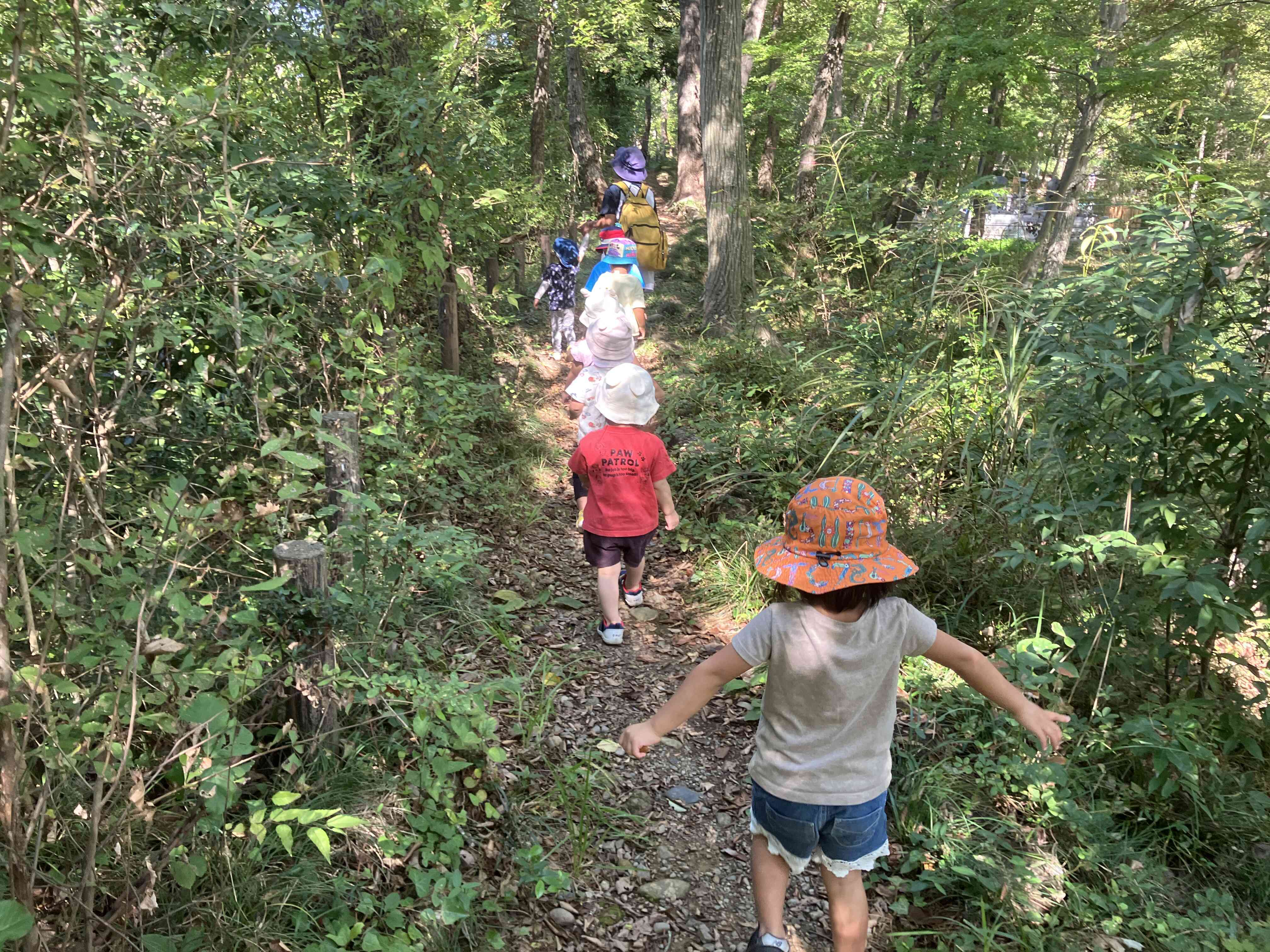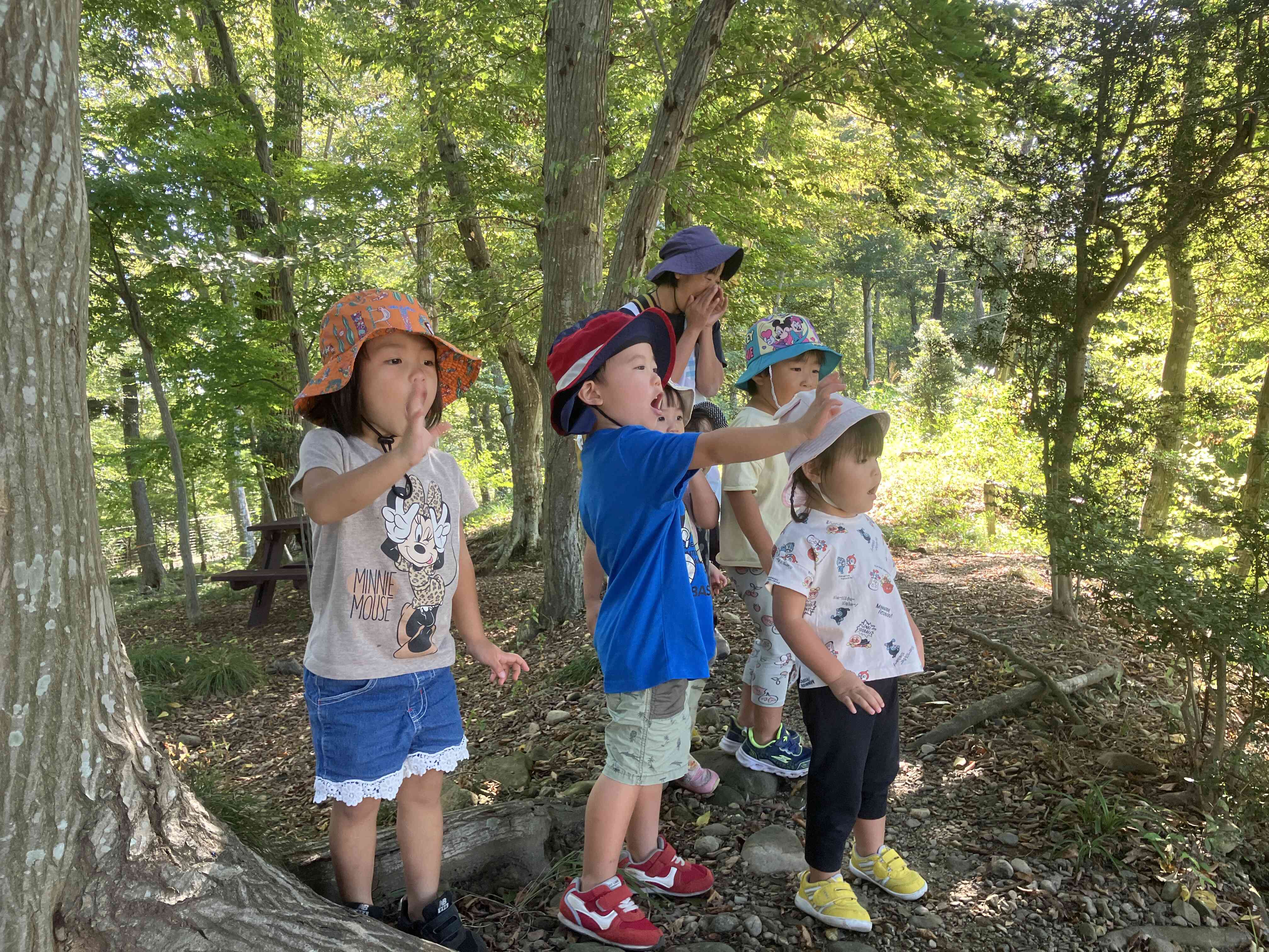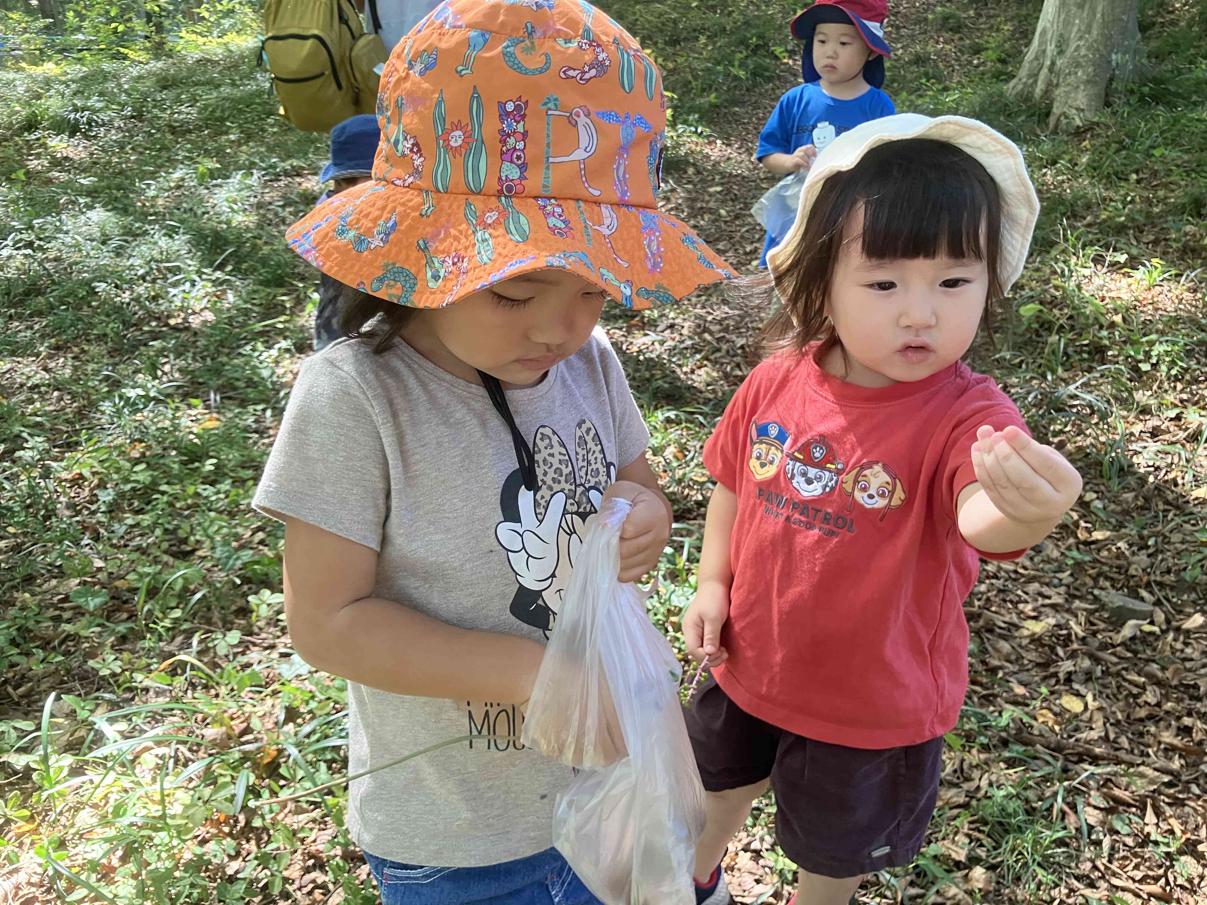 • 2歳児さんは森の中を散策しました。どんな発見があるかな?