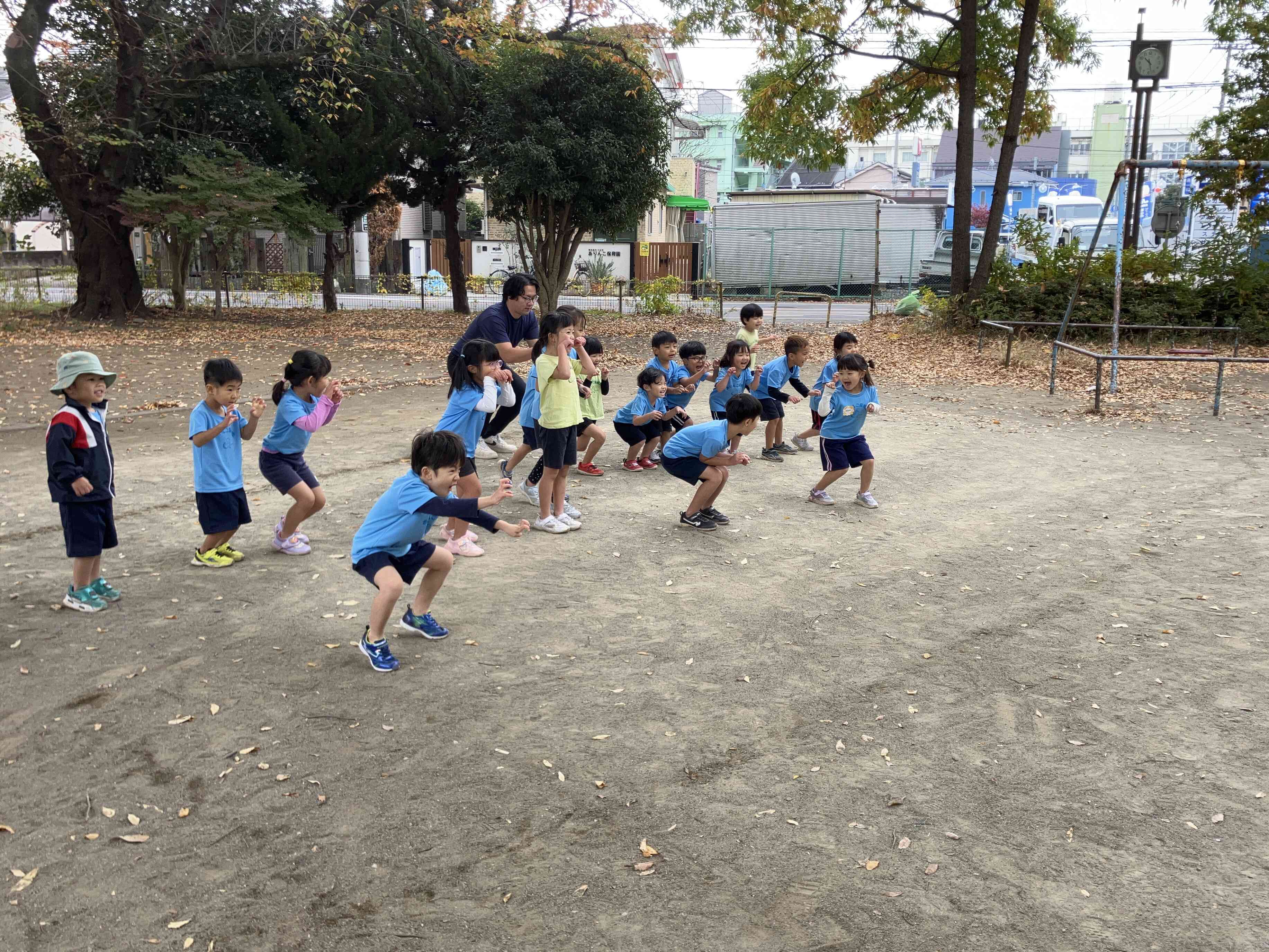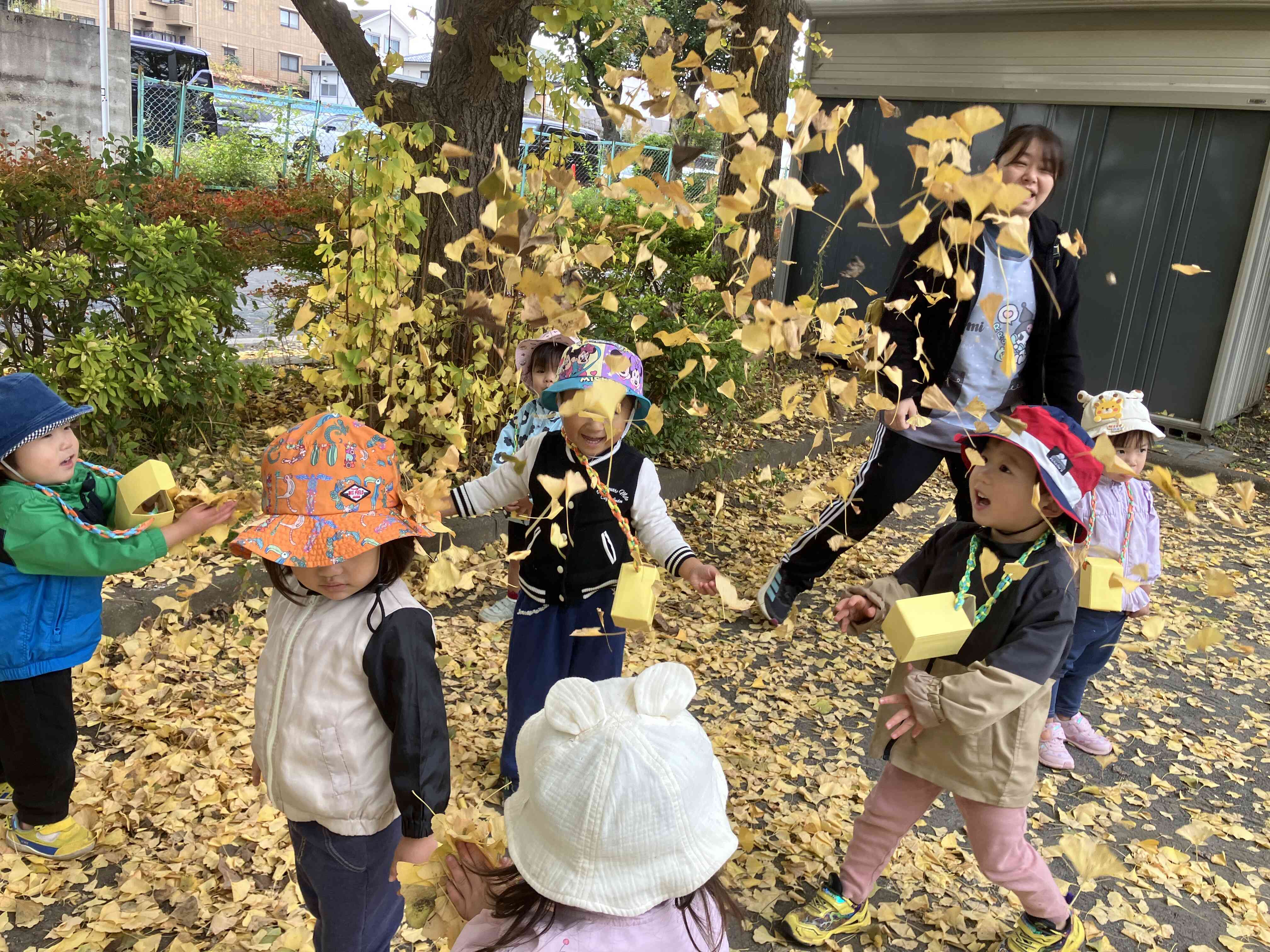 公園ではイチョウの葉っぱで遊びました。きれいな黄色や変わった形に興味津々な2歳児さんでした。