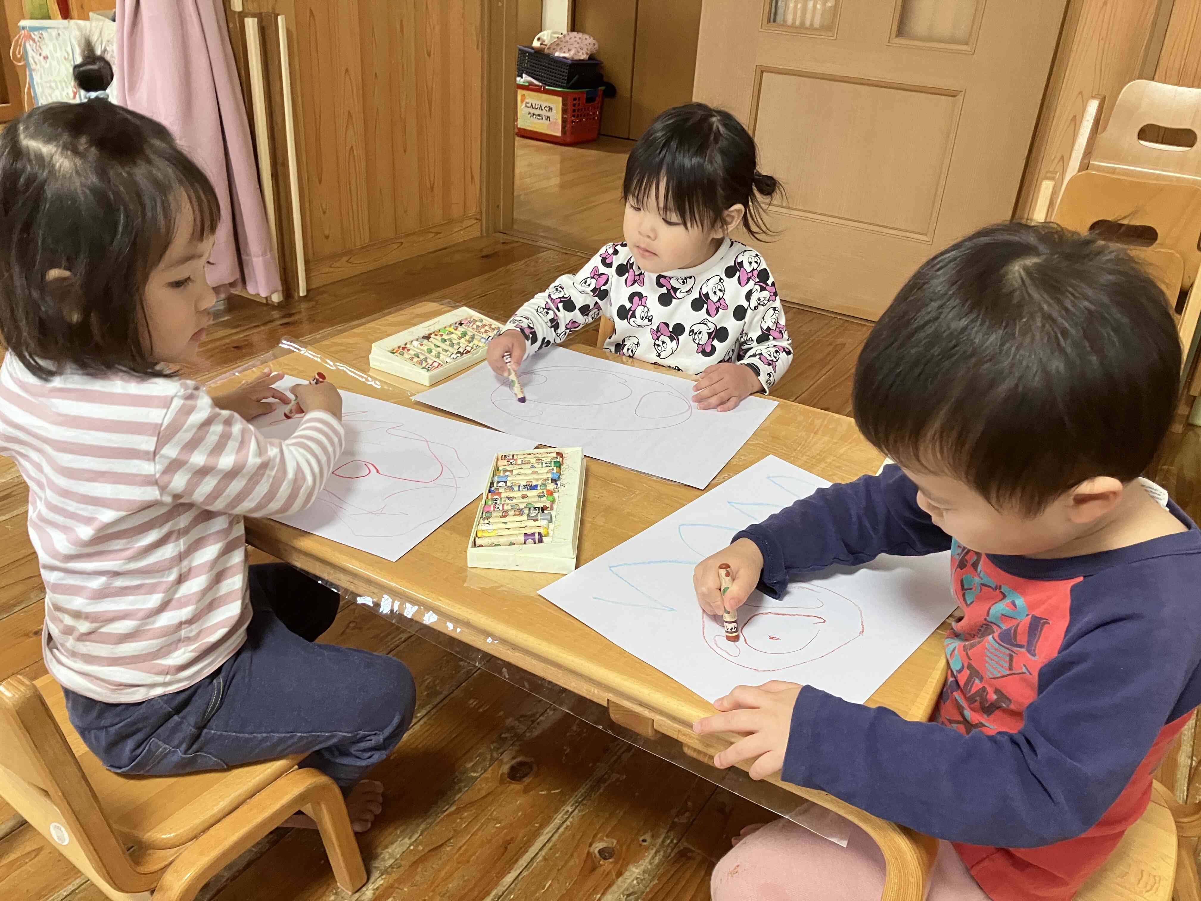 2歳児さんはクレヨンでお絵描き♪乗り物やお友達の顔などおしゃべりしながらたくさん描きました。