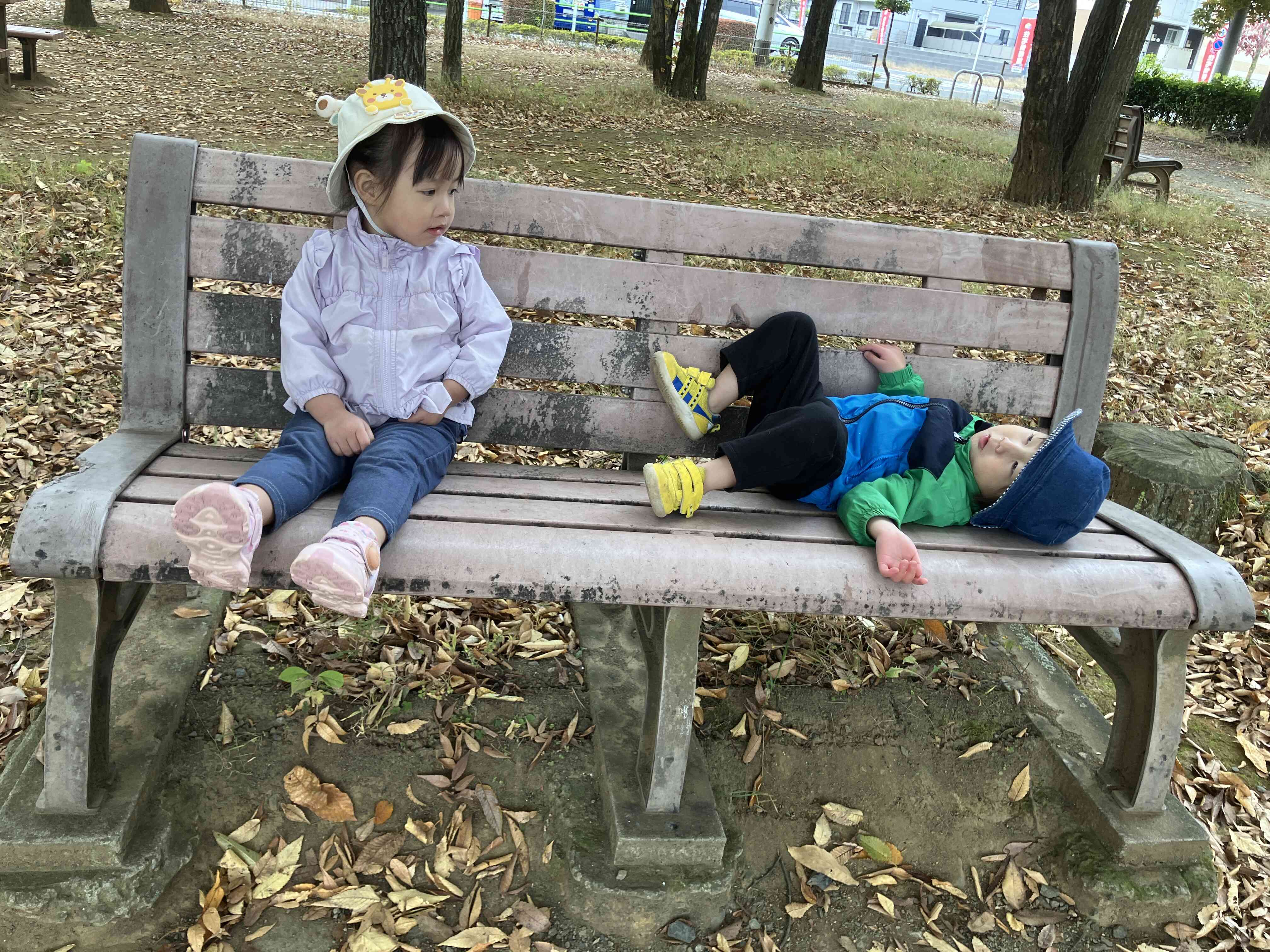 たくさん遊んでベンチで休憩♪ゴロンと空を見上げると色とりどりの葉っぱが見えました。