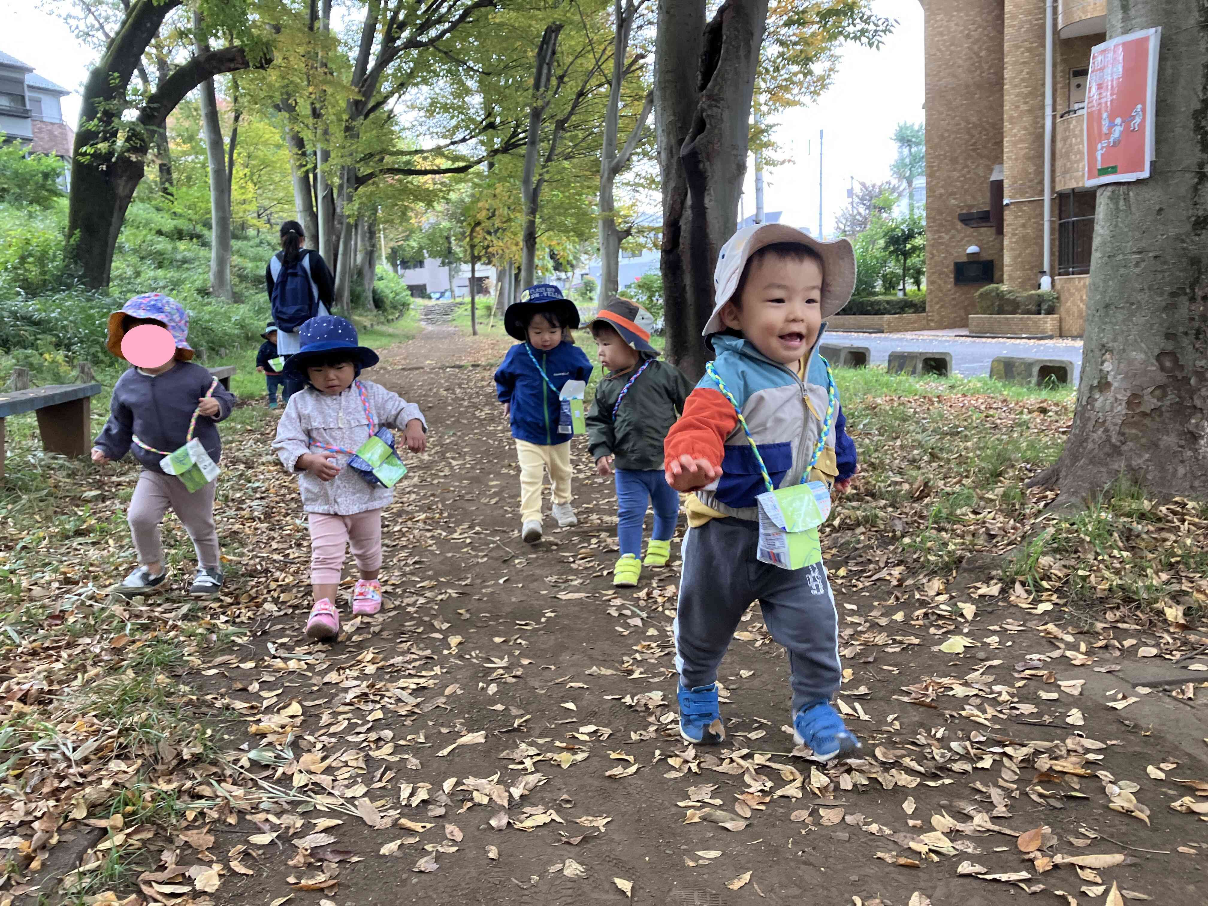 1歳児さんは手作りバックを持ってお散歩へ!
