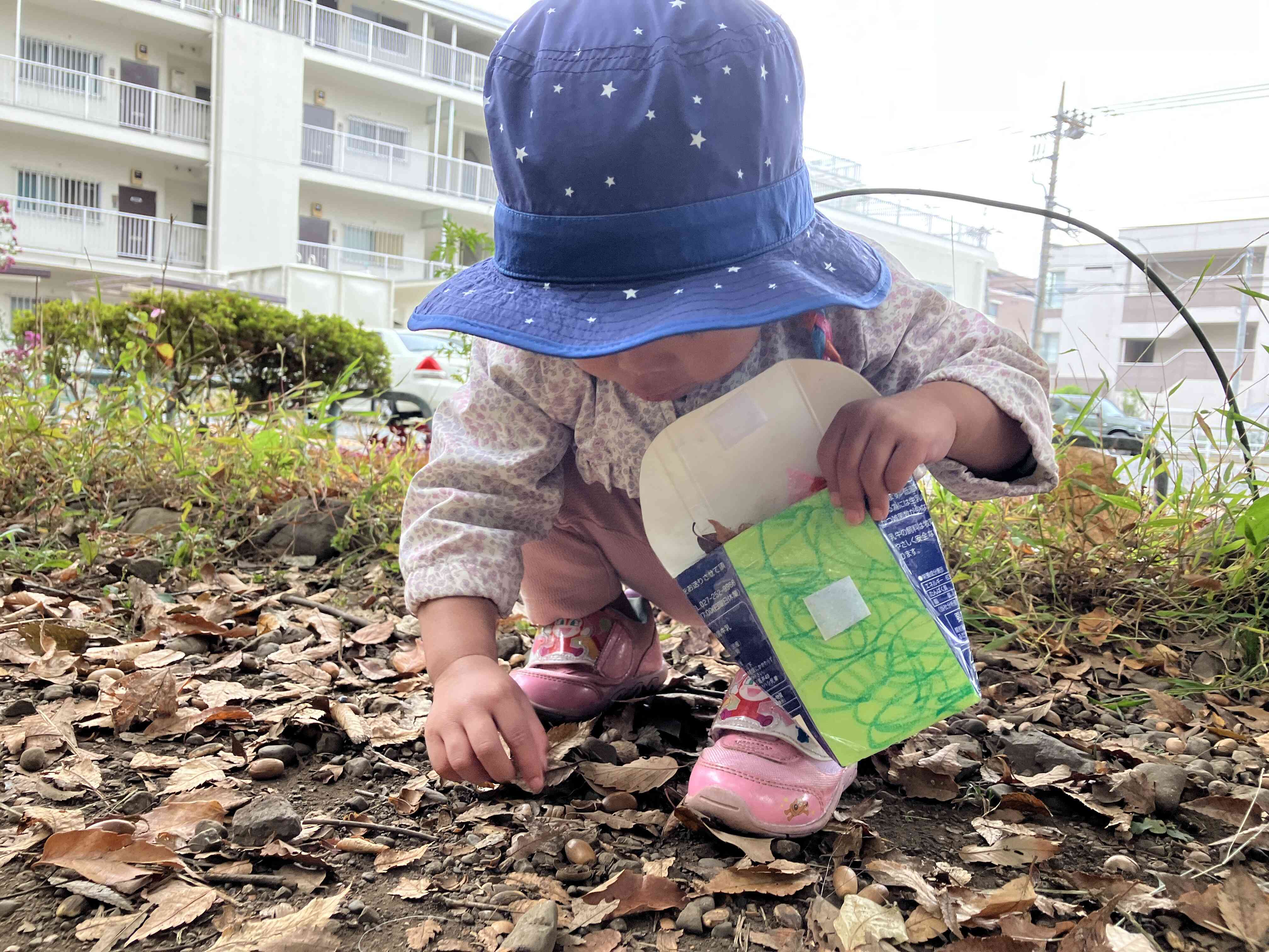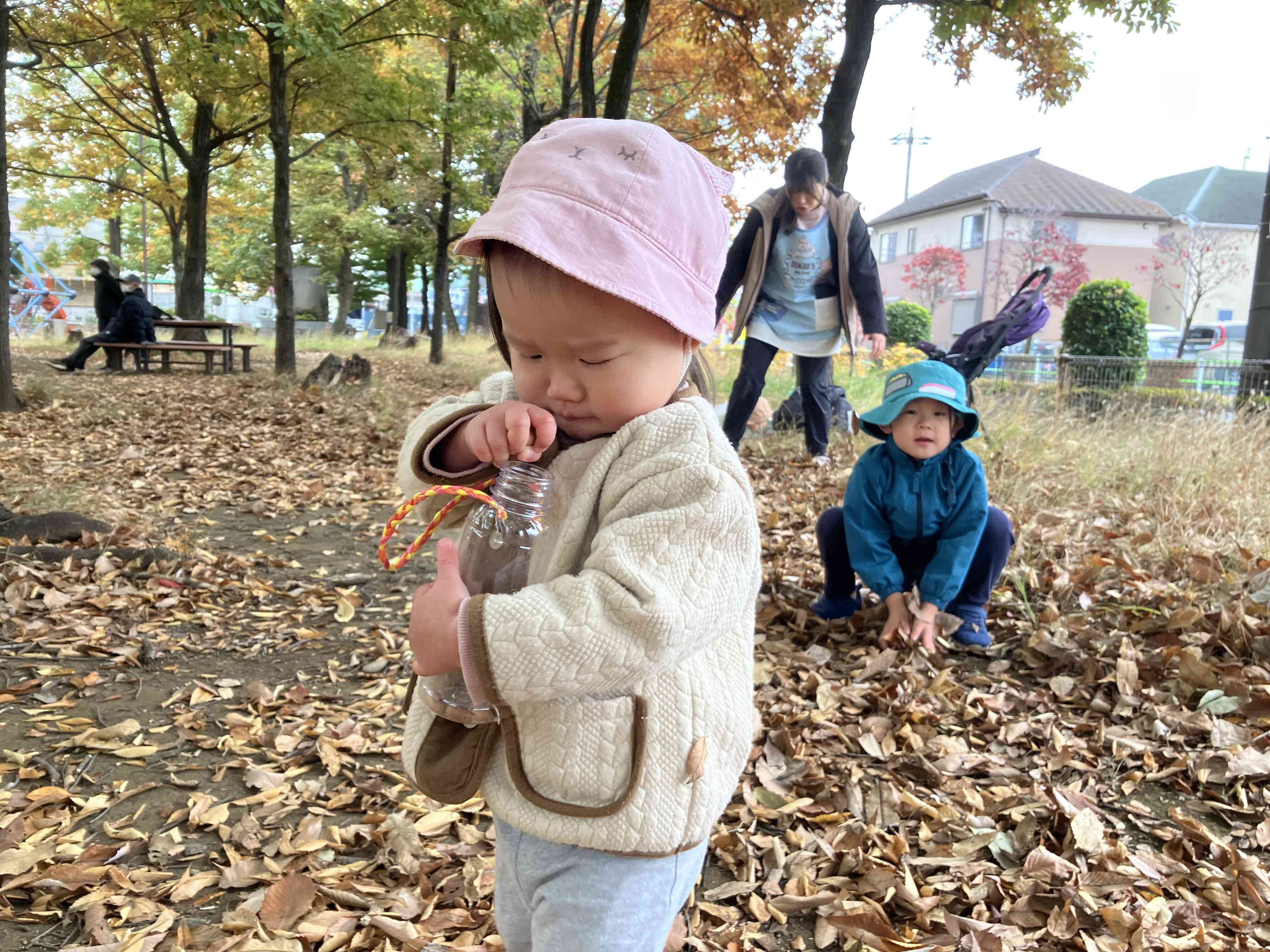 公園ではどんぐり拾いに夢中。ボトルに入れようと必死な表情もかわいい0歳児さんです。