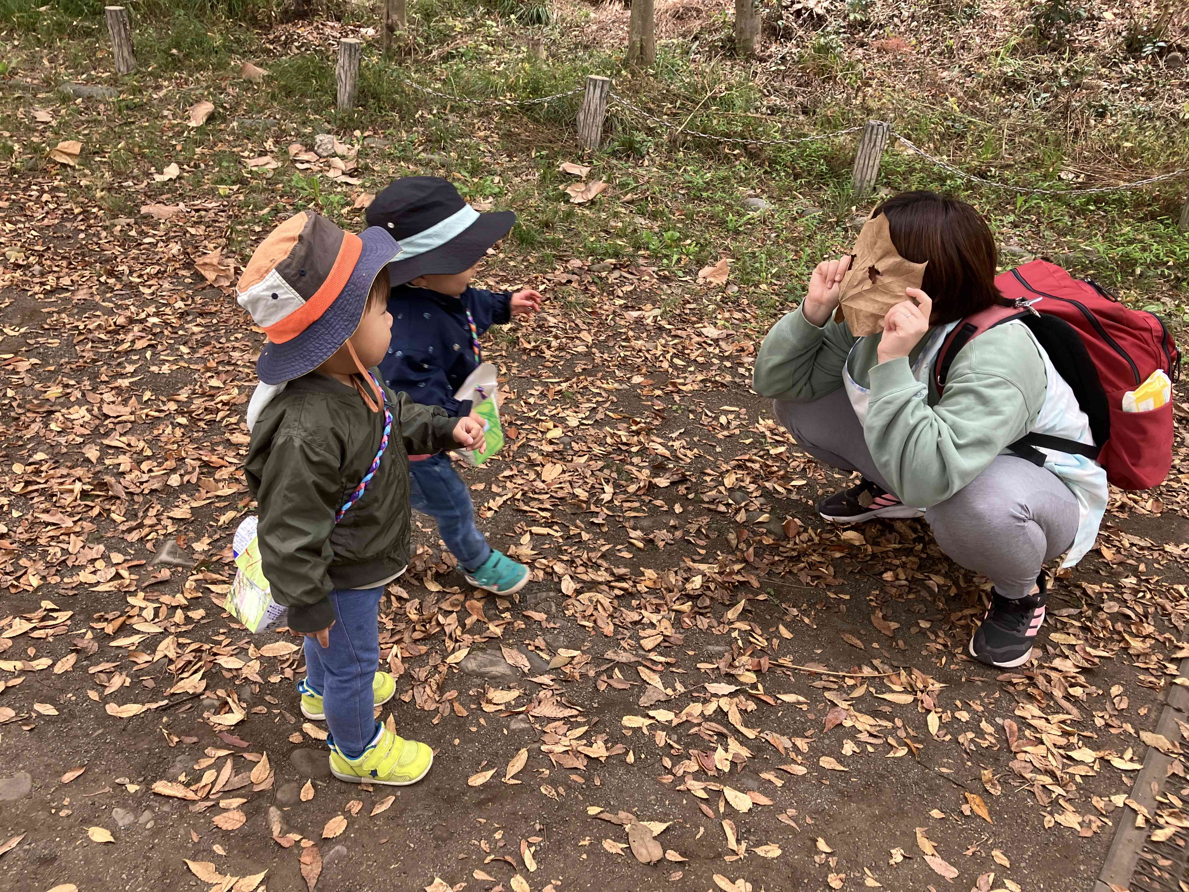 「わぁ!葉っぱのおばけだ!」と驚く2人。先生だとわかるとニコニコ嬉しそうにしていました。
