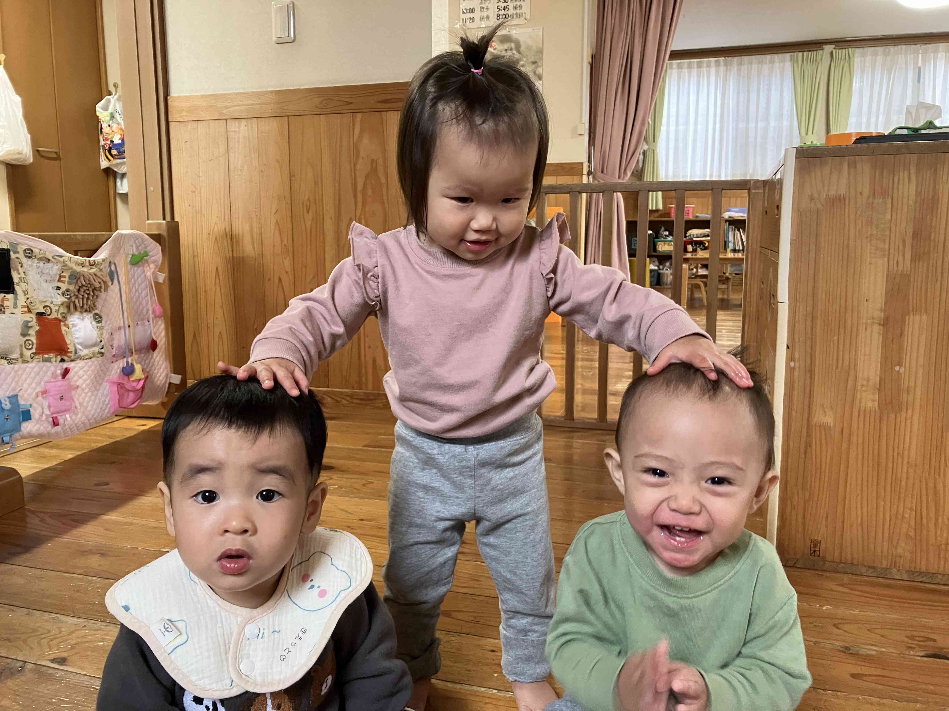 0歳児さんはしあわせなら頭いい子いい子しよう♬と先生が歌うと、お友だちの頭をなでなで。