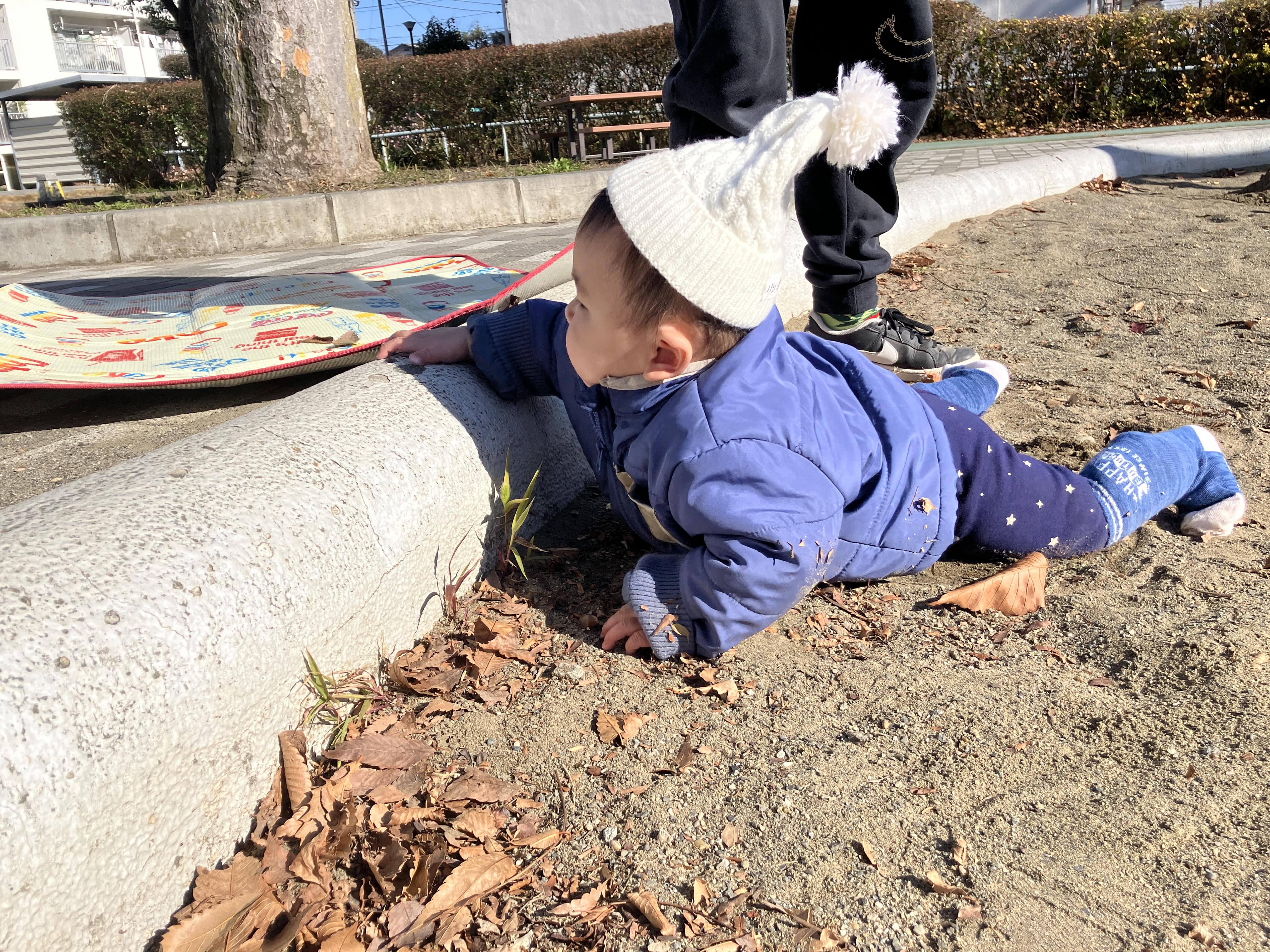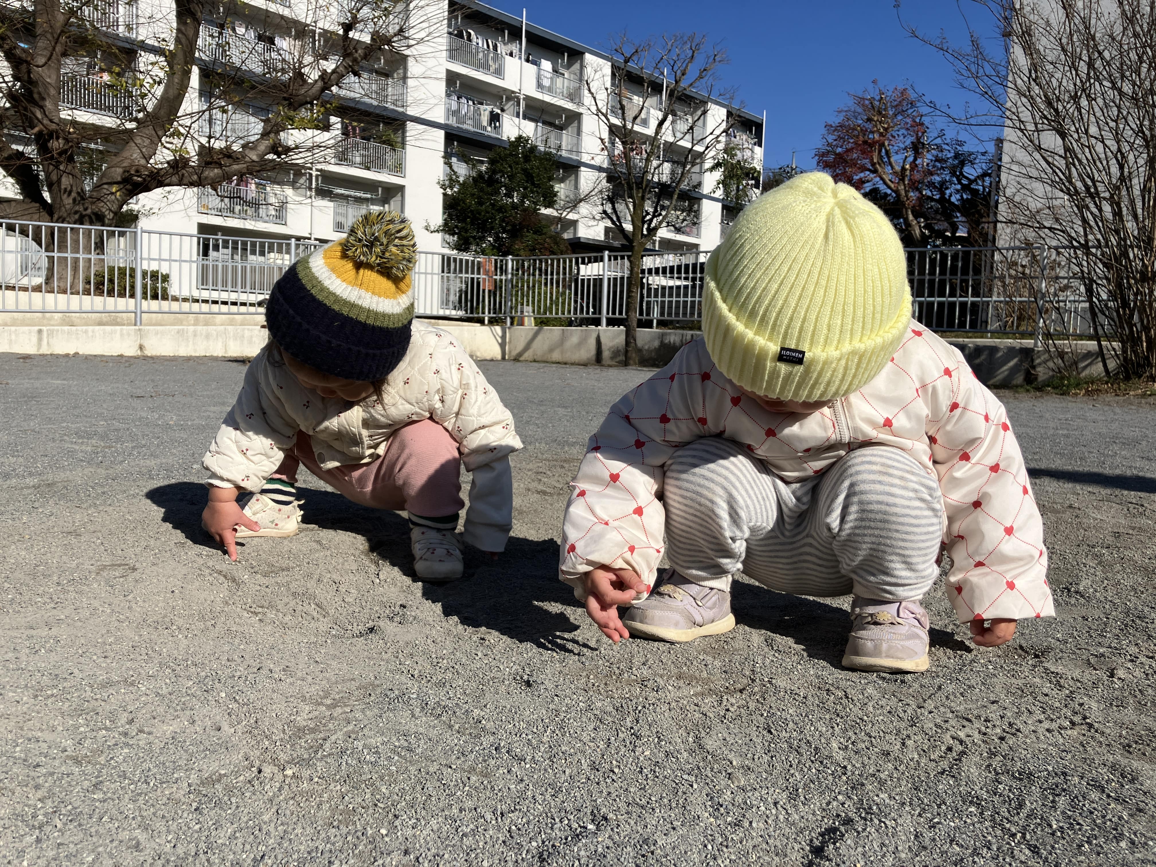• 0歳児さんは公園にお散歩♬ 砂に線を描くのが楽しいようで、2人で同じ姿勢で夢中です😊