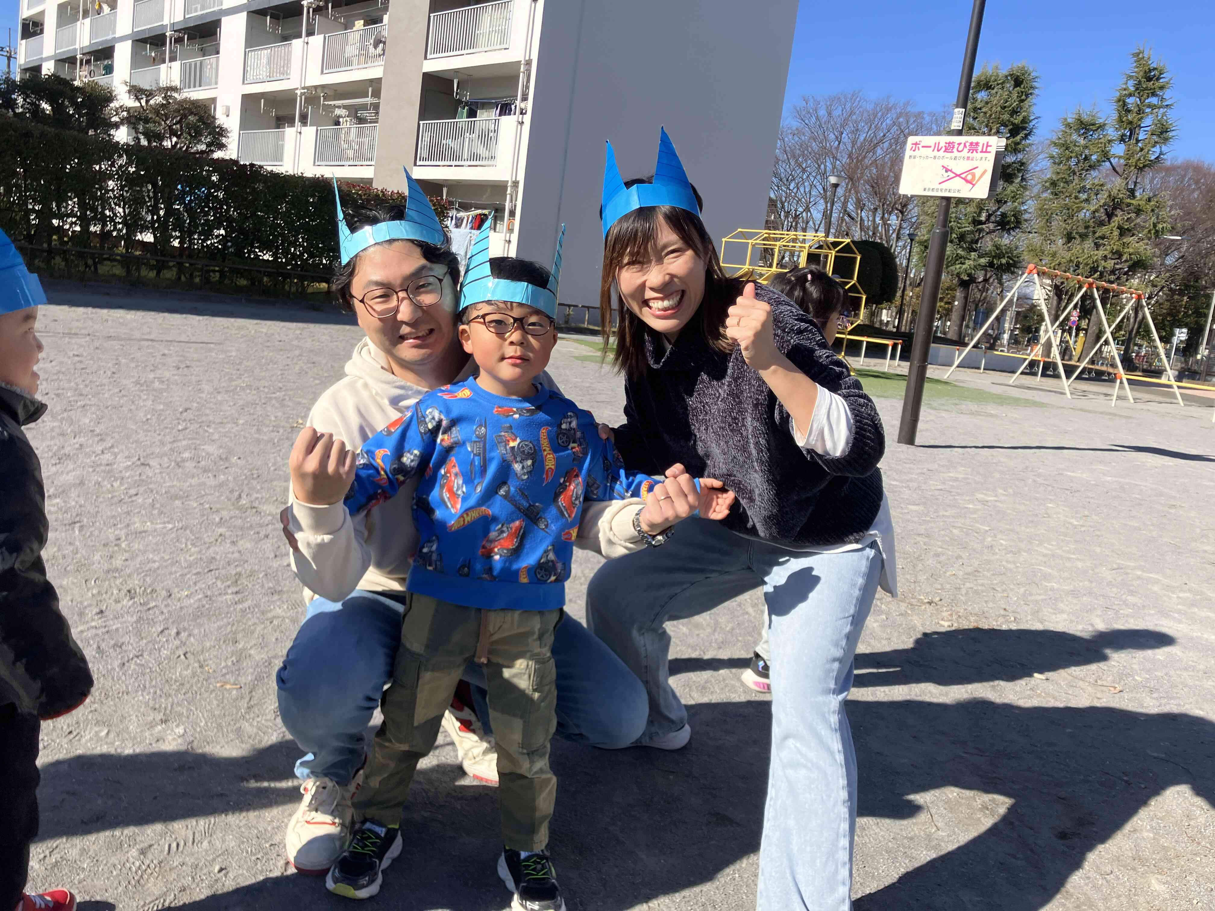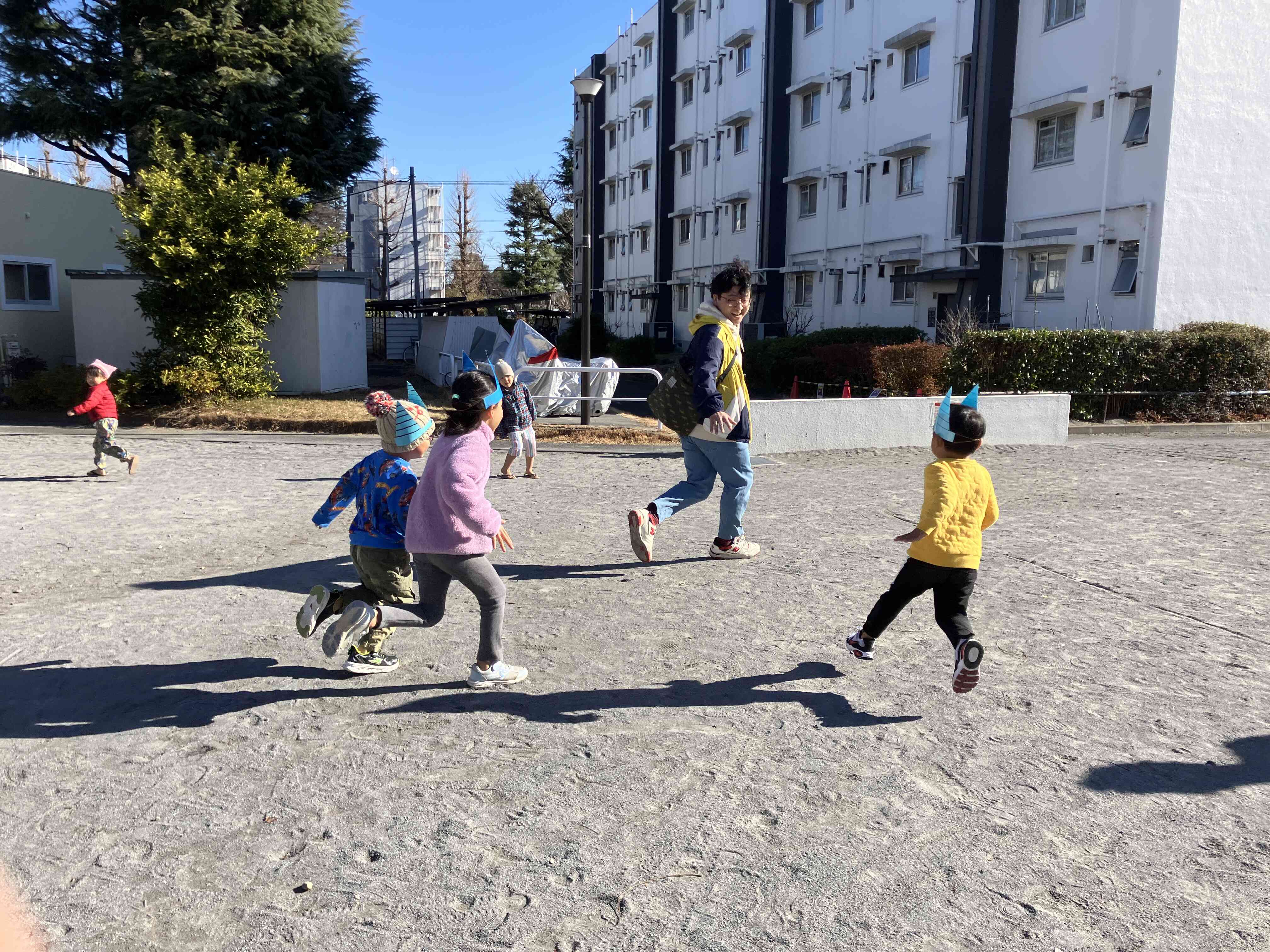 幼児組は公園で氷鬼をしました。お父さんを捕まえるぞー!!