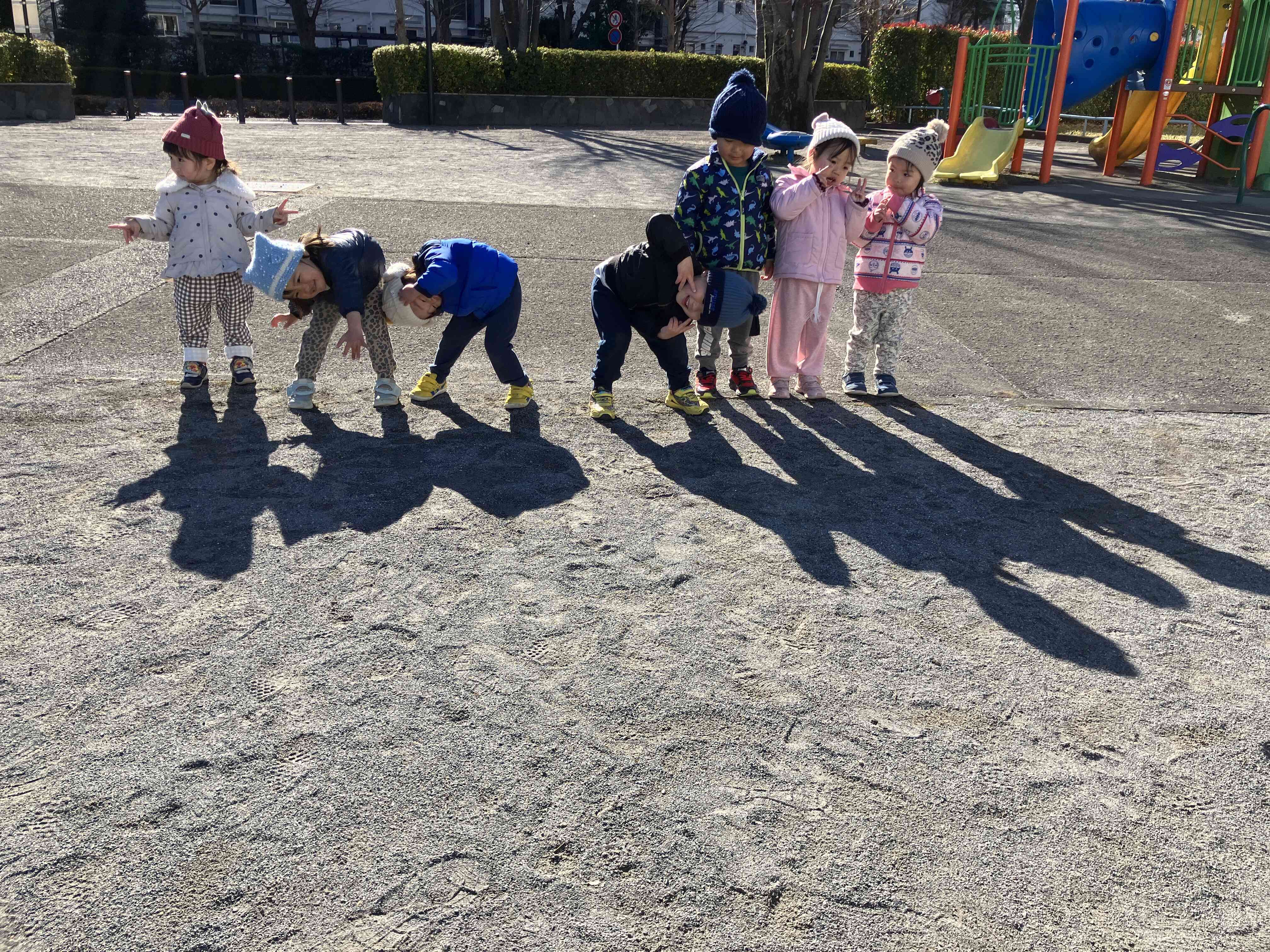 自分達の影を見つけた2歳児さん。真似っこしてるね♬