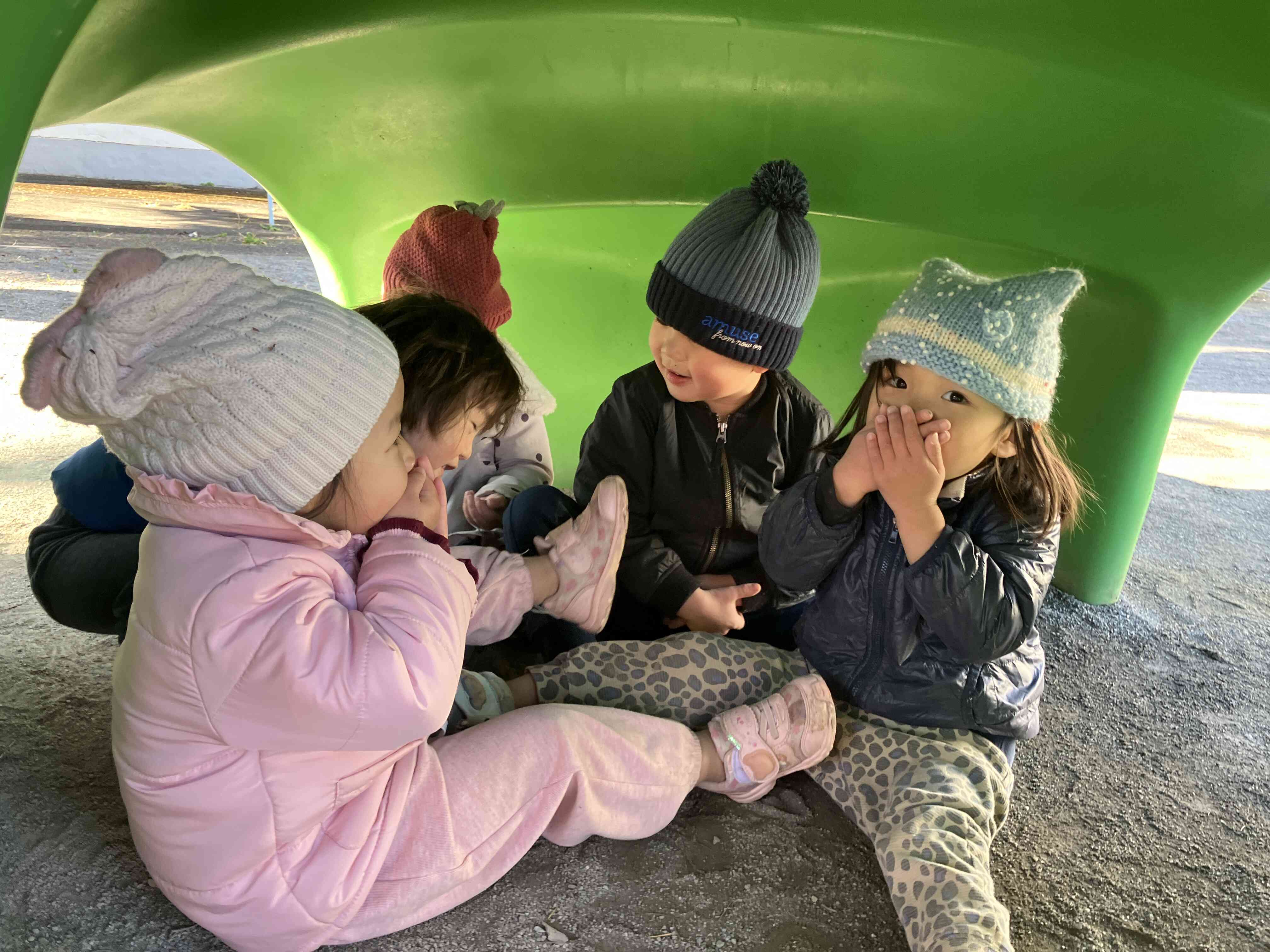 遊具の下がお家になり「オオカミと7匹の子ヤギ」ごっこがはじまりました。「しー!オオカミにみつかっちゃう!」