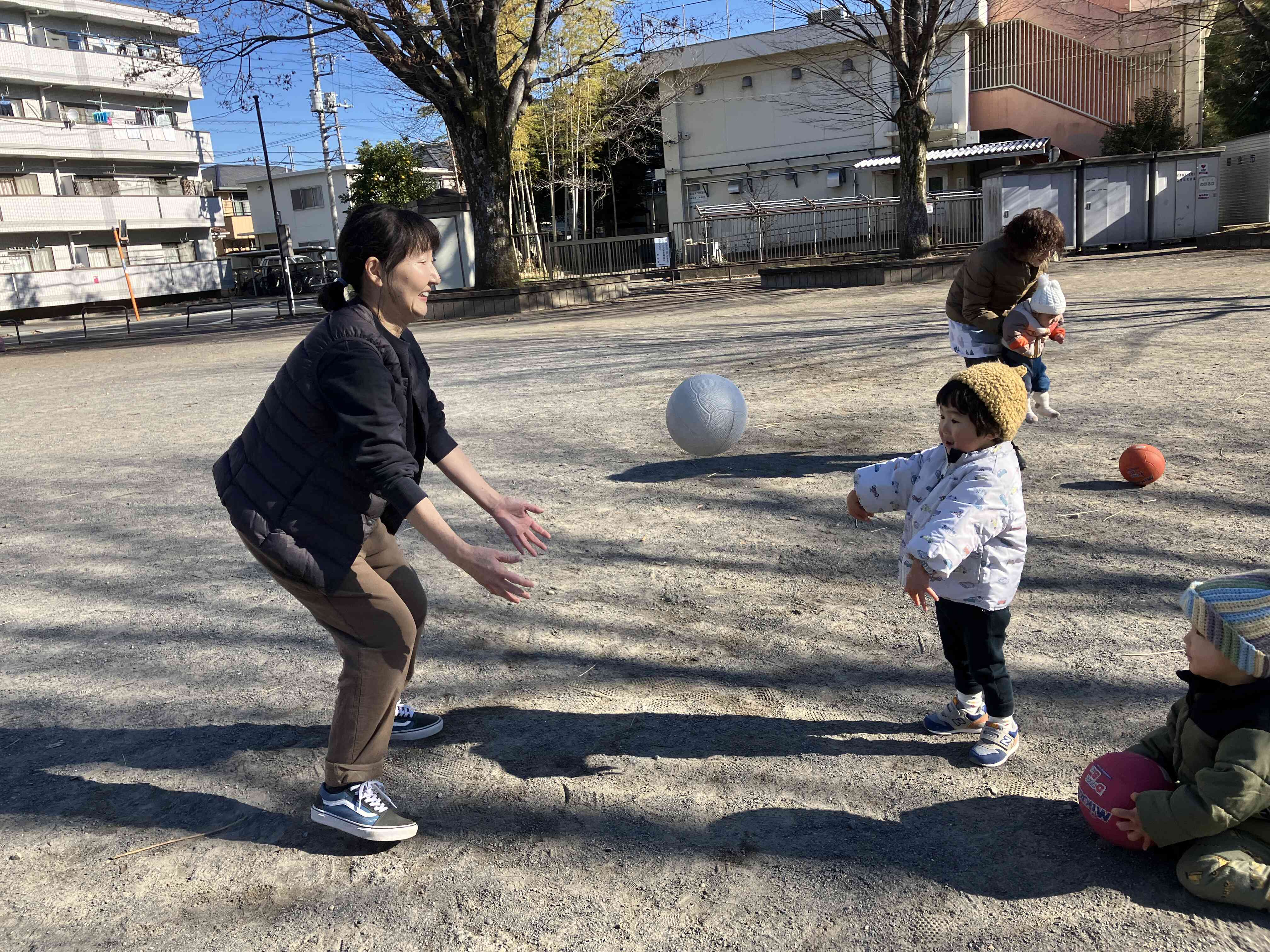 先生とボールをポーン!投げたり蹴ったり転がしたりしました。