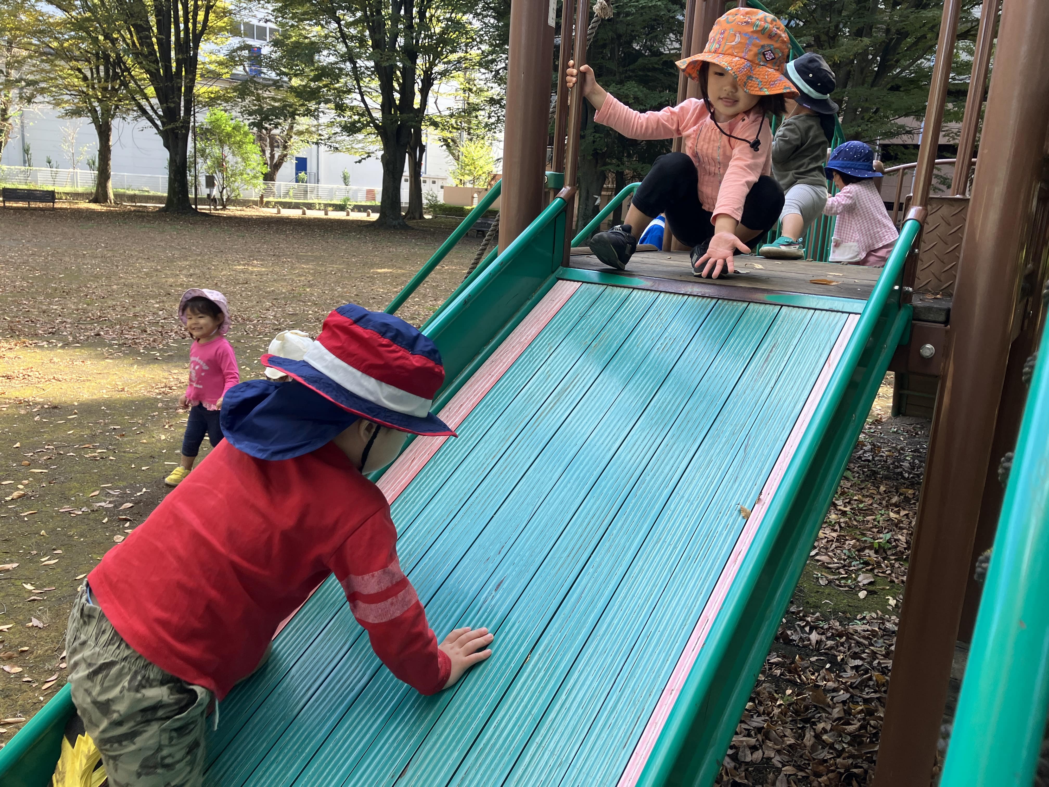 頑張って滑り台を登る友達を助けてあげようとしている様子です♬