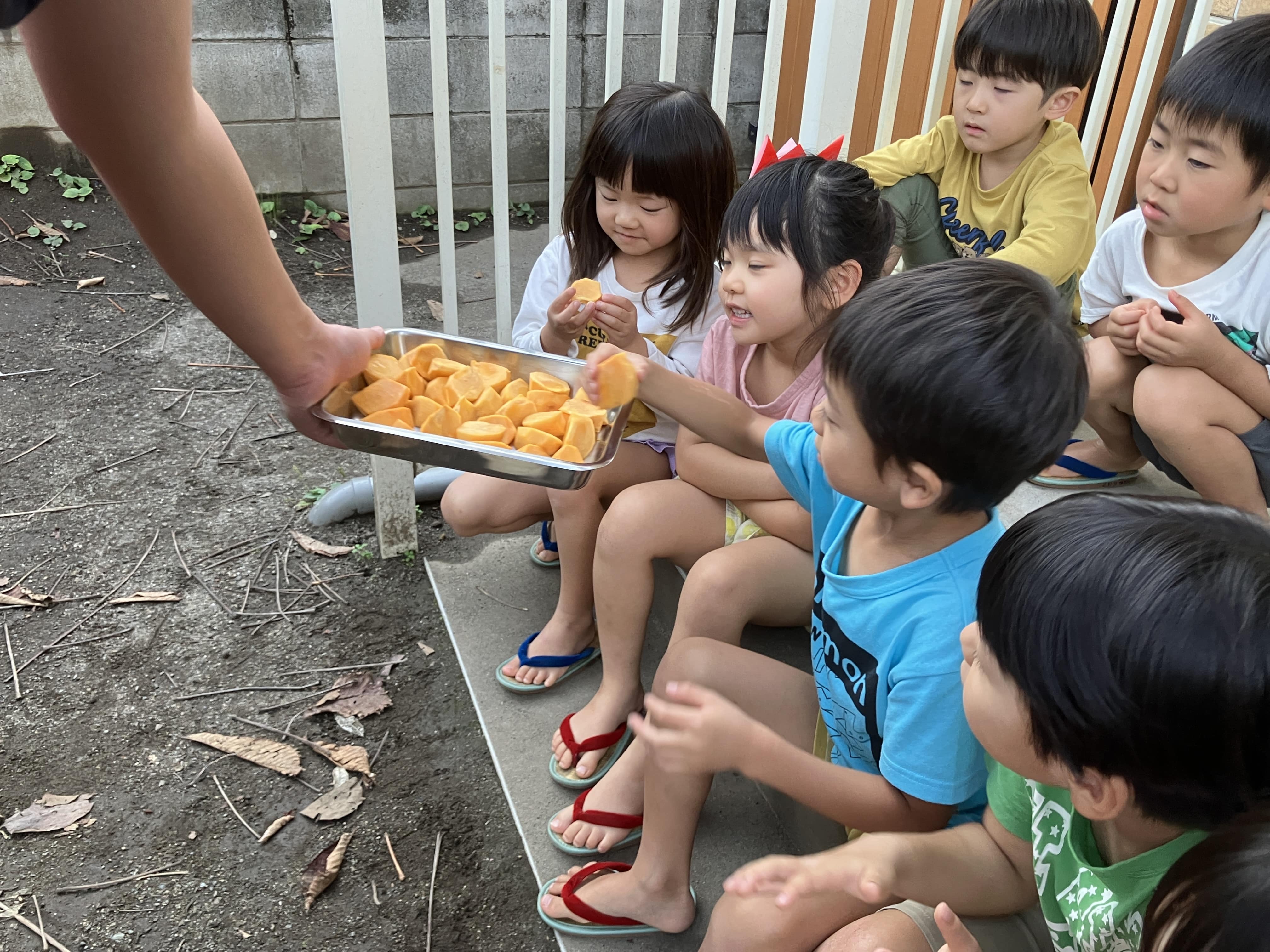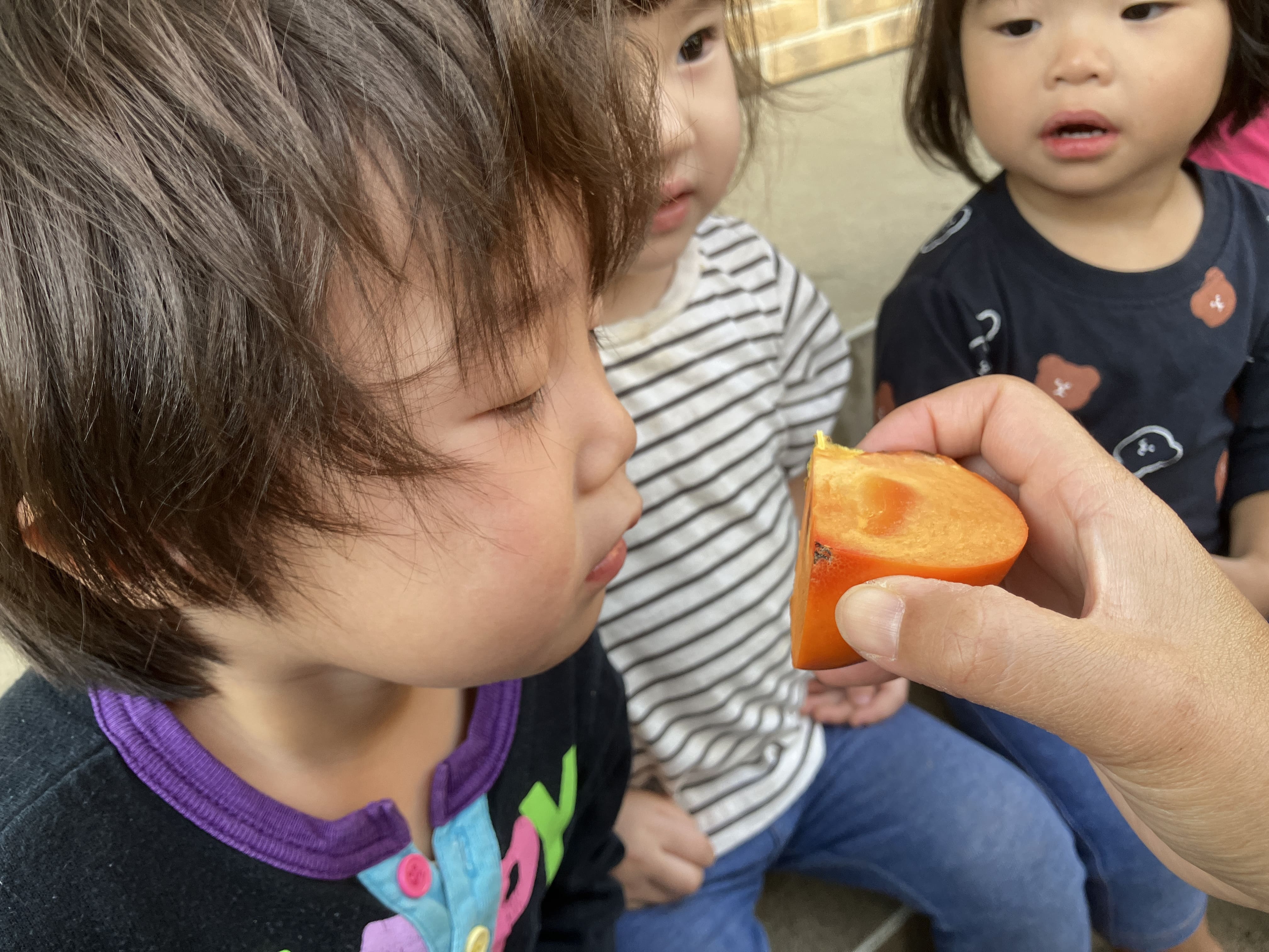夕方には園庭の柿を採って試食会をしました♬ 「いいにおいする!」