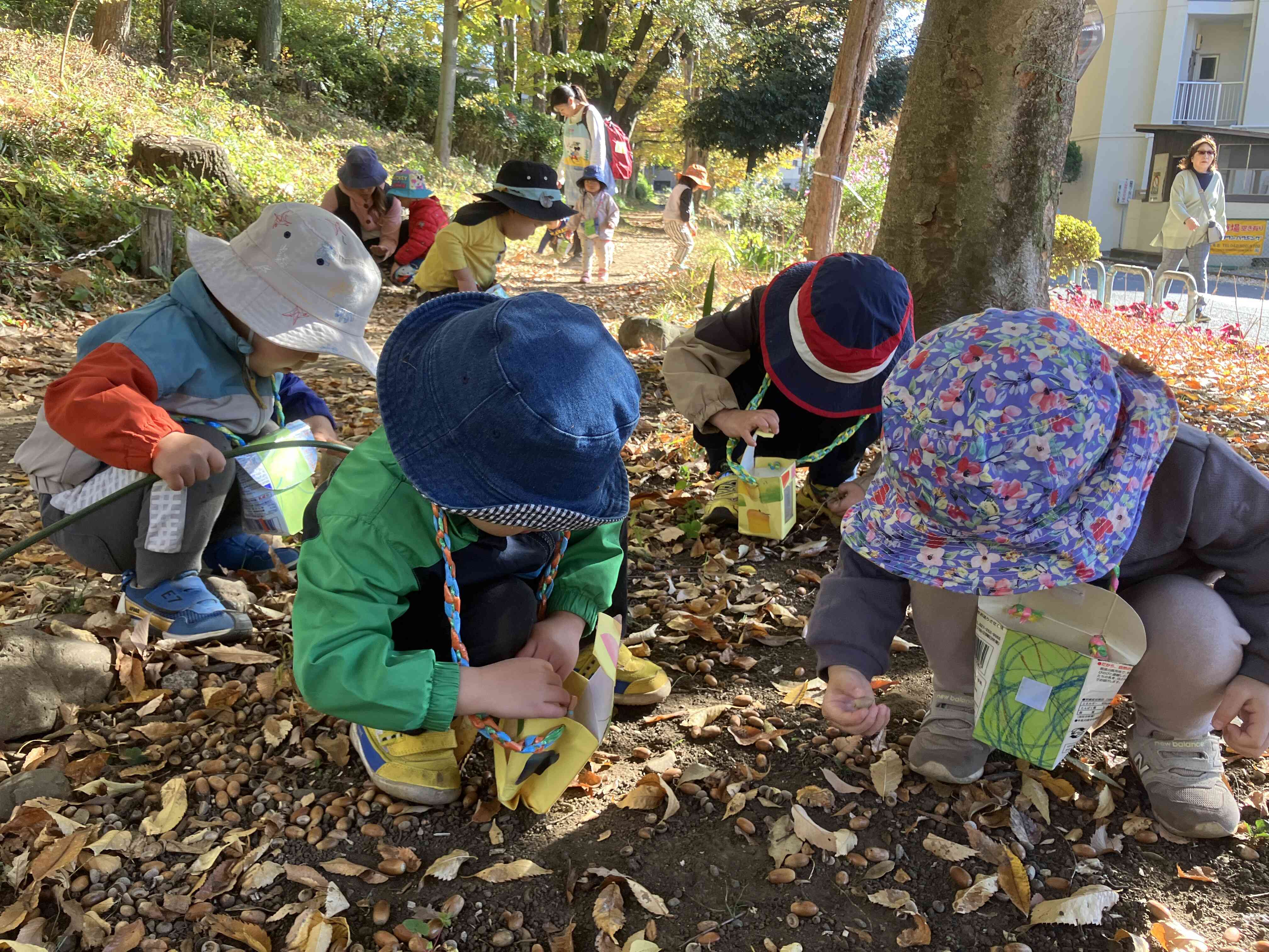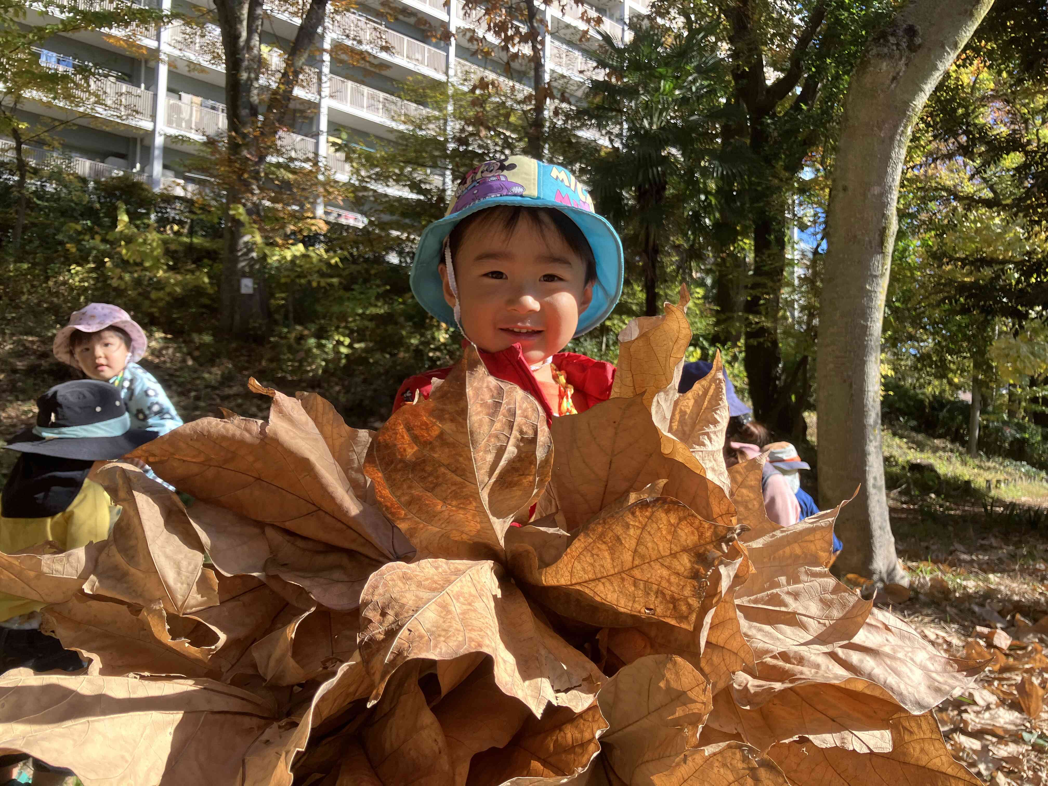 「みて~こんな大きい葉っぱあった~」落ち葉の花束作り。