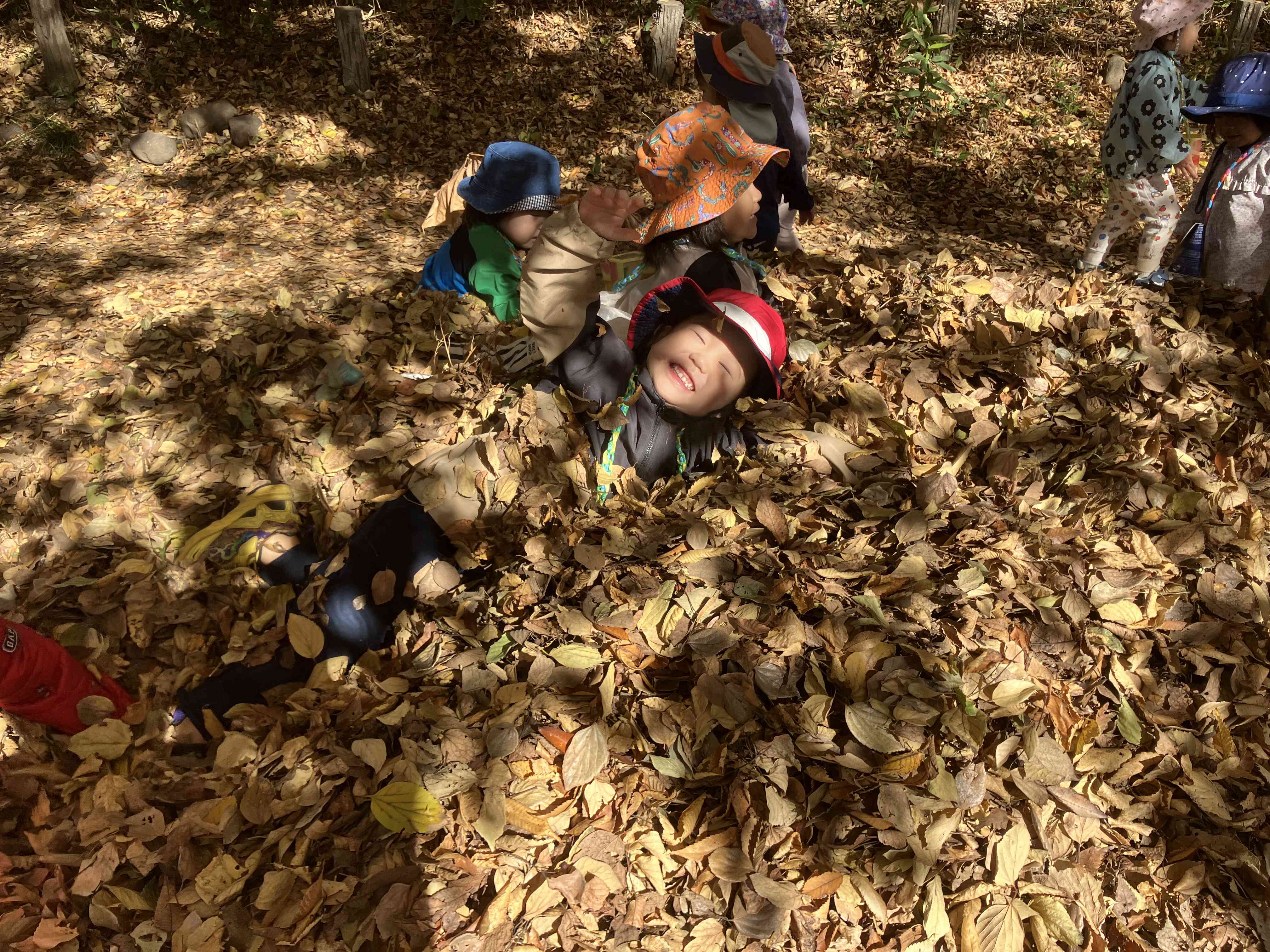 落ち葉のベッドでぬくぬく「あったかいよー」