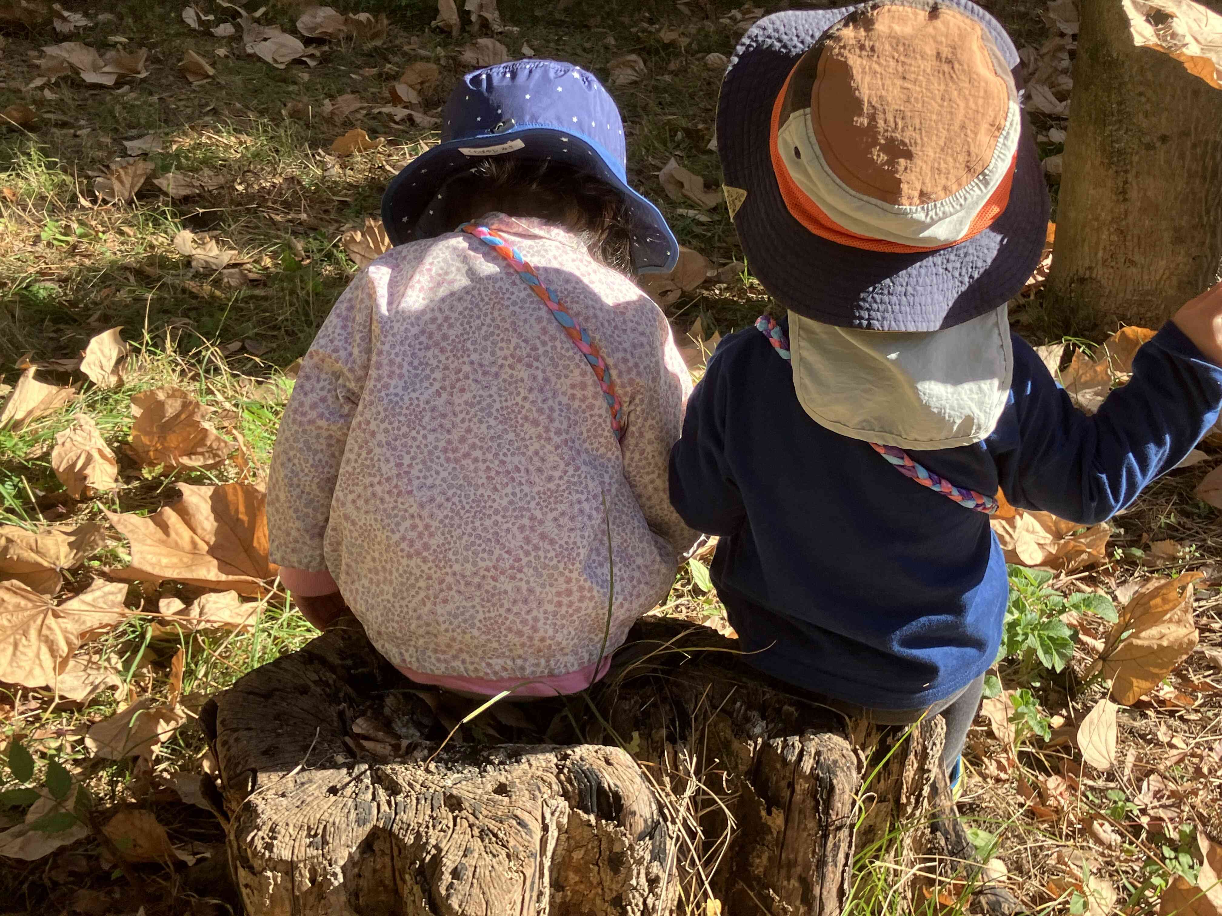切り株ベンチでポカポカ、可愛い背中姿にほっこり。