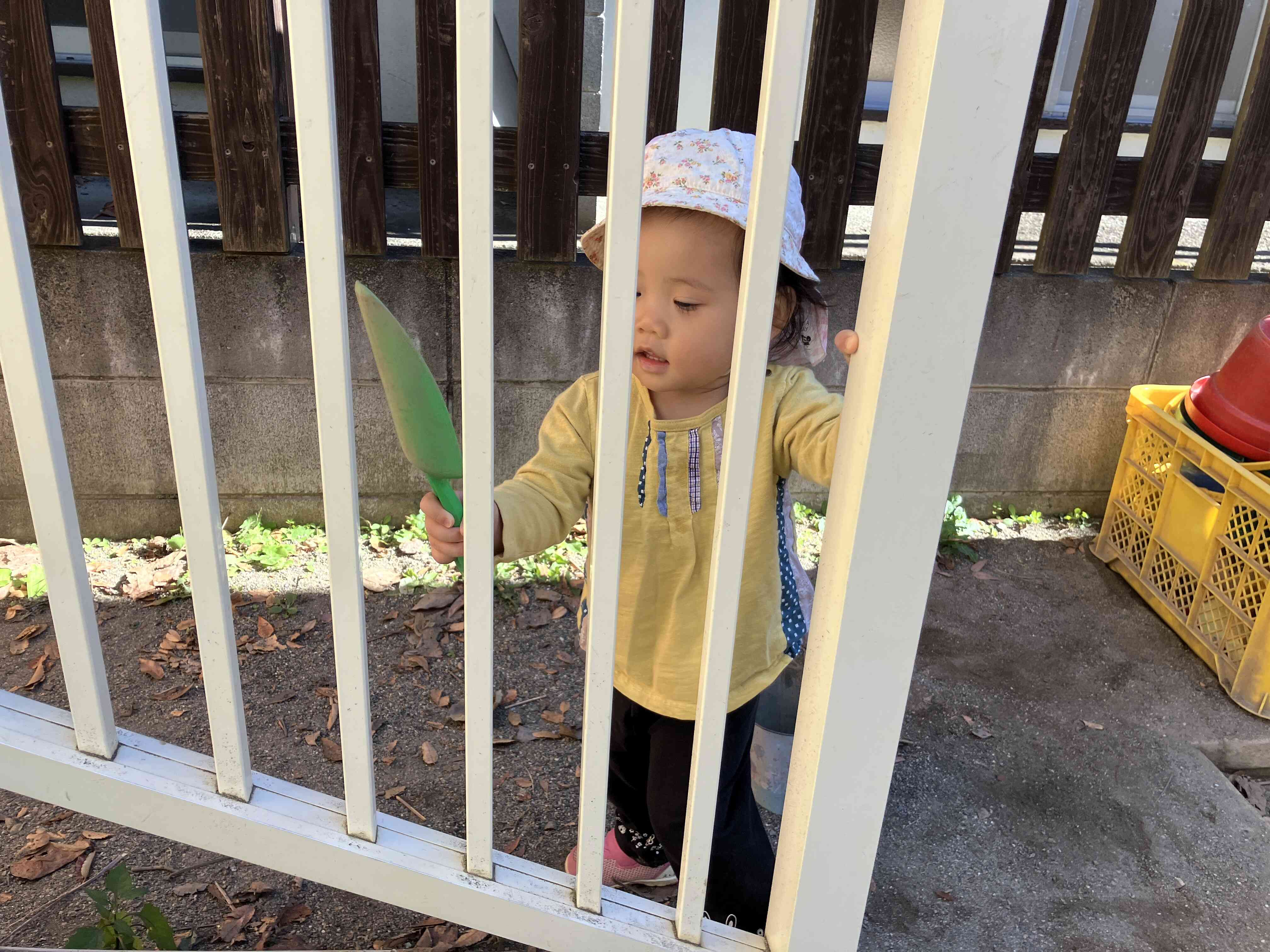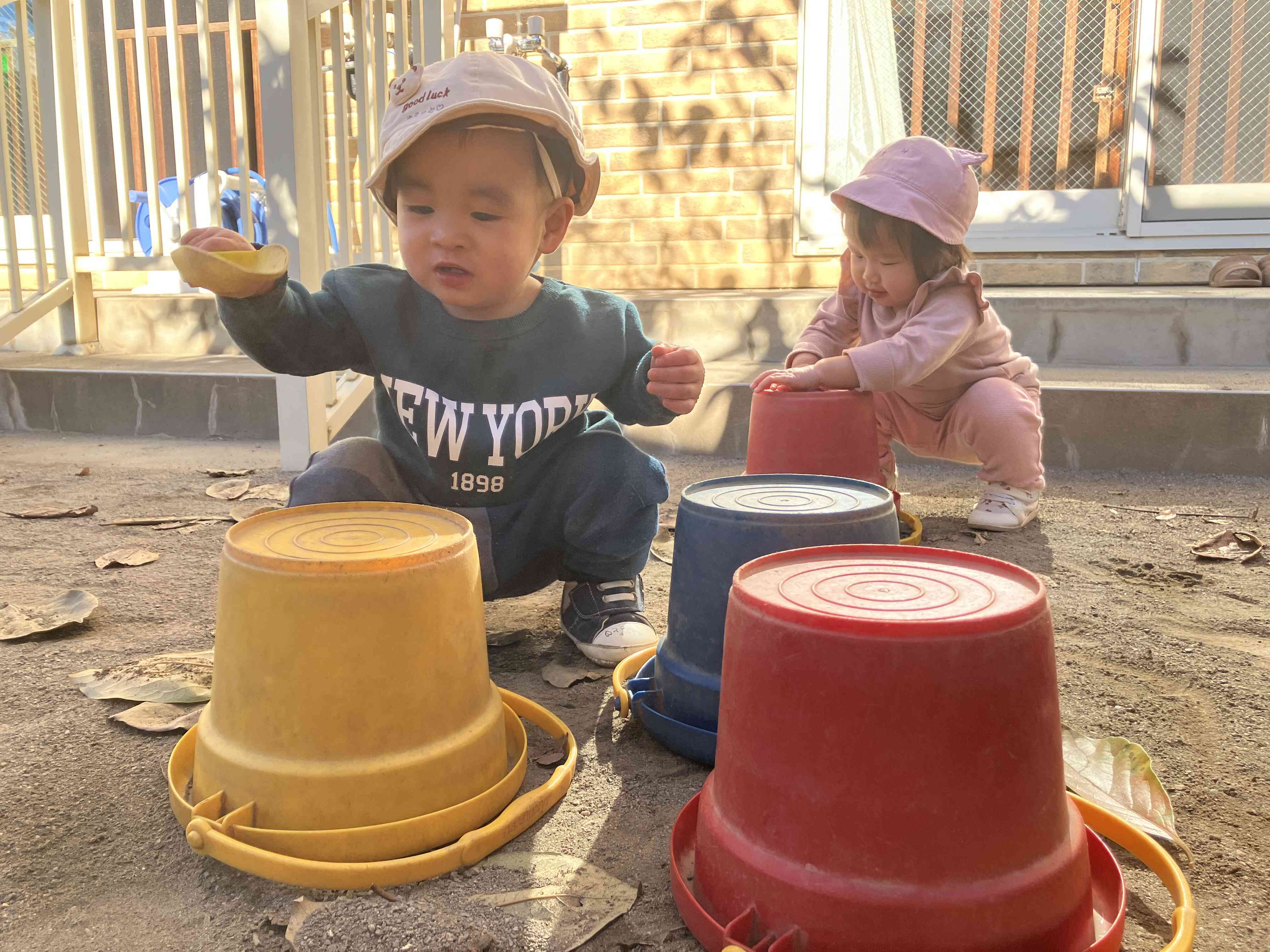 0歳児さんは園庭でのんびり。バケツを太鼓にトントントン♪
