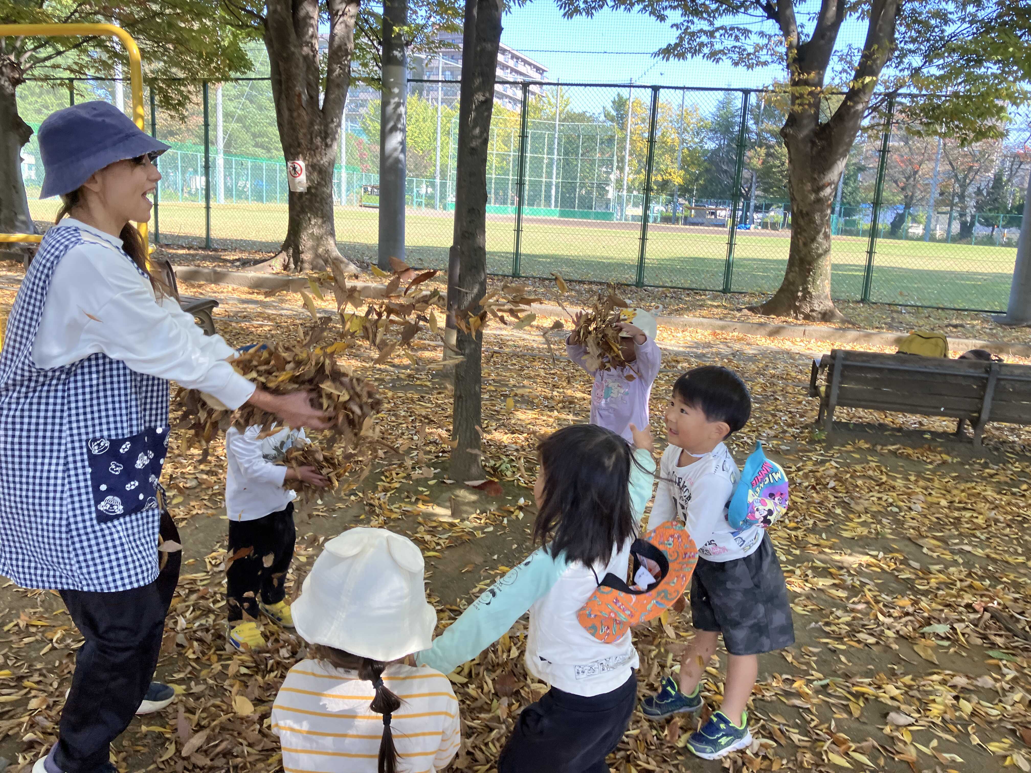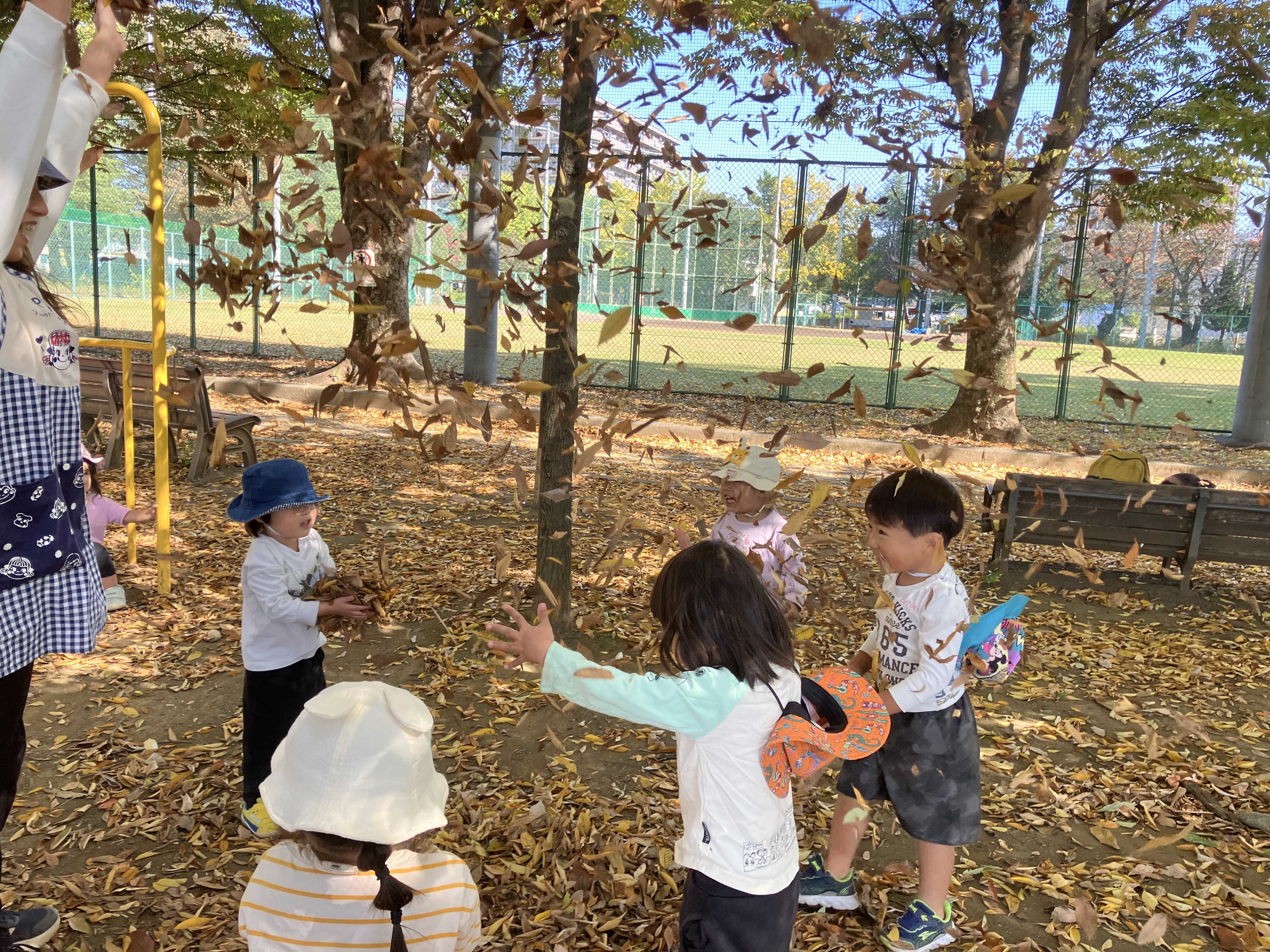 「3!!!」落ち葉の雨に大喜びの2歳児さんでした。