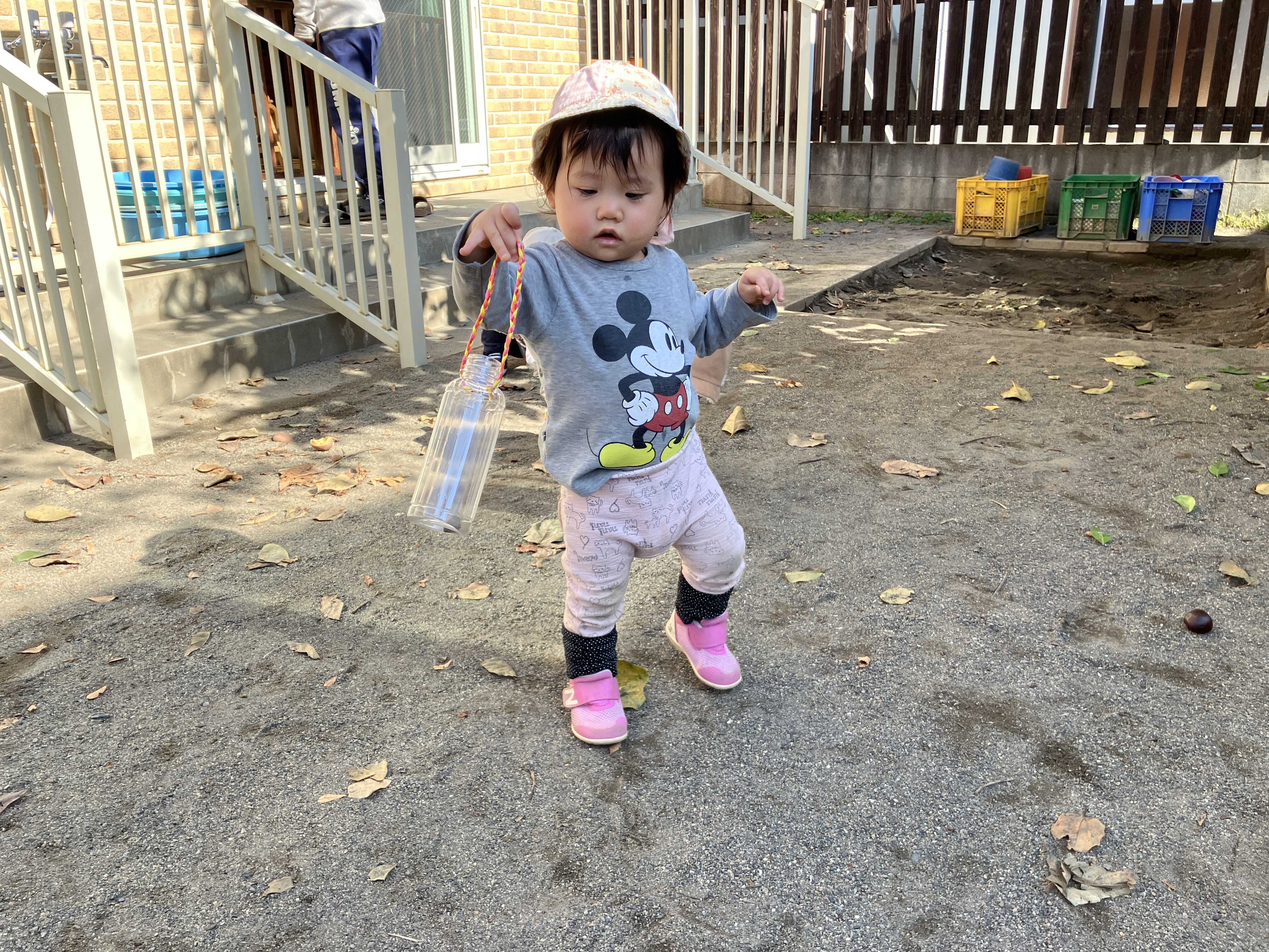 0歳児さんはポカポカ温かい園庭で遊びました。ボトルに石を入れるとカラカラいい音!振りながらたくさん歩いていました。