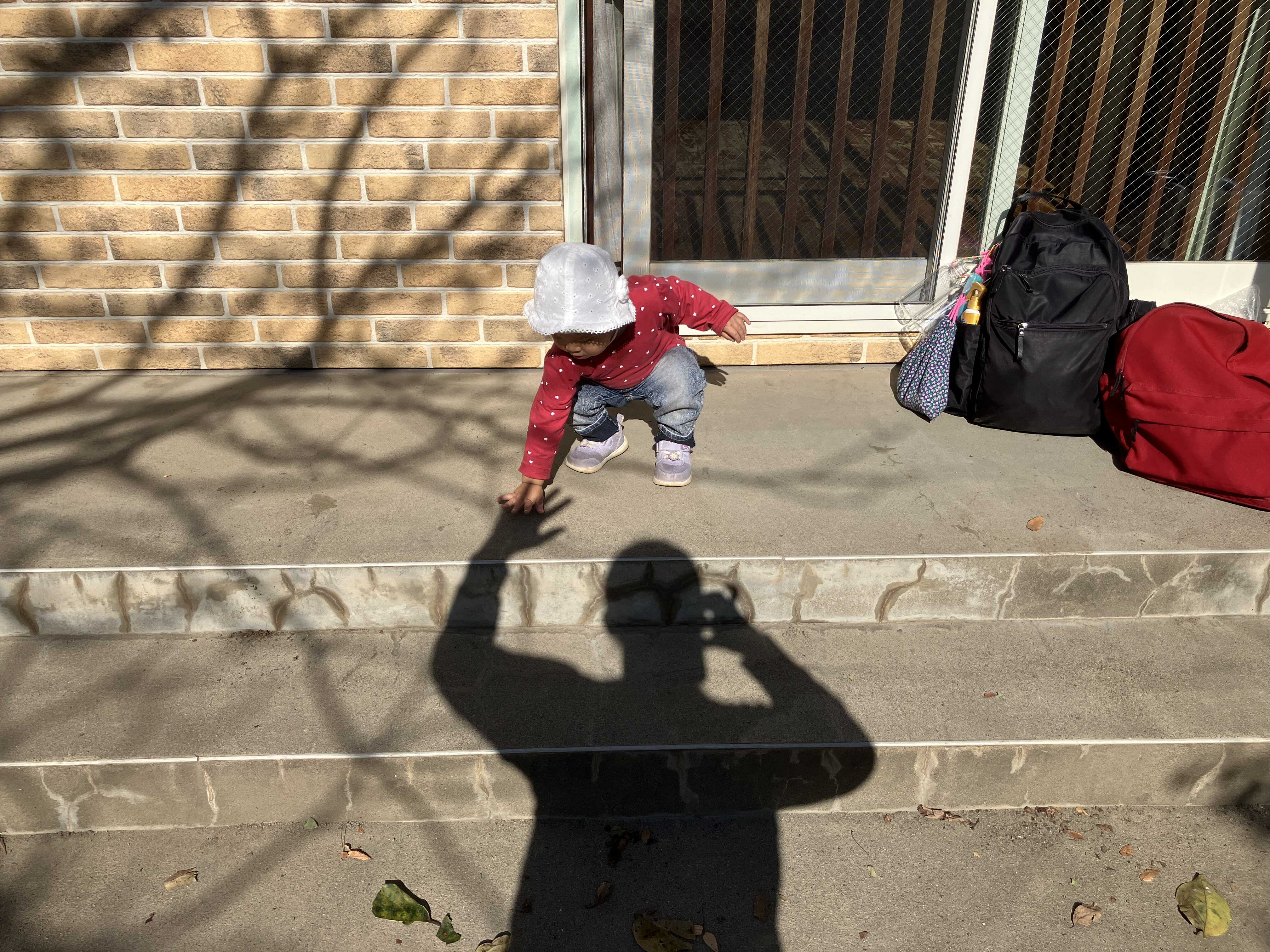 影の手にターッチ!足元を動く影に不思議そうに手を伸ばしていました。