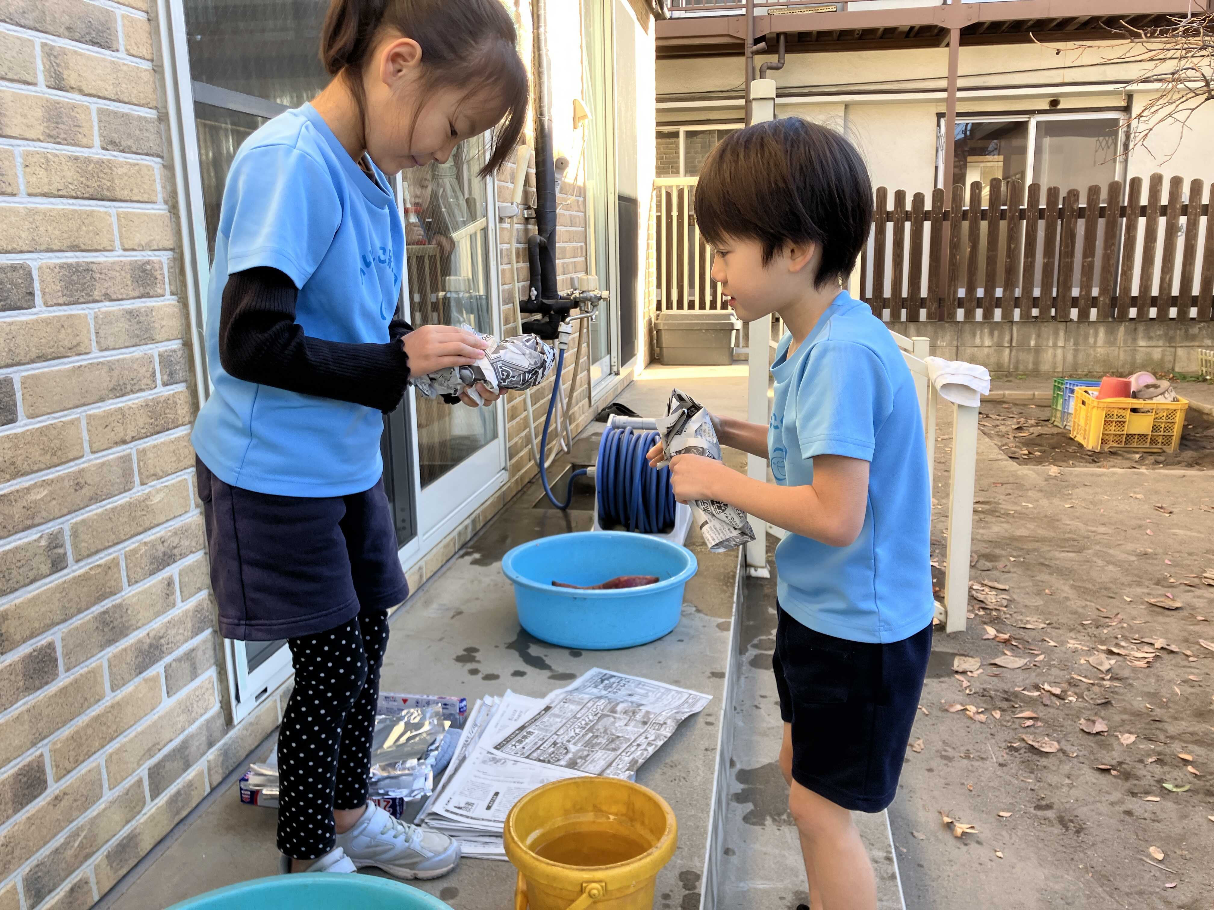 芋ほりのお芋で焼き芋をしました。子ども達で準備中。寒い朝でもやる気満々です♪