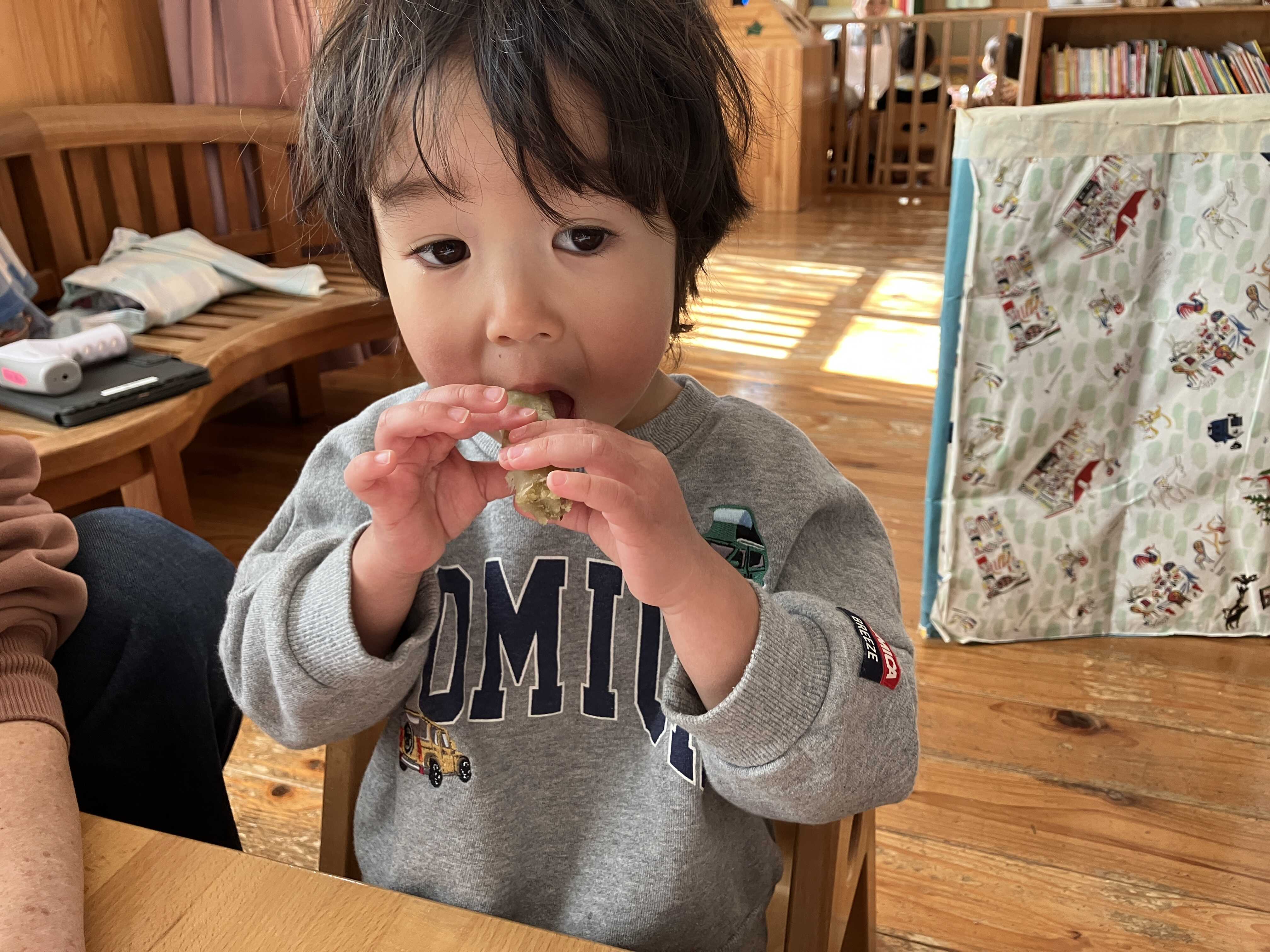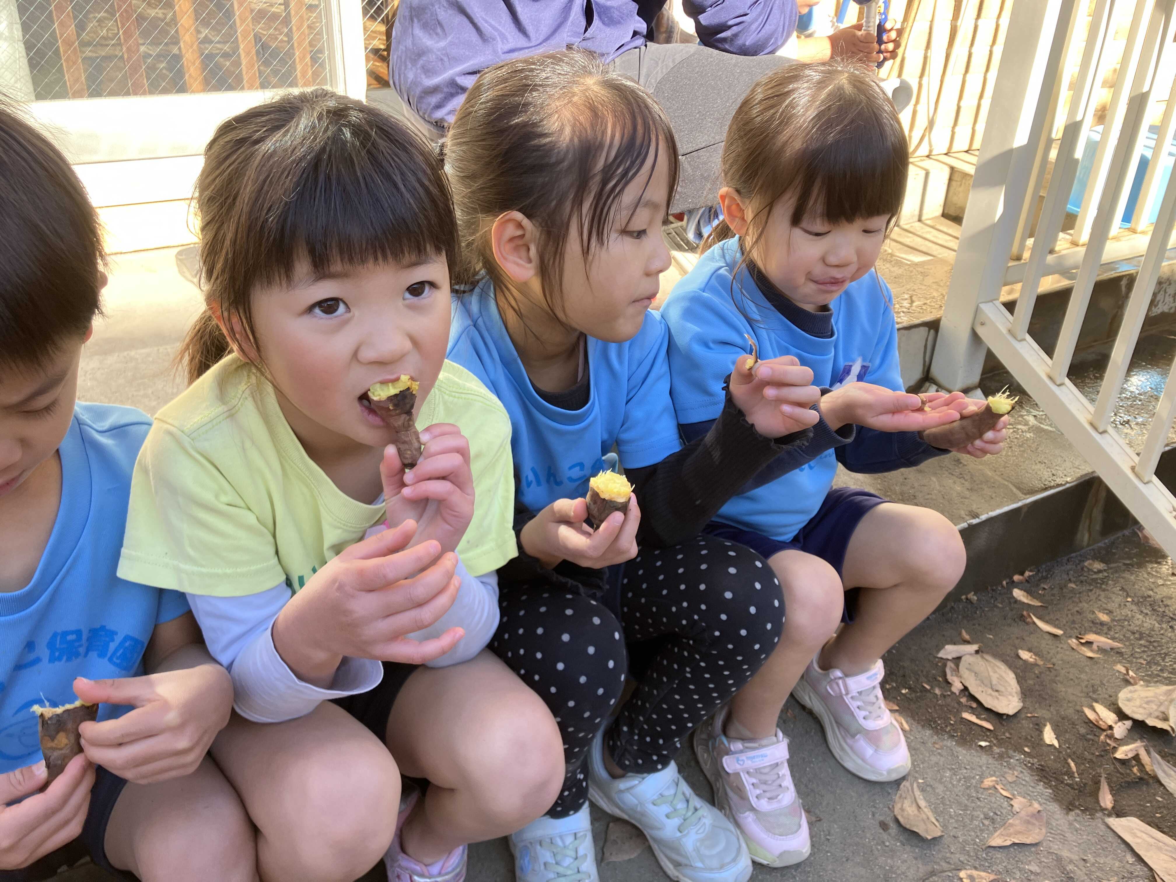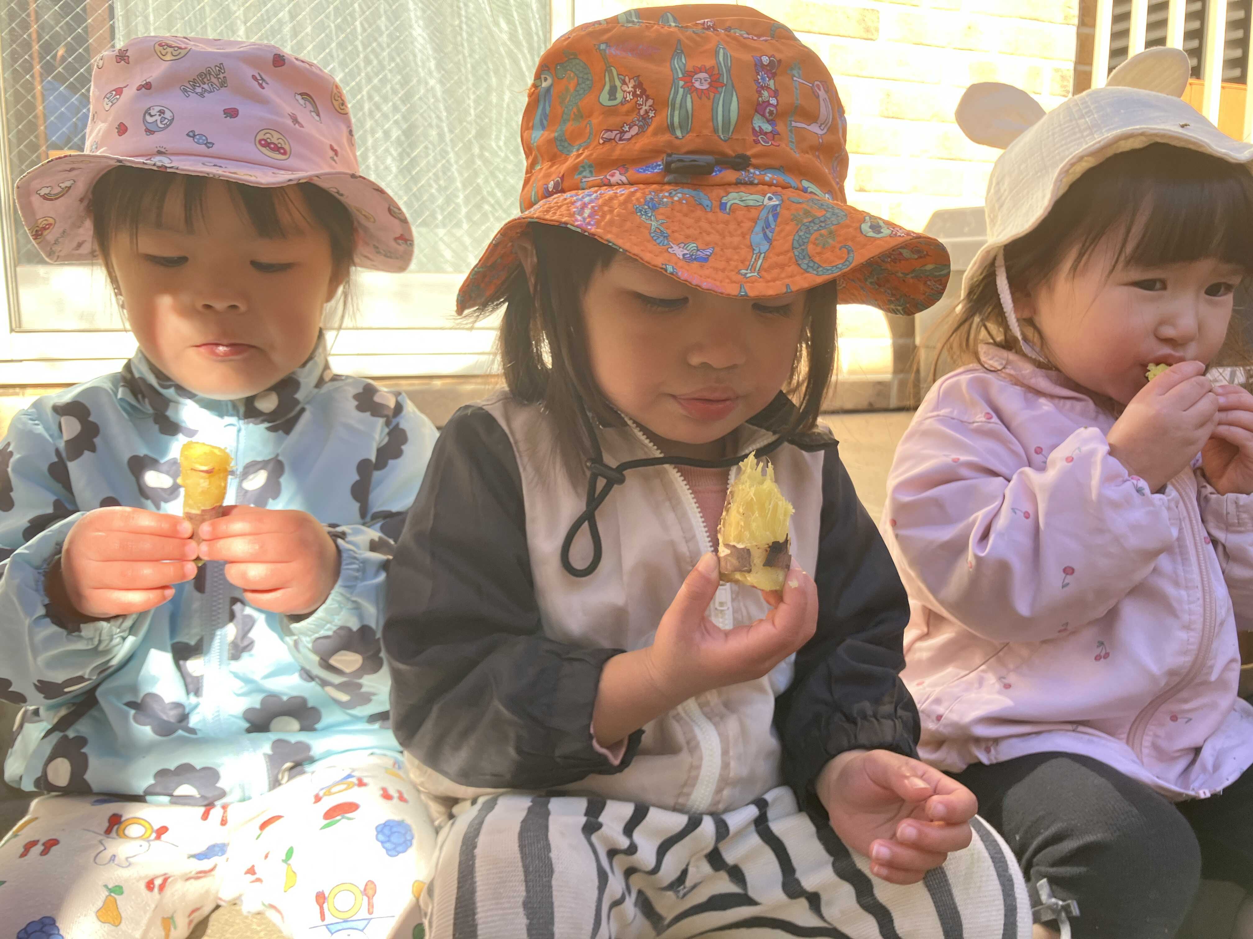 2歳児さんにもおすそ分け。「おいしい~♪」「あまーい!」と熱々のお芋を上手に冷ましながら食べていました。