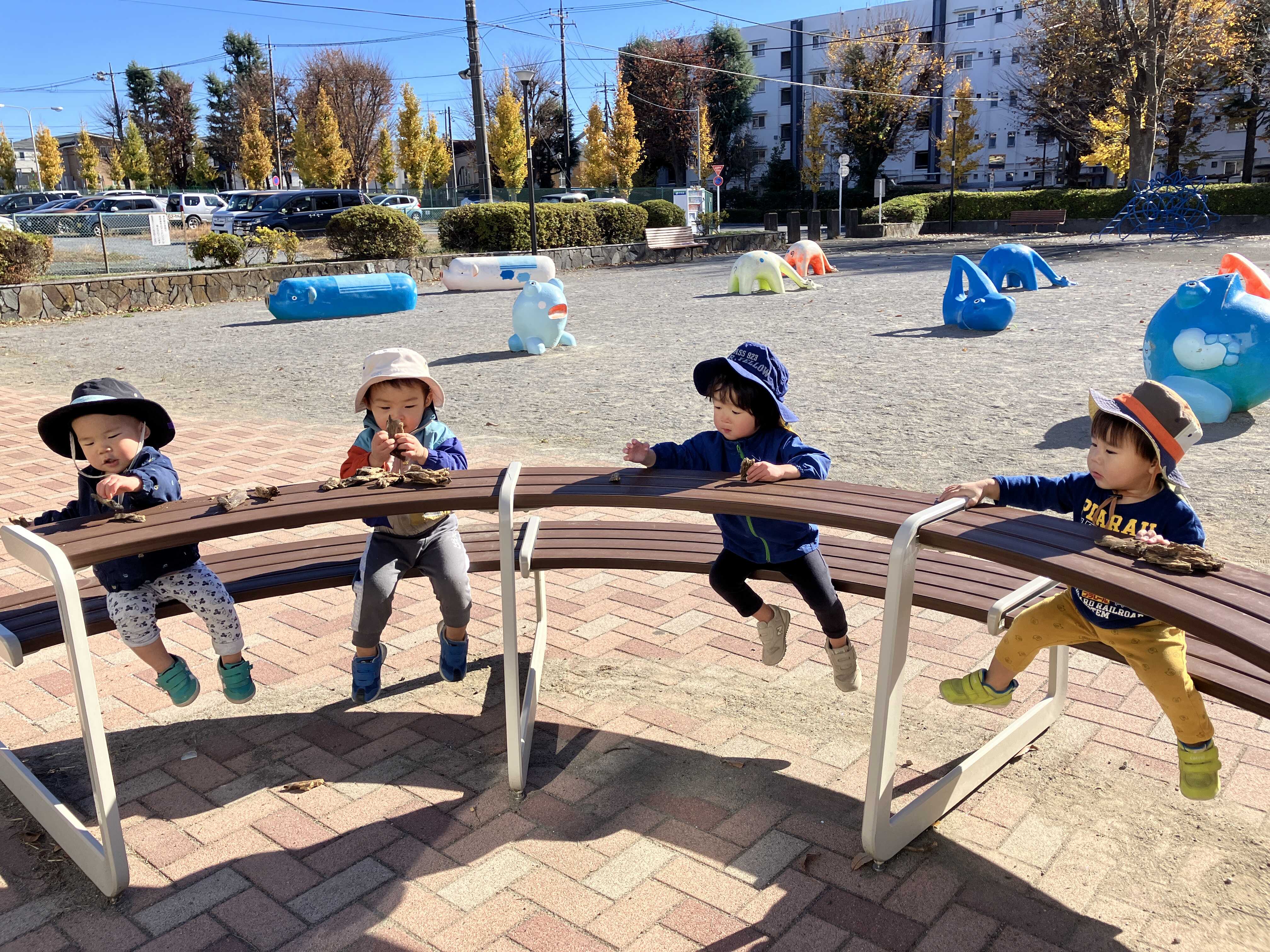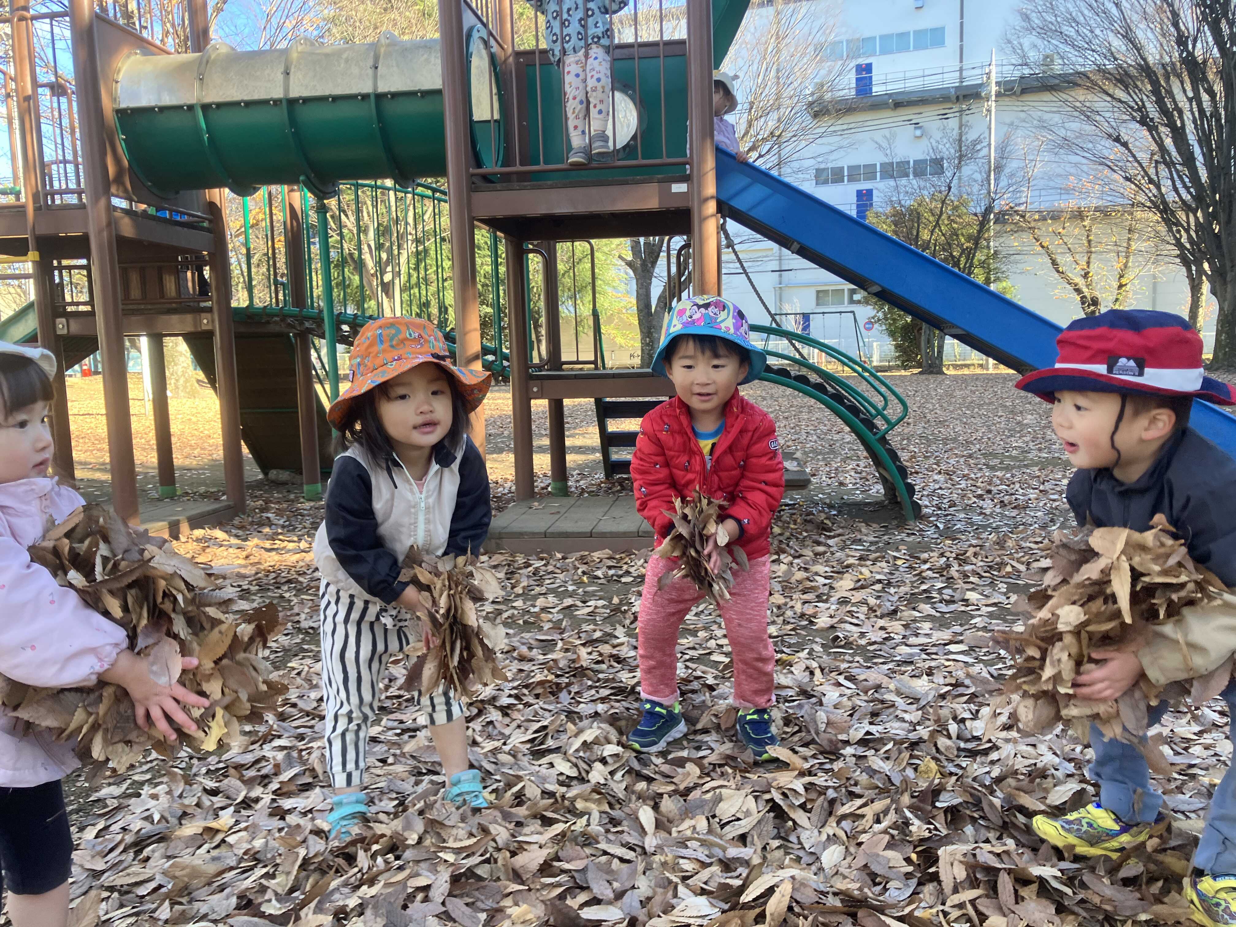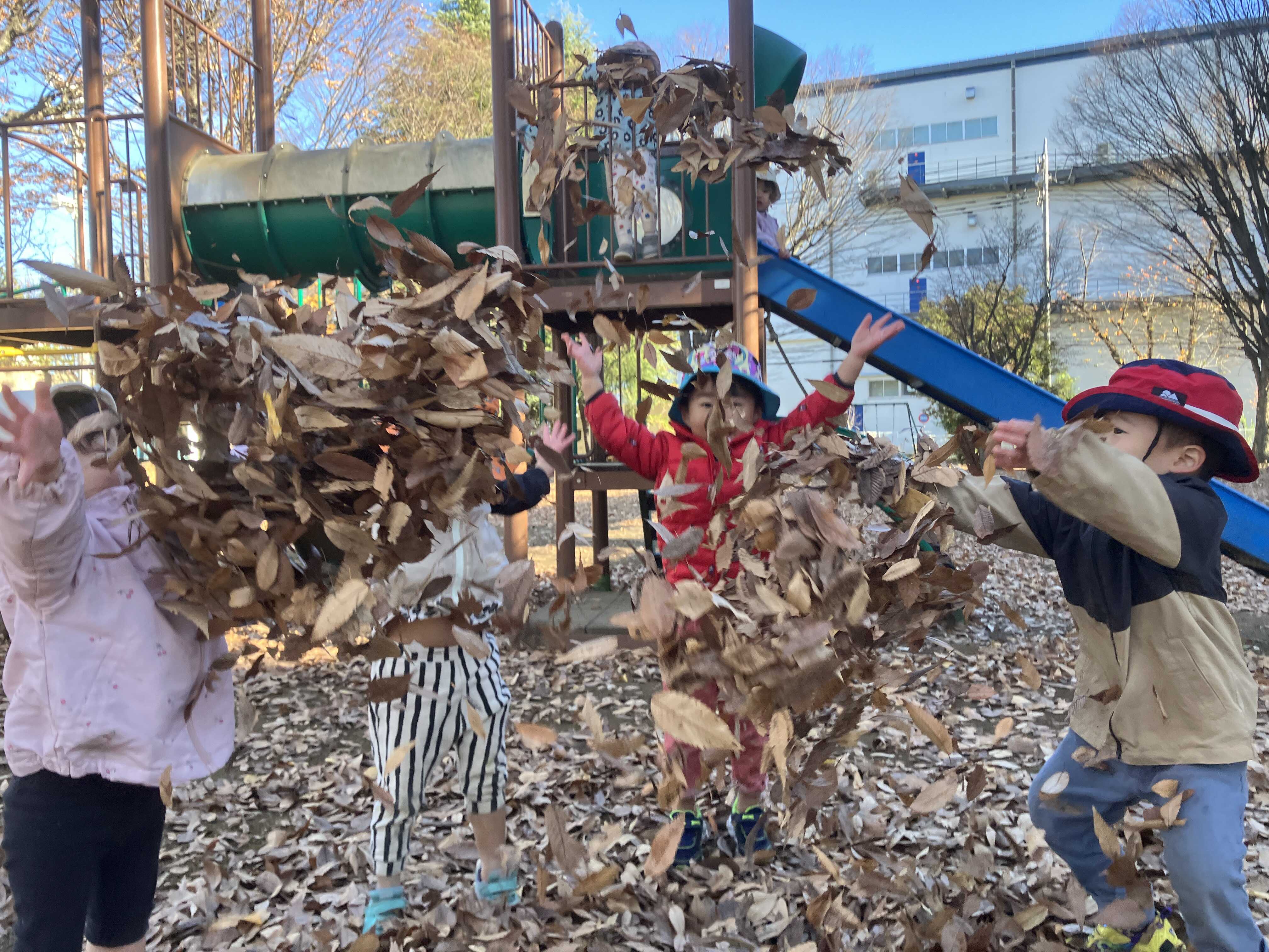 2歳児さんは落ち葉遊びが大好き♪みんなでせーのっ!!