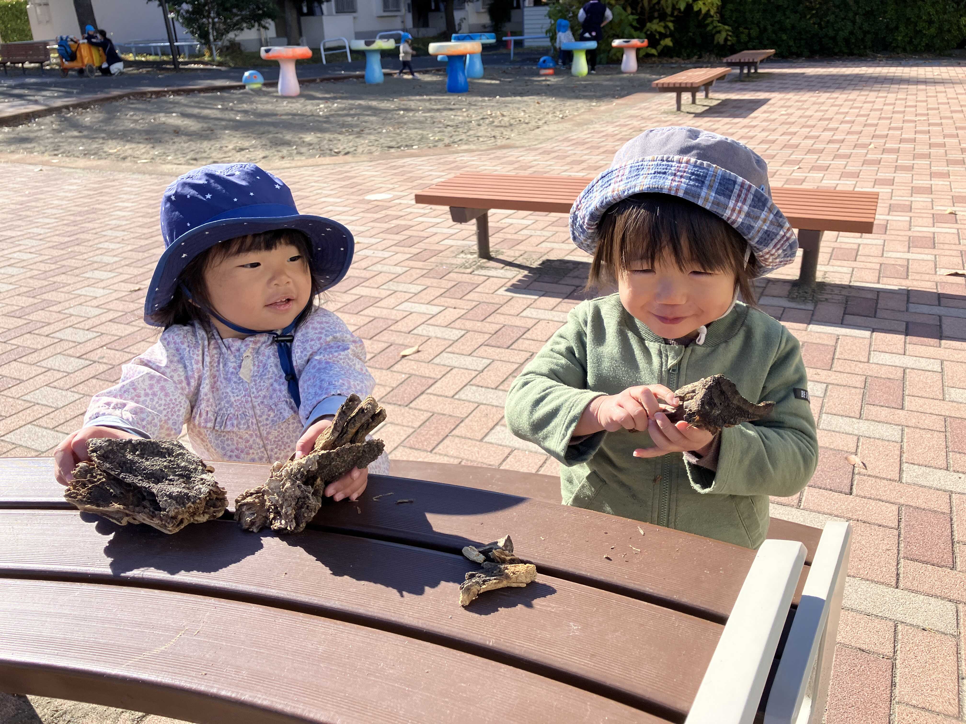 1歳児さんは木を焼き芋に見立てて遊んでいます。「焼き芋いただきまーす!!」