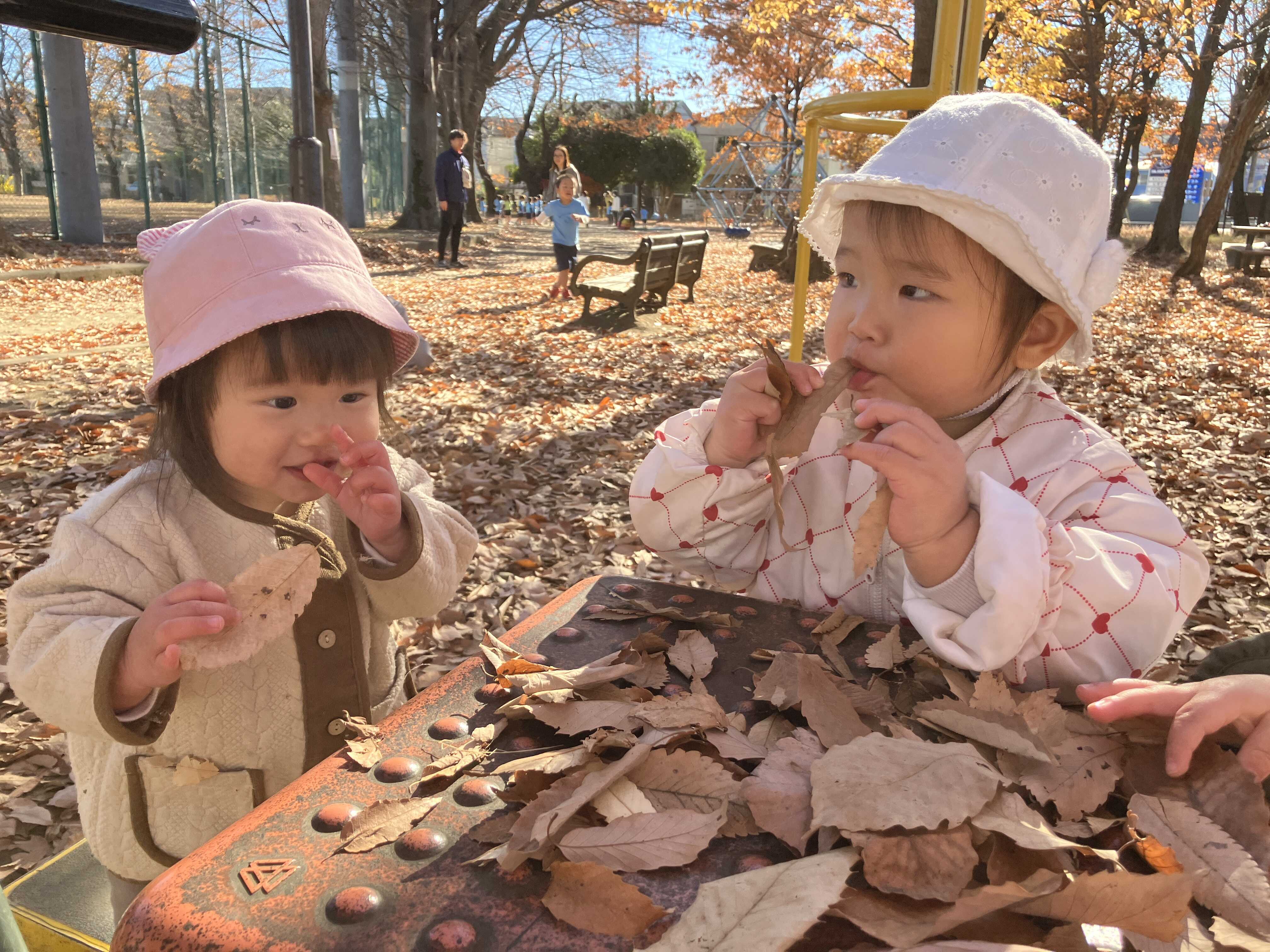 落ち葉を台に乗せて「モグモグモグ」食べる真似っこが上手な0歳児さん。見立て遊びを楽しんでいます。