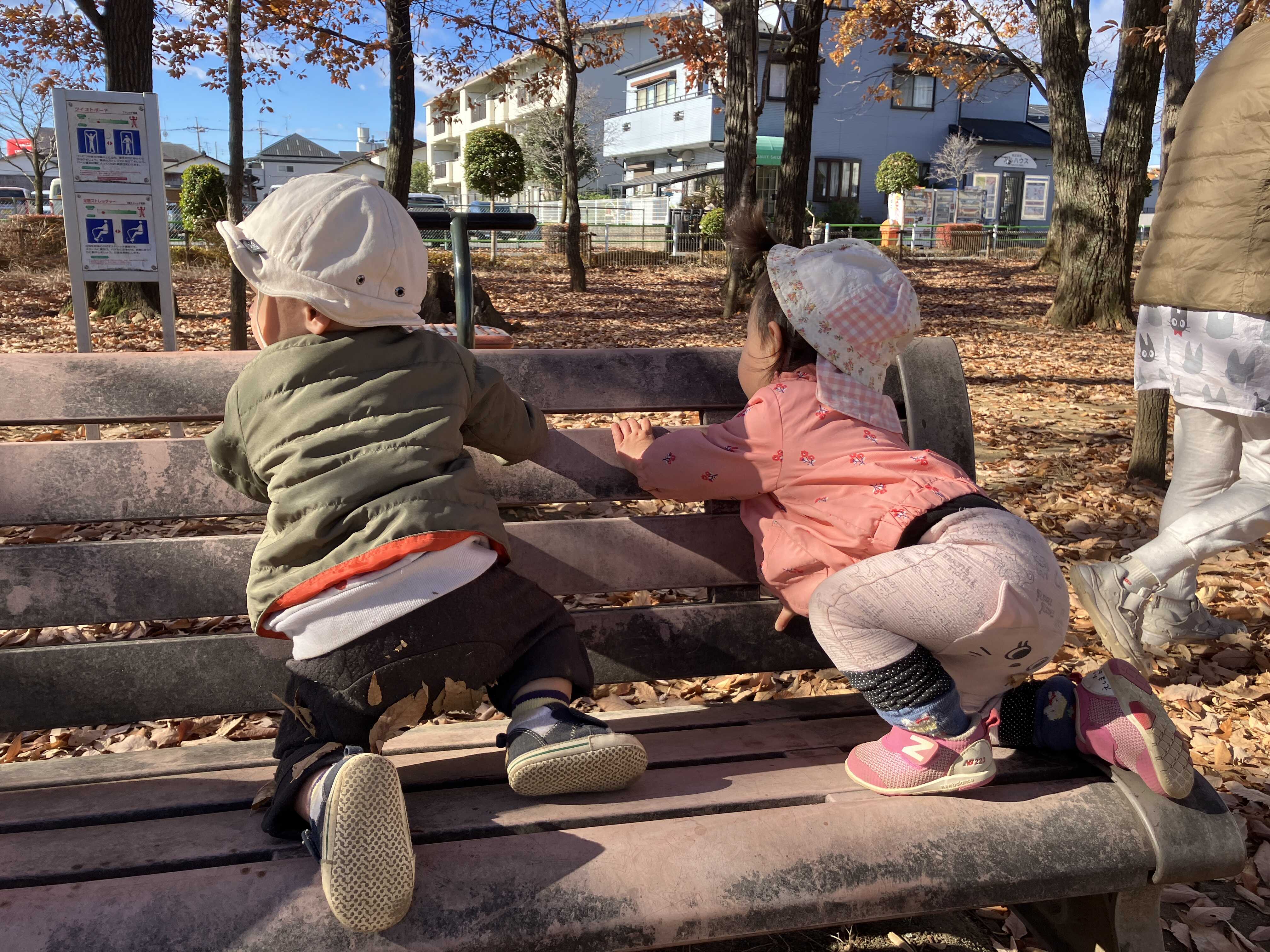 ベンチによいしょ!!腕や足に力がつき、高い所に上がるのが楽しいようです♪