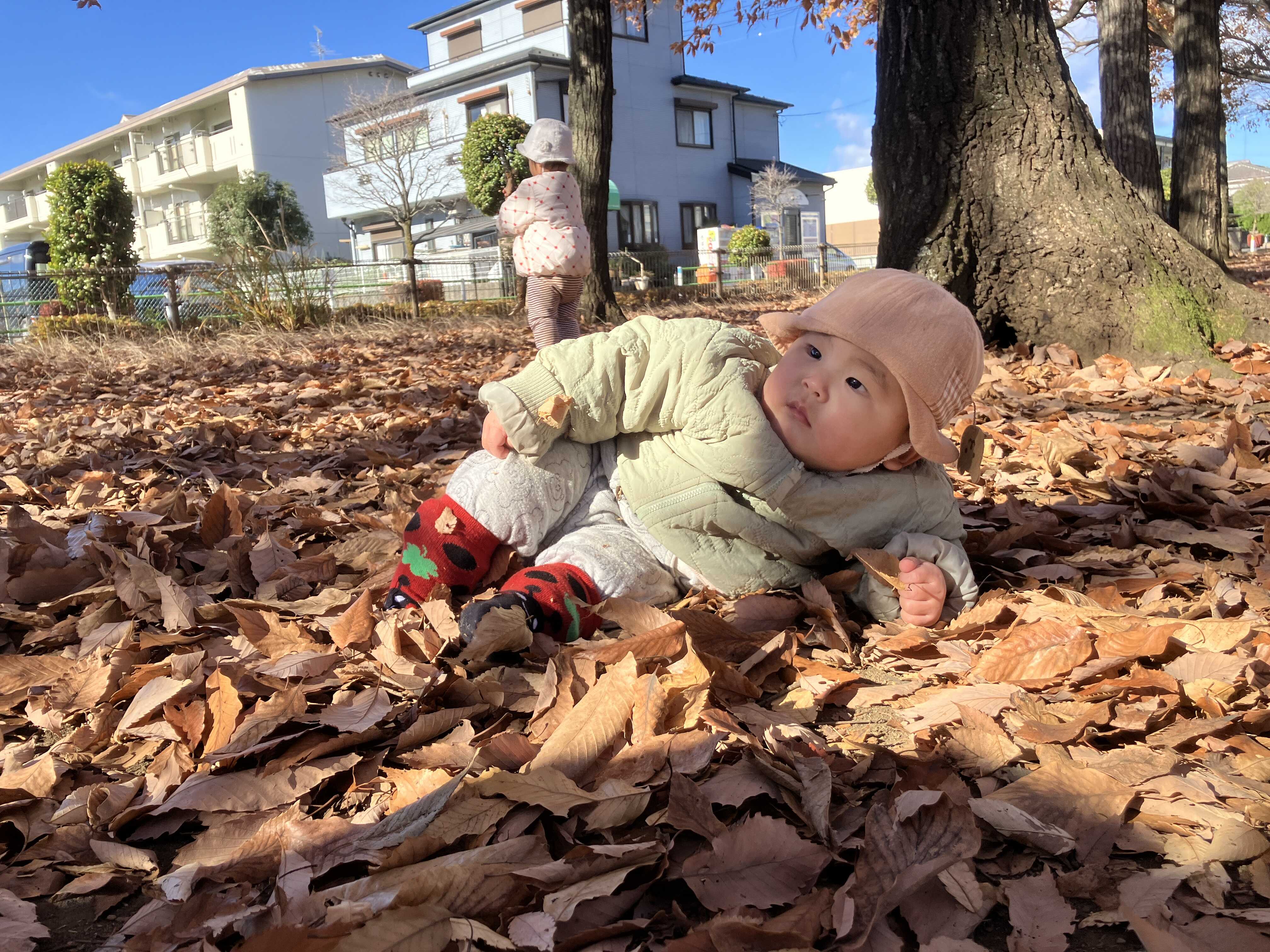 ふかふか落ち葉にゴロン!今の時期しか味わえない遊びを全身で楽しんでいます♪