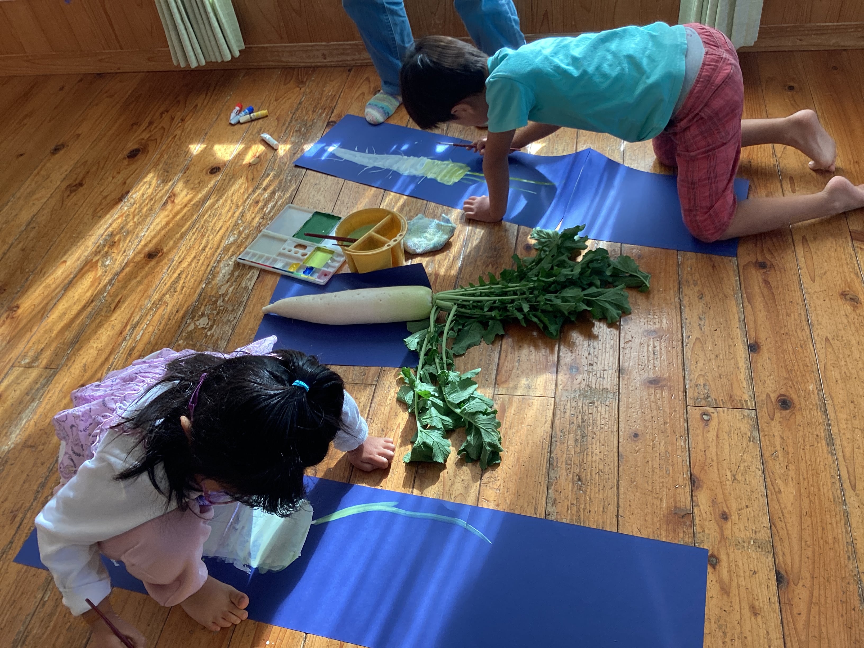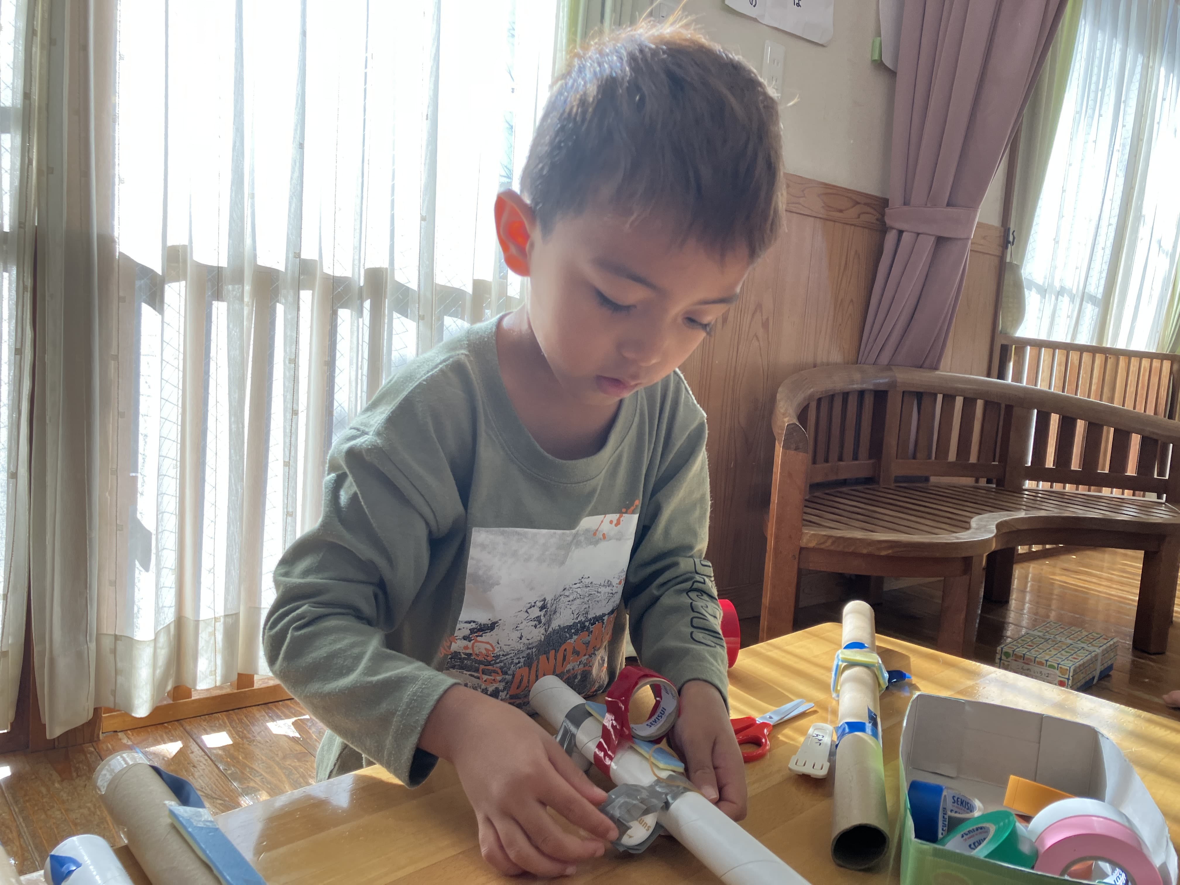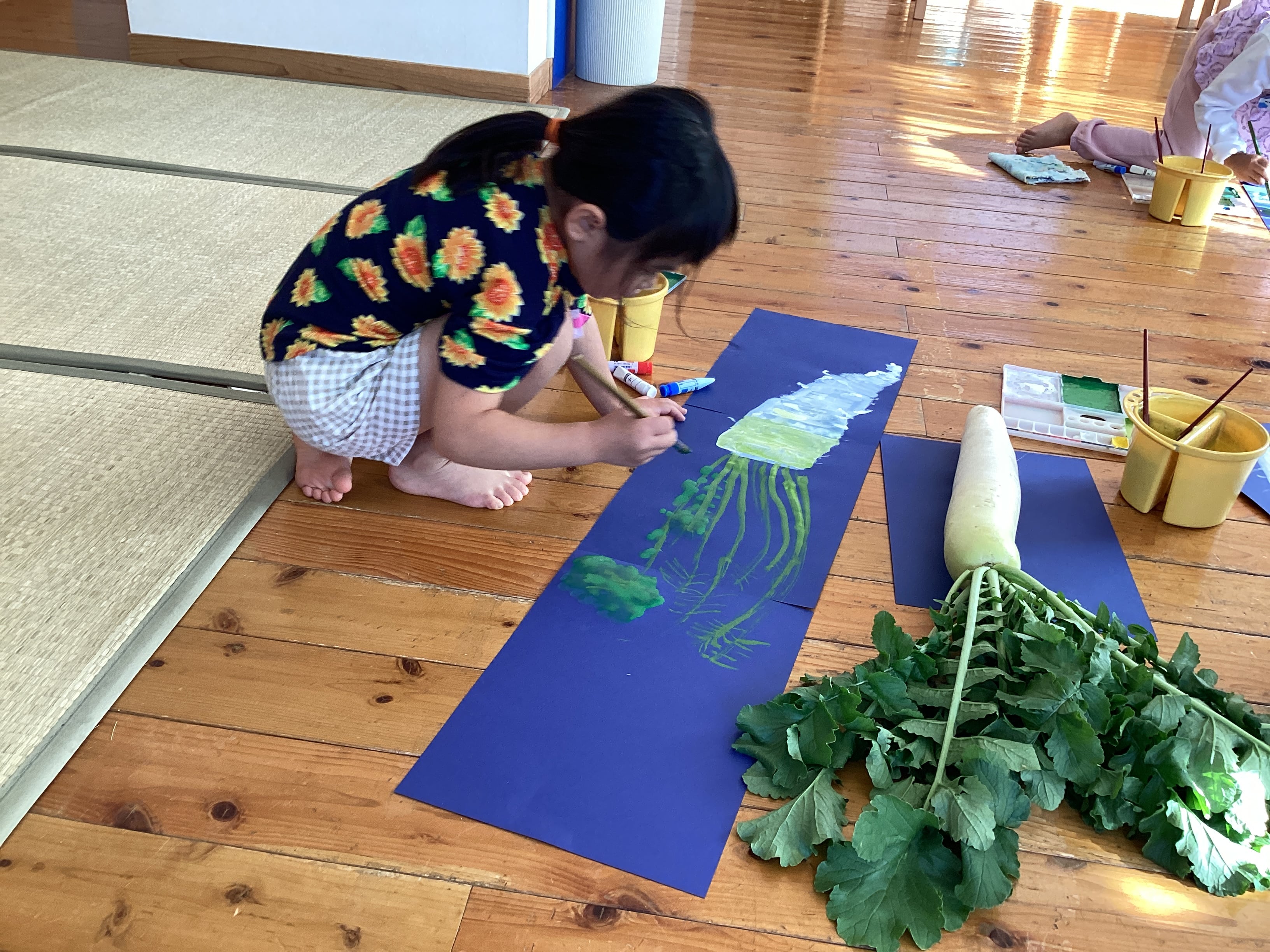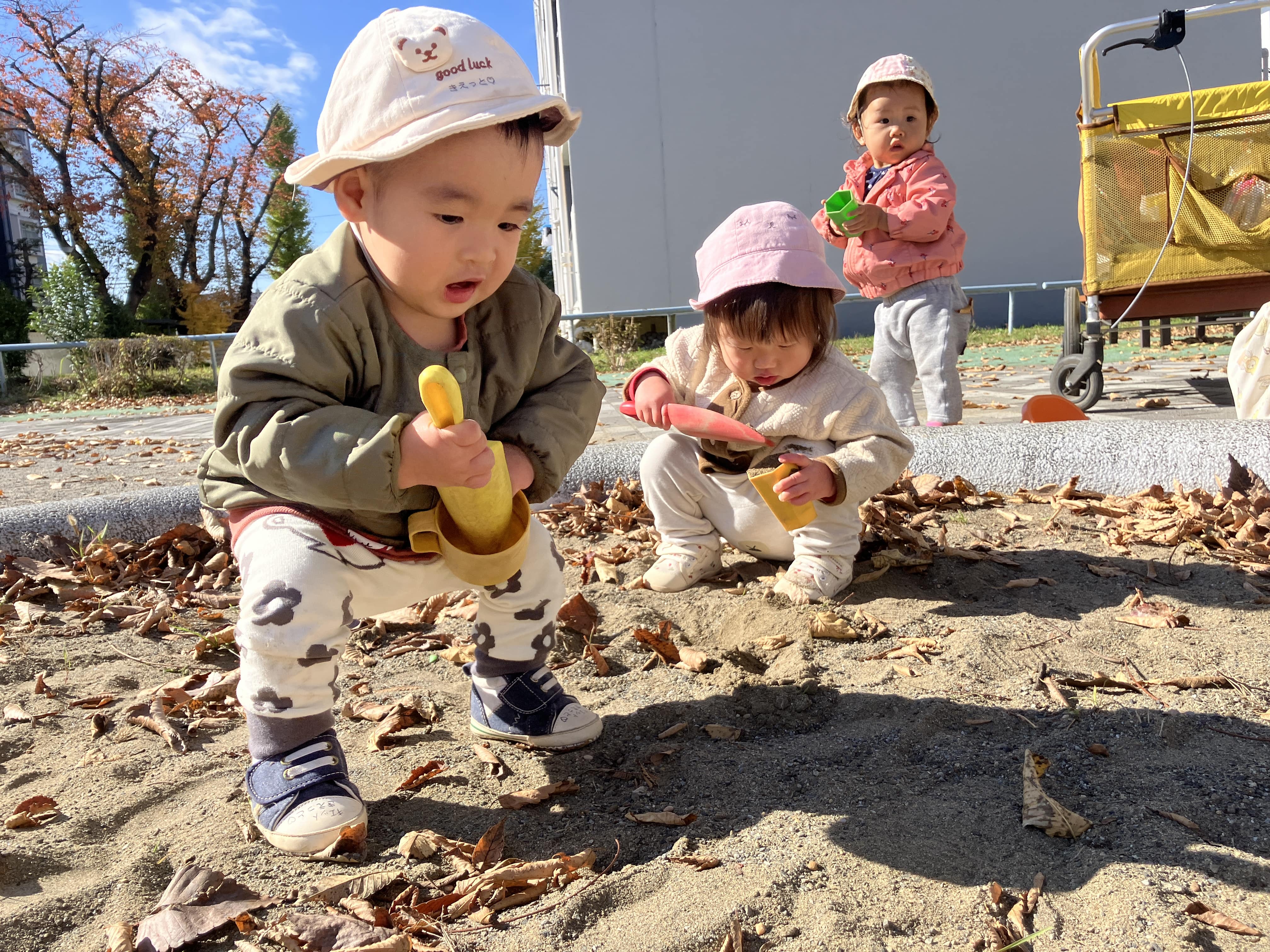 今日の保育 2025/11/19 絵の時間がありました♬ 0歳児さんはお散歩に行きました♬ 今日は砂場遊びが楽しい♬ 全身で砂の感触を楽しんでいました♬ 1歳児さんも一緒の公園へ♬ 仲良く並んで電車ごっこかな? 2歳児さんは今日も落ち葉遊び! 落ち葉の布団に入ってピース✌ 落ち葉の布団ってふかふかで気持ちいいね♬ 3,4歳児さんは廃材制作をしました♬ 「なにをつかおうかなー😊」 糸電話を作りました♬ 「もしもーし!」「もしもーし!」 とても集中して取り組んでいました♬ 5歳児さんは絵の時間で大根を描きました♬ 丸々として瑞々しい大根になってきました♬ 葉っぱの部分も丁寧に描いていきます♬