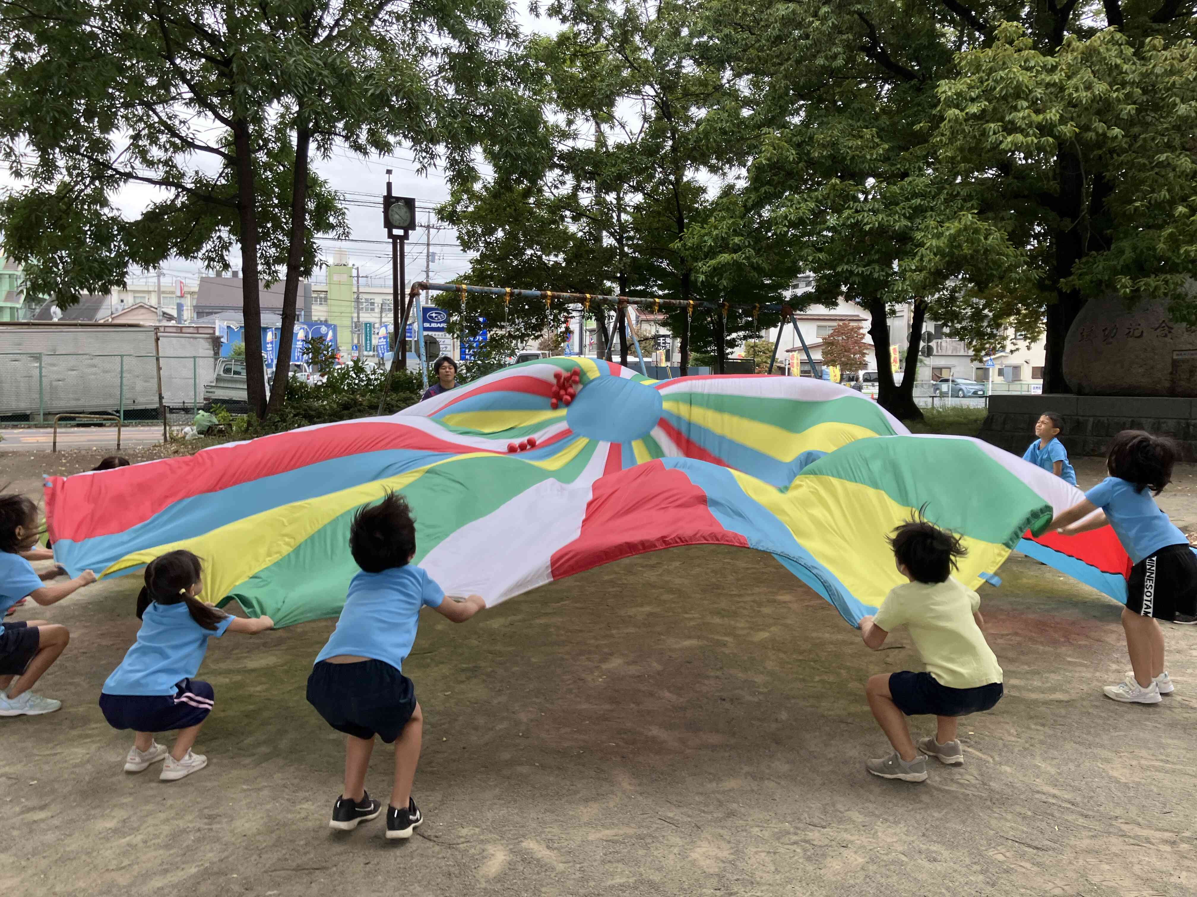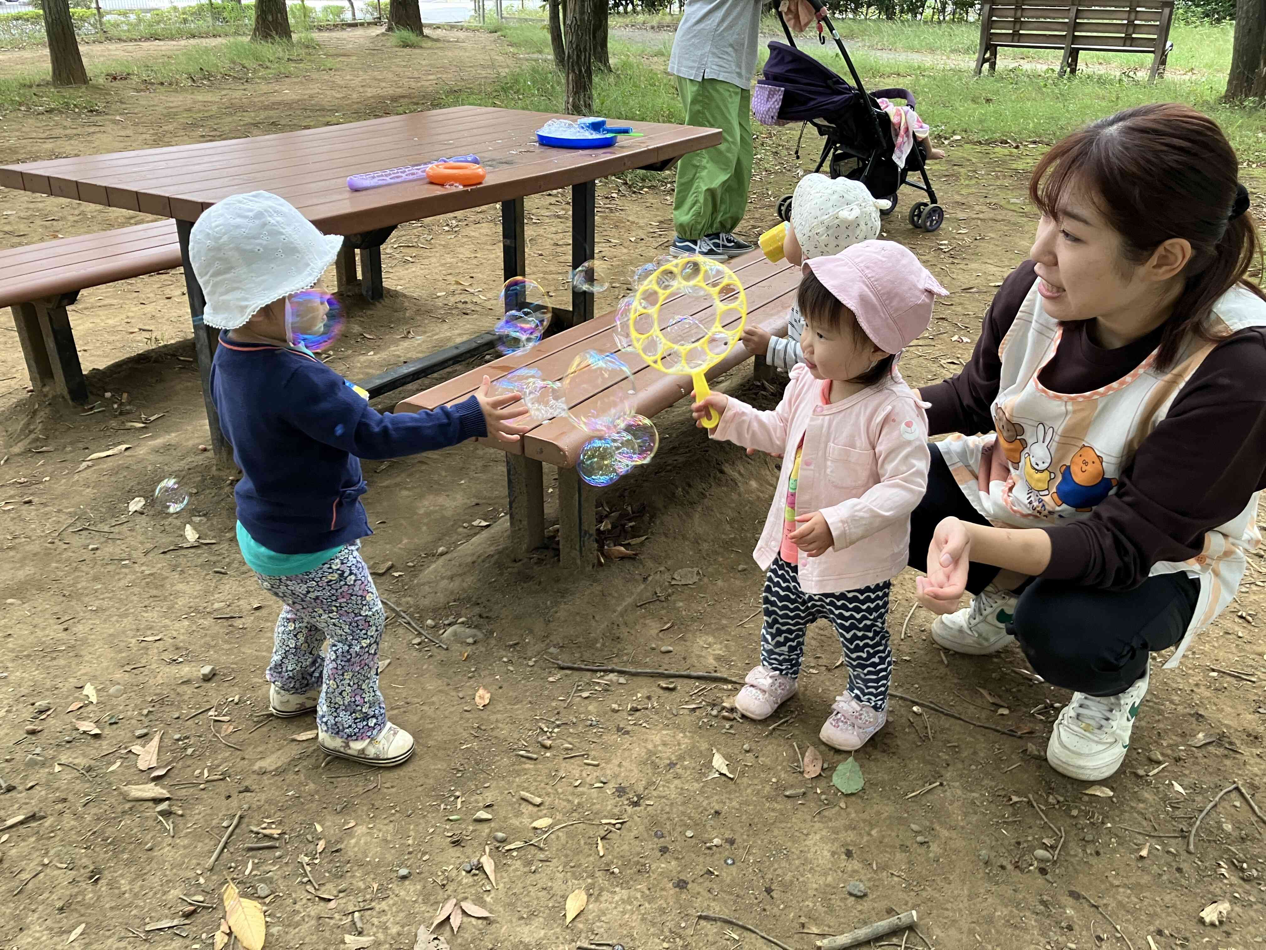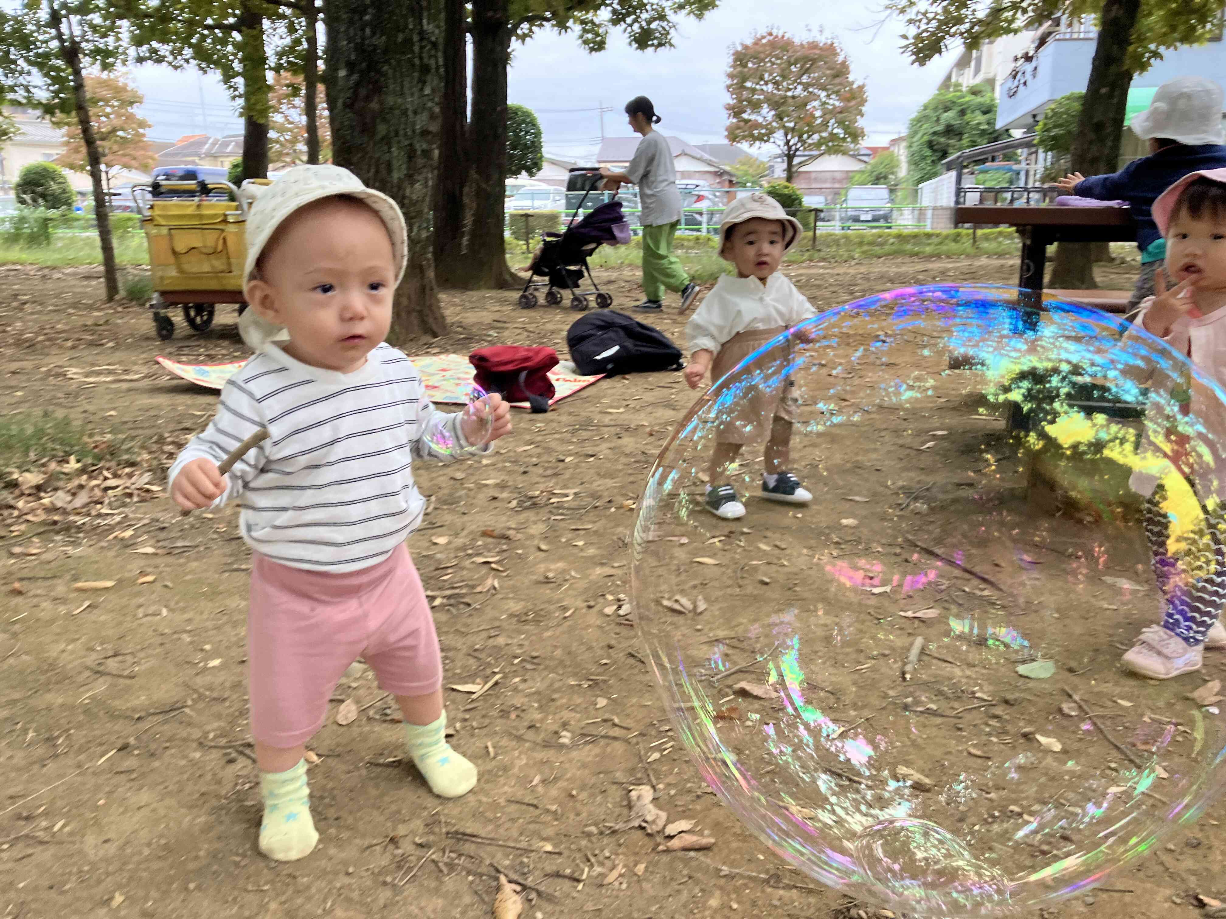 • 公園ではシャボン玉遊び。「おー!」大きなシャボン玉にビックリ!