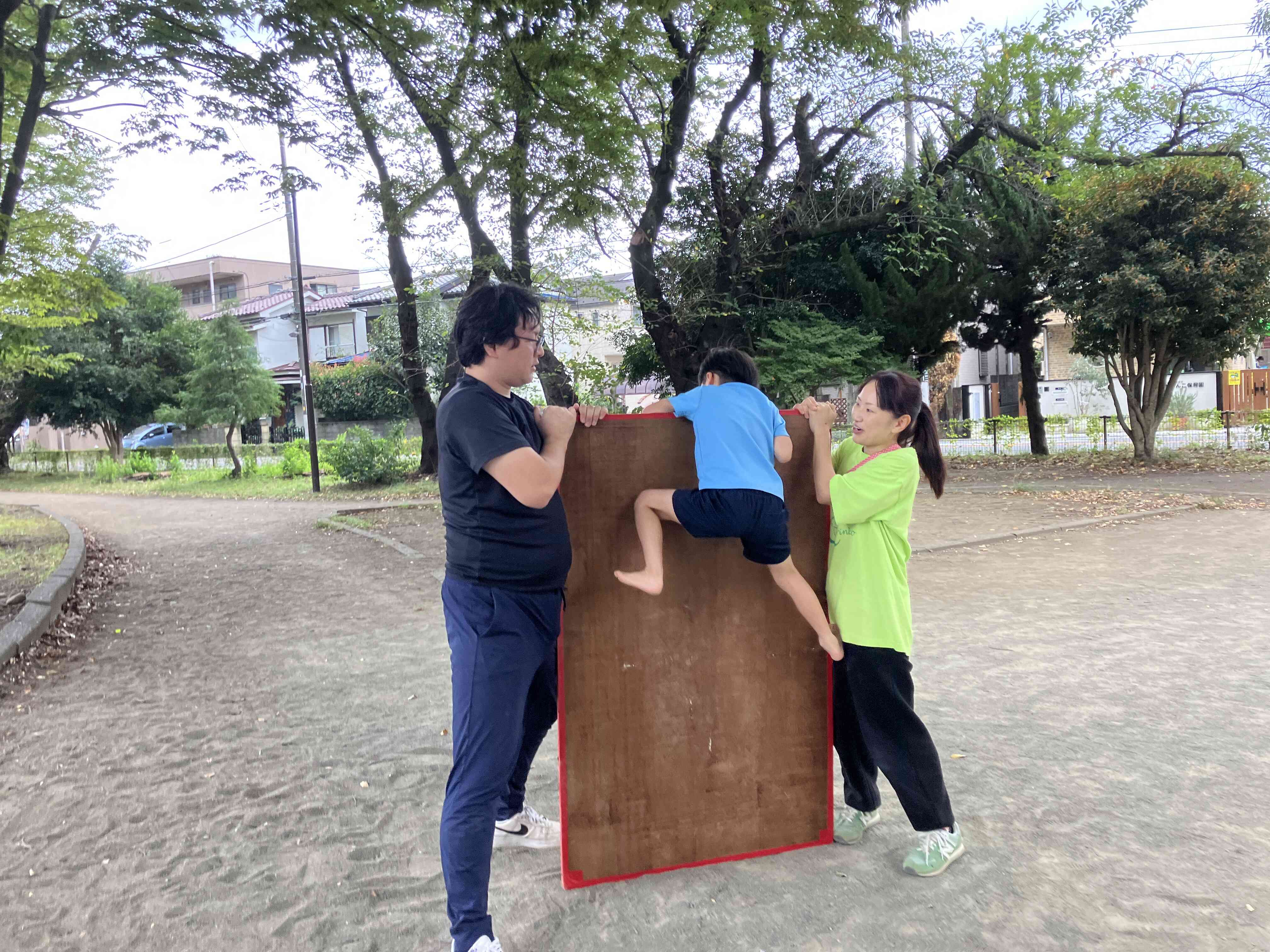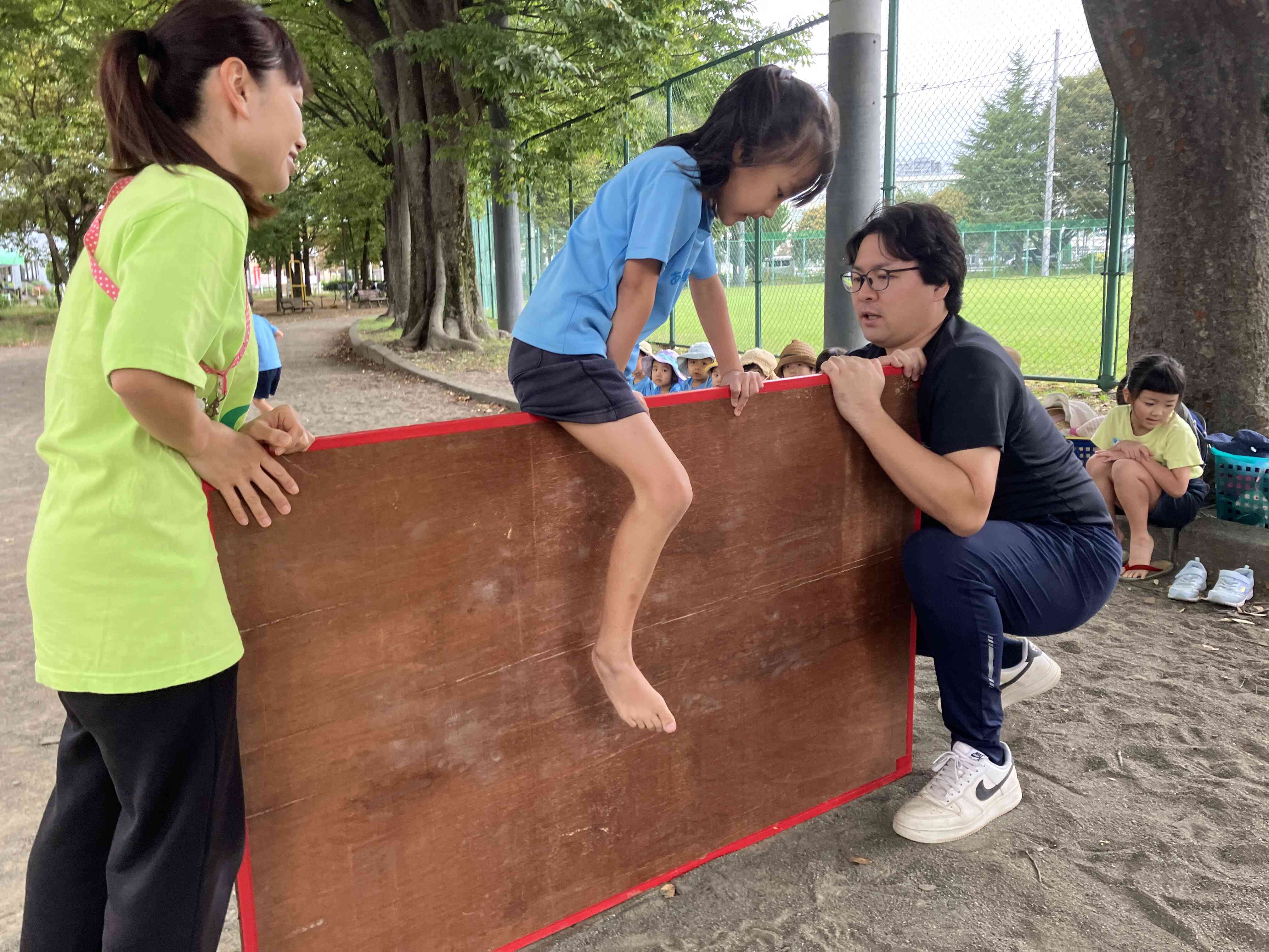 • 5歳児さんは戸板登り!最初は慎重に板を横にして挑戦。慣れてくると縦にも挑戦しました。