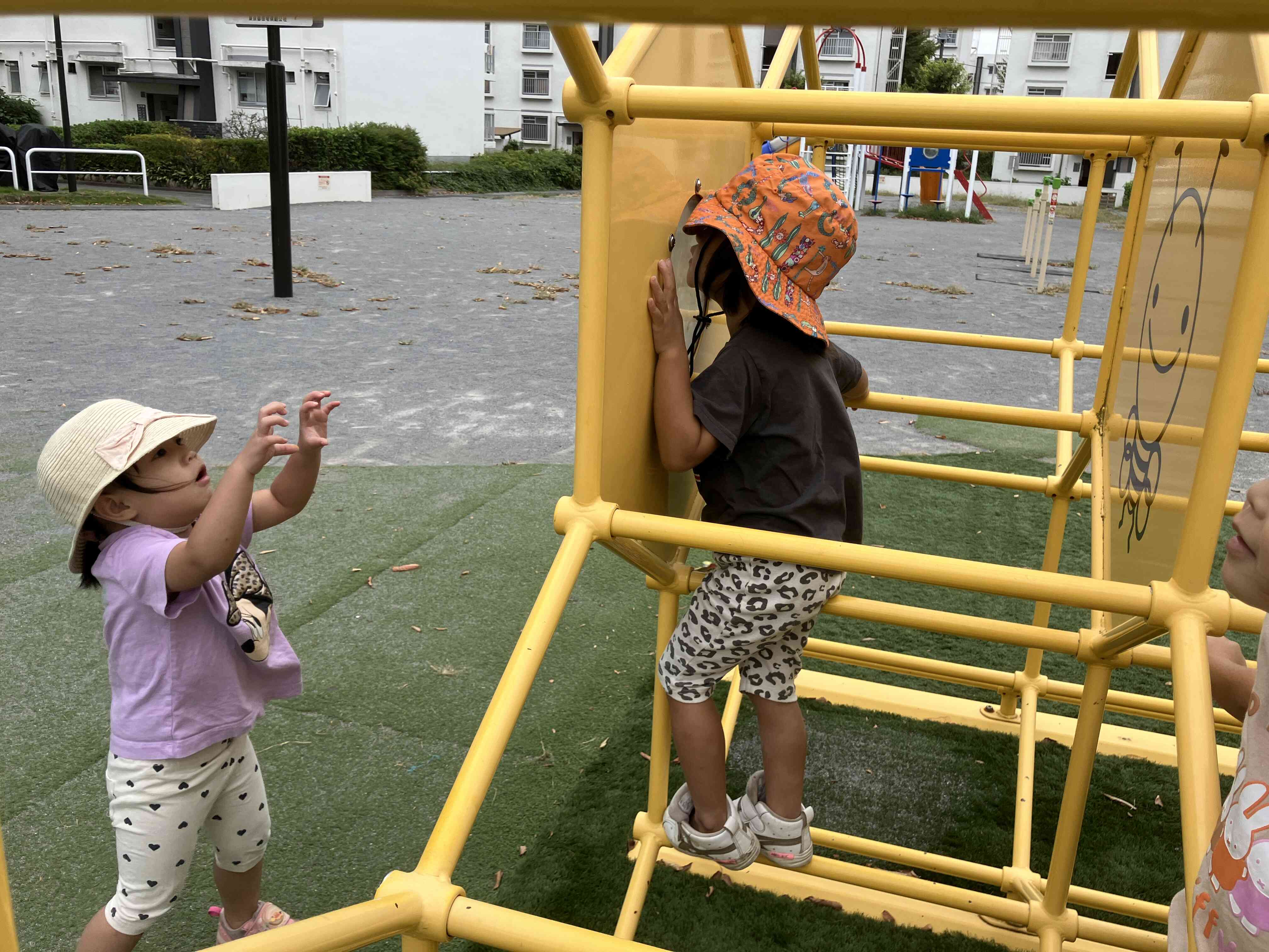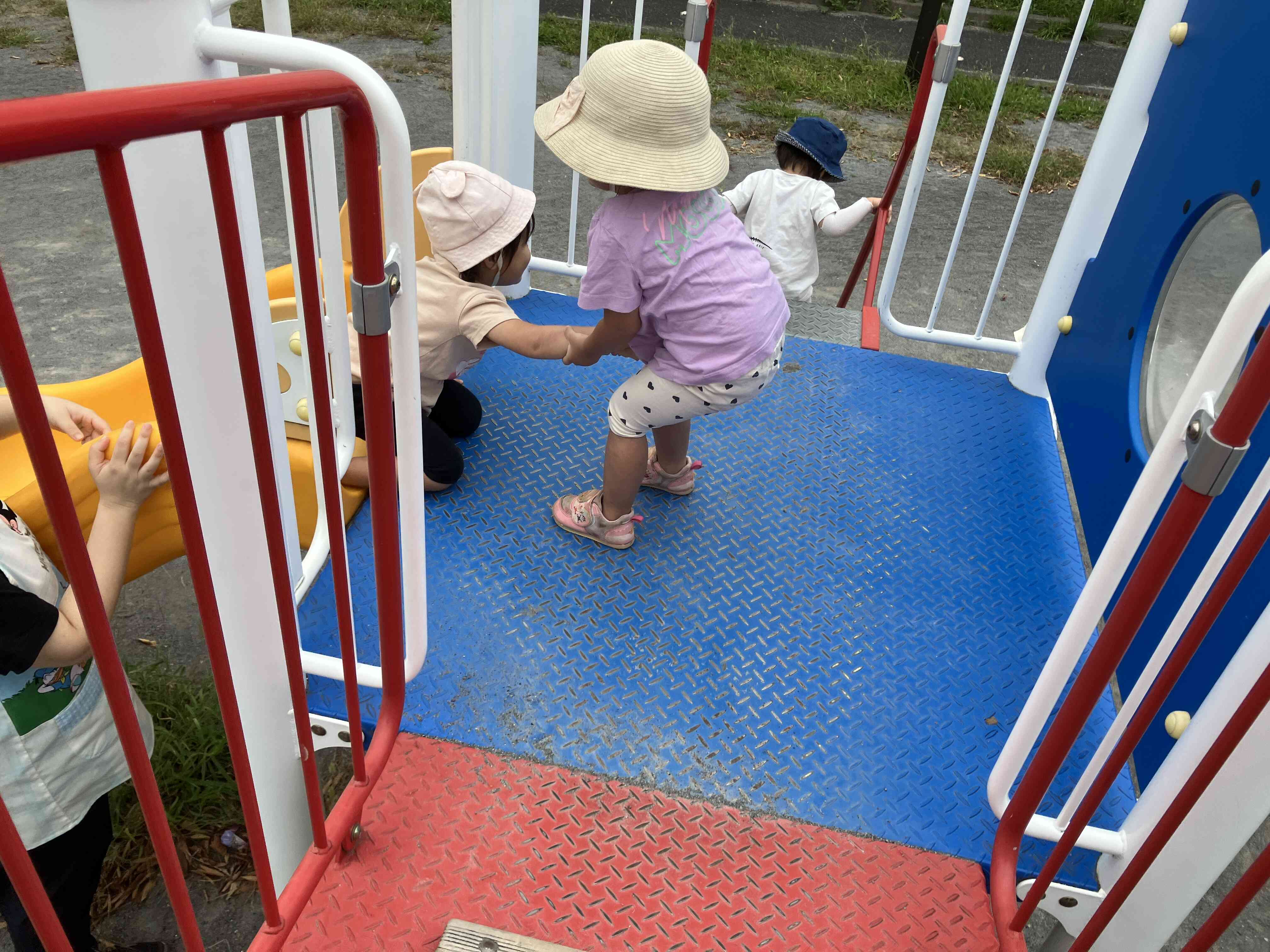 • 2歳児さんは滑り台を上がるのに挑戦!大変な時には上からお友達が助けてくれました♪
