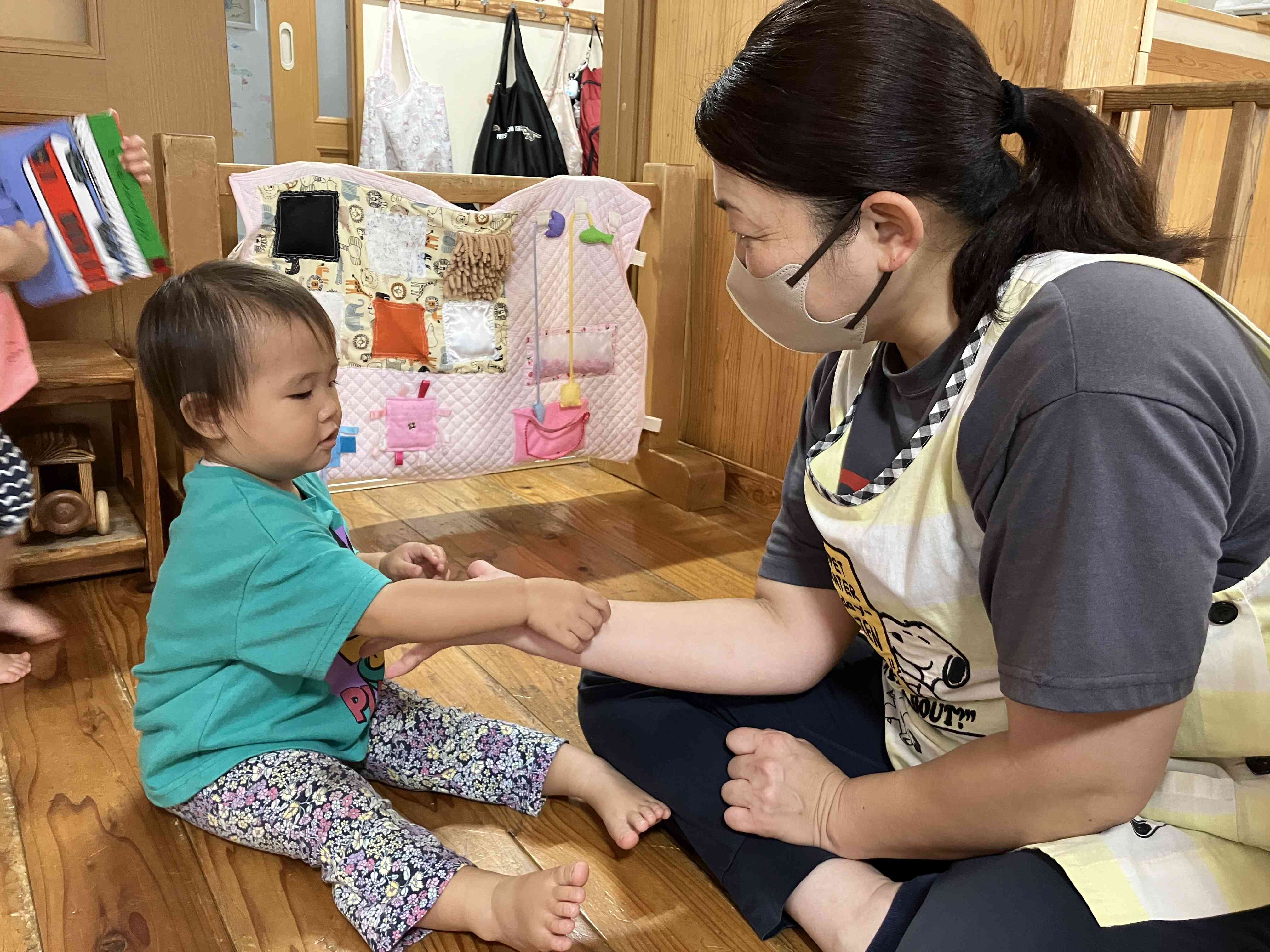 • 「一本橋こちょこちょ~♪」いつも先生にやってもらっているわらべうたを先生にもやってくれる0歳児さん。