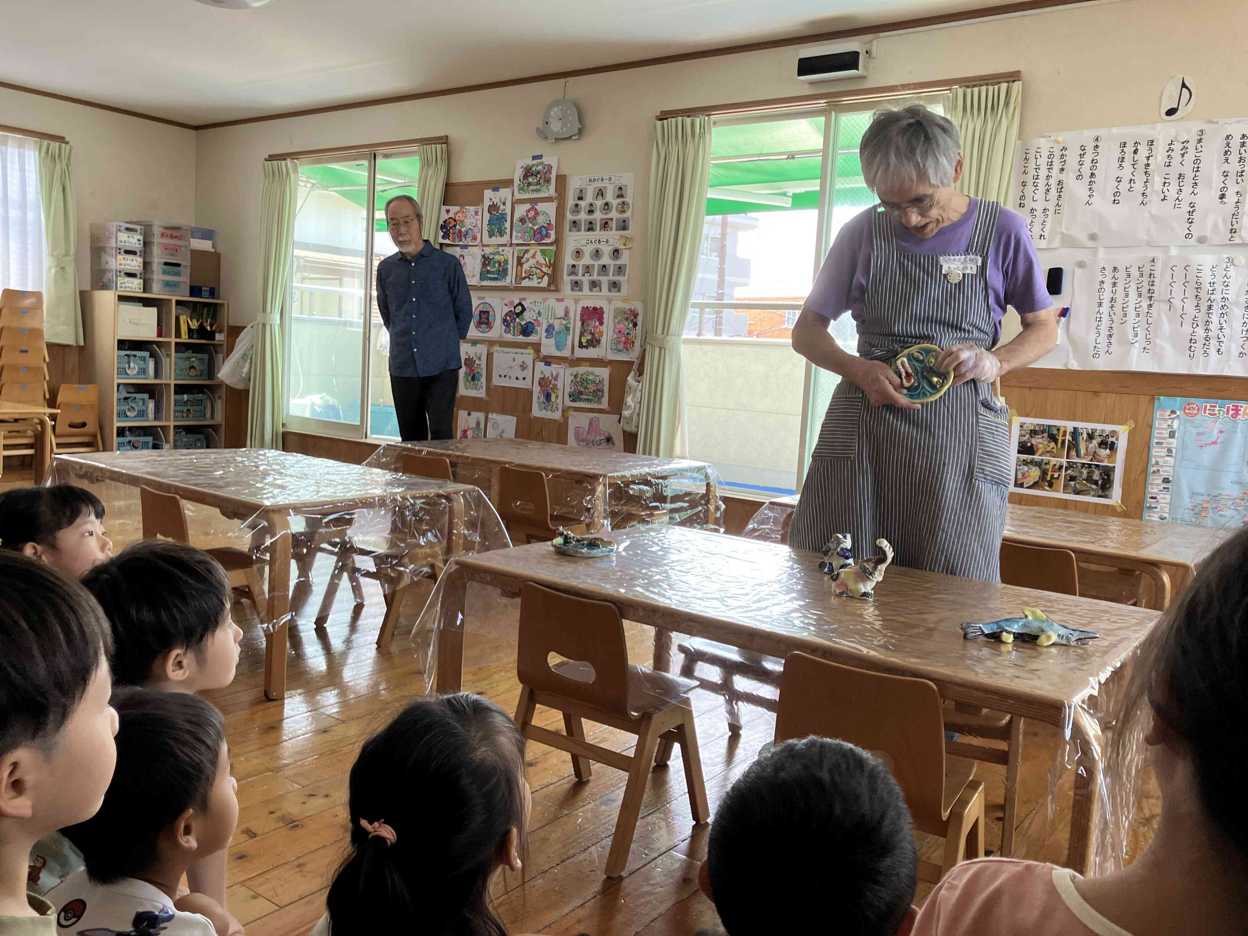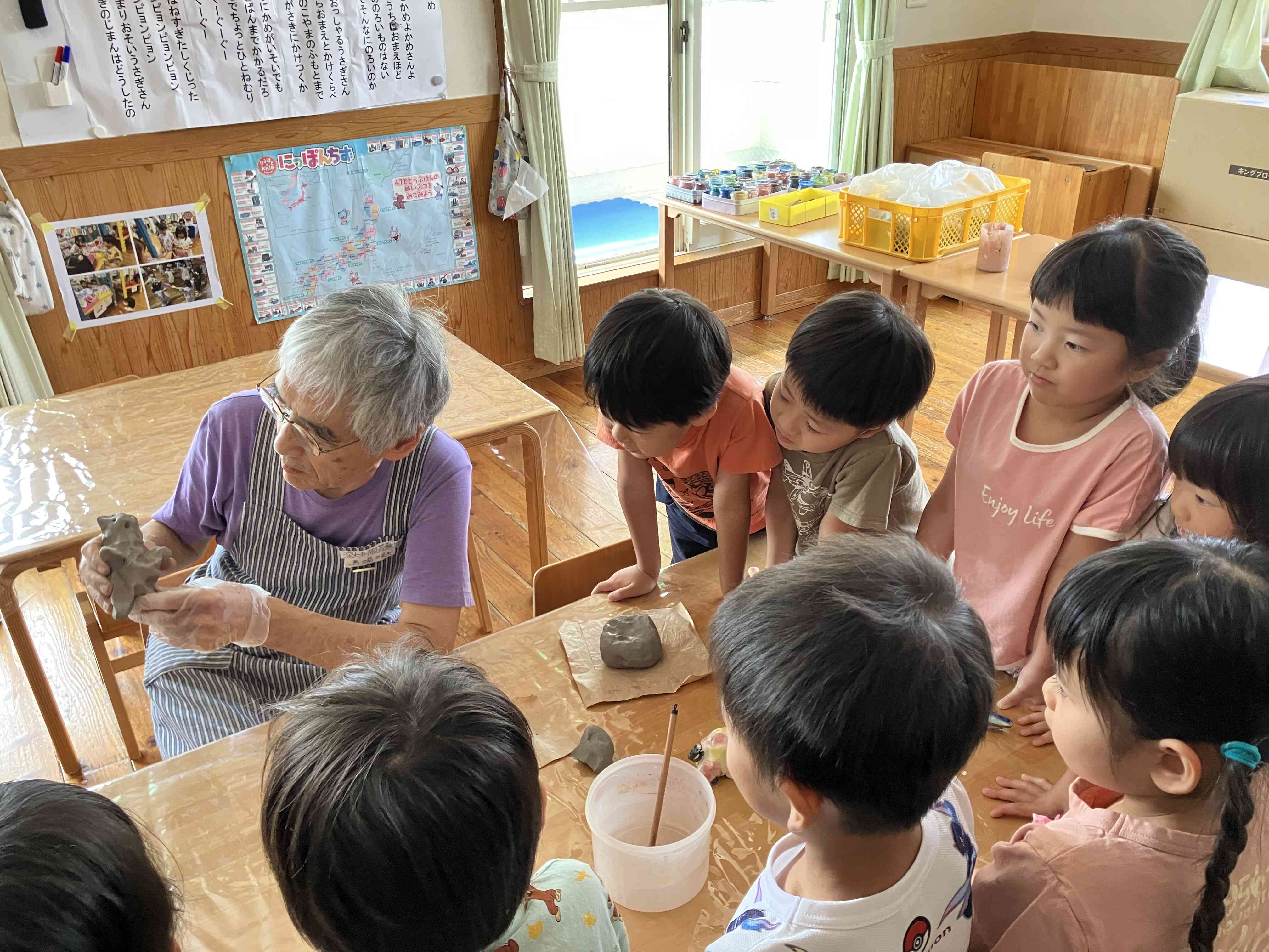 陶芸の指導をしてくれた馬場さん。話を聞く時から興味津々の子どもたち。