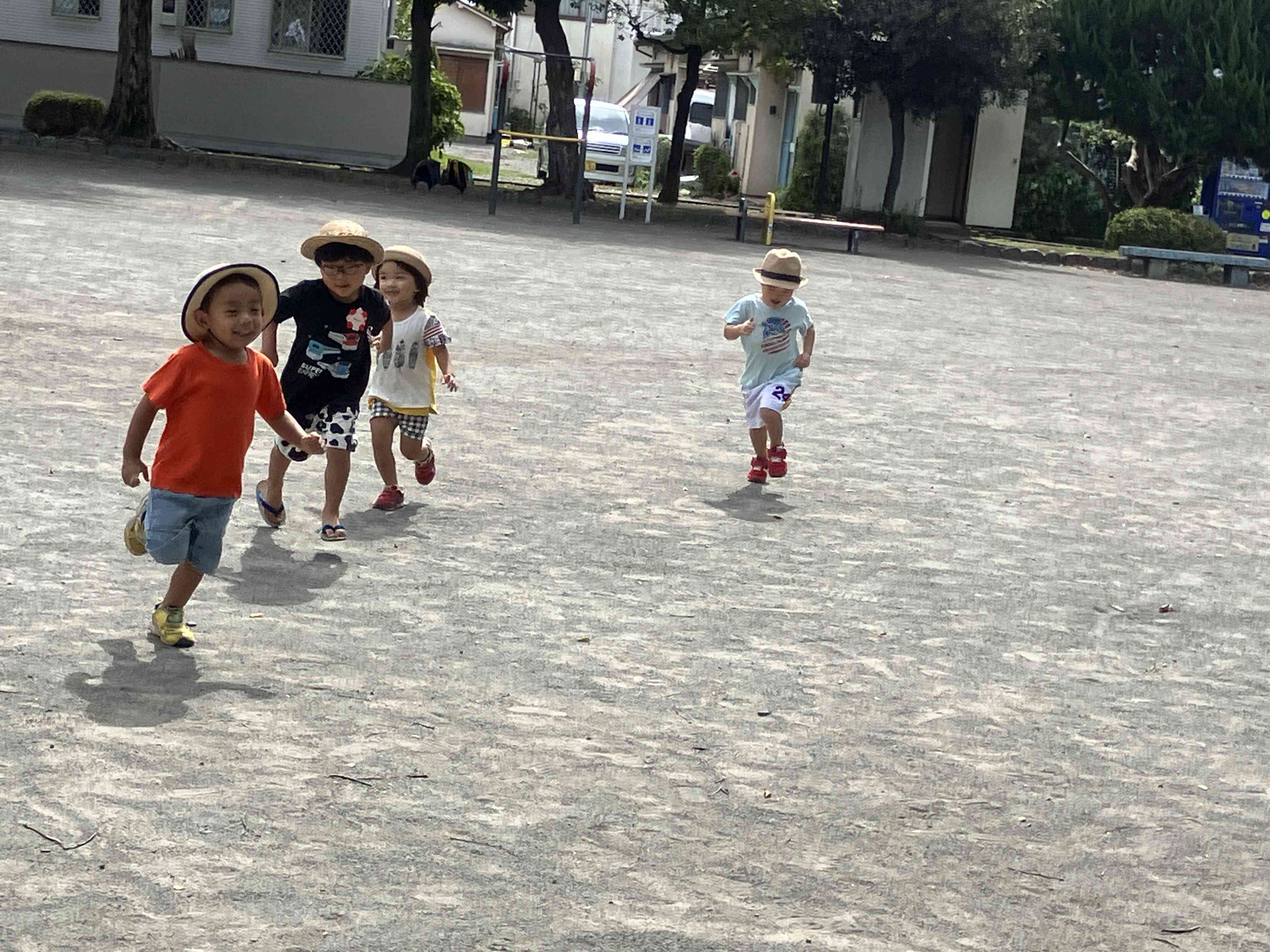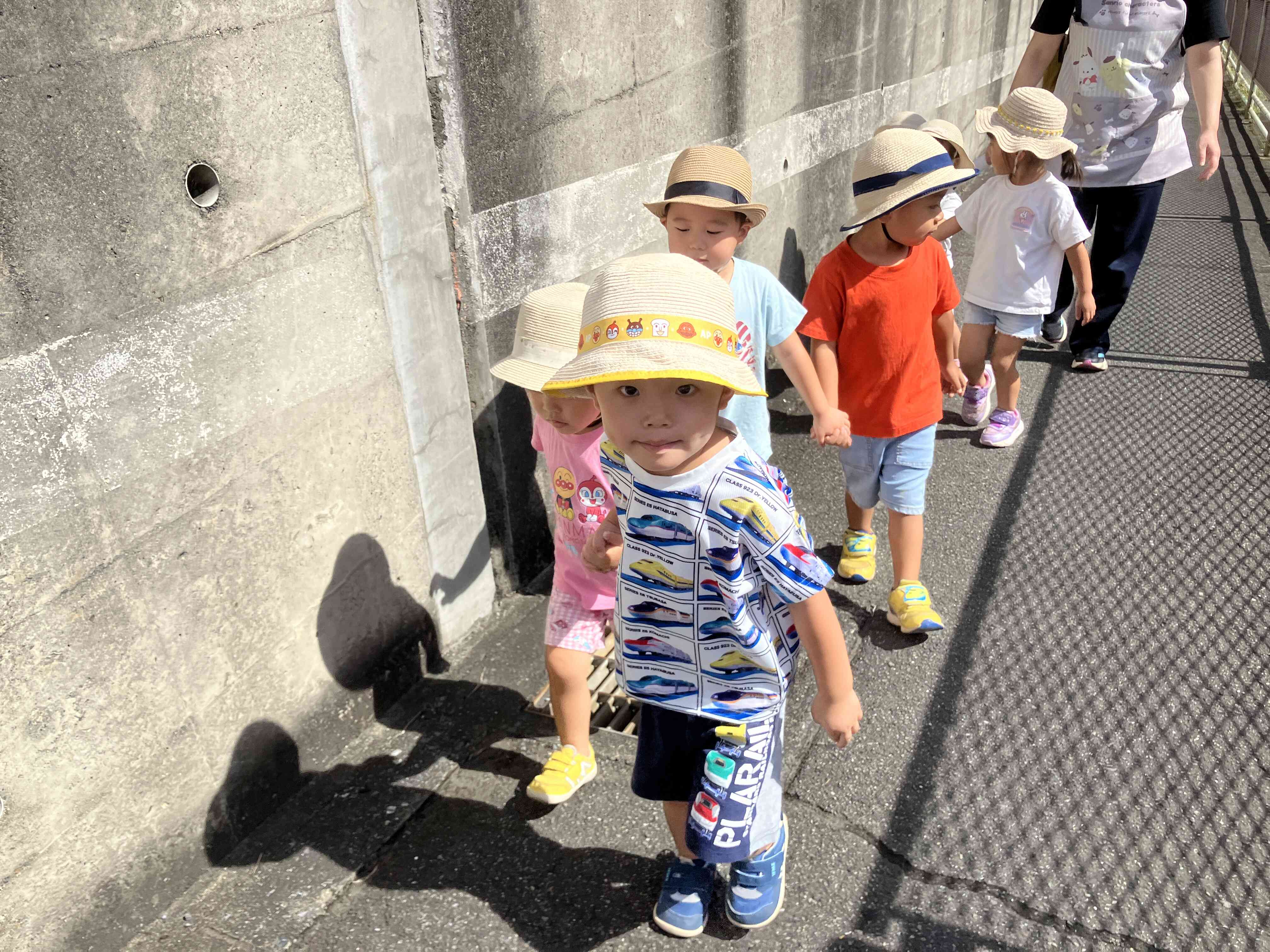 2・3歳児は加美平西公園へ。3歳児さんがリードしつつ散歩です。