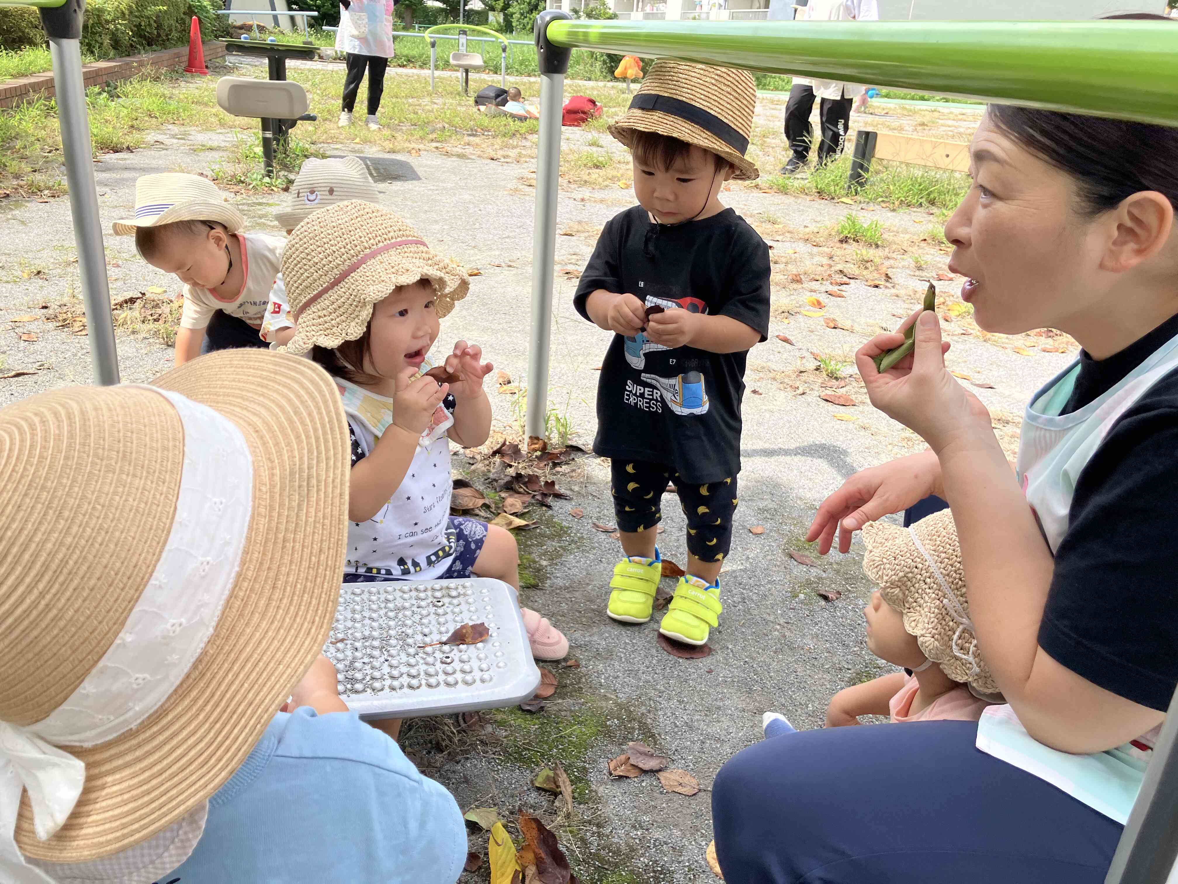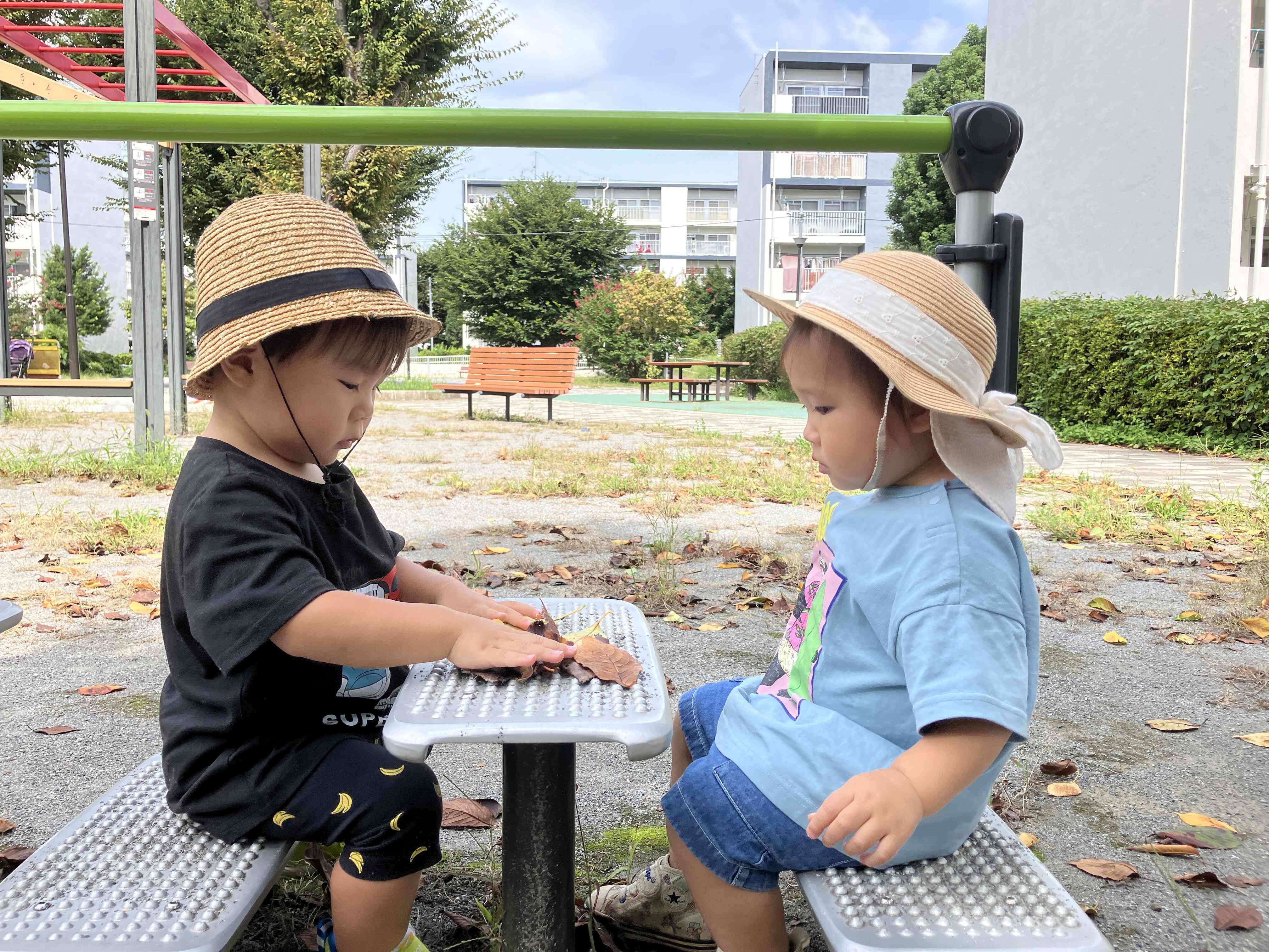 0・1歳児さん「どうぞ!」と葉っぱでごっこ遊びが始まりました。