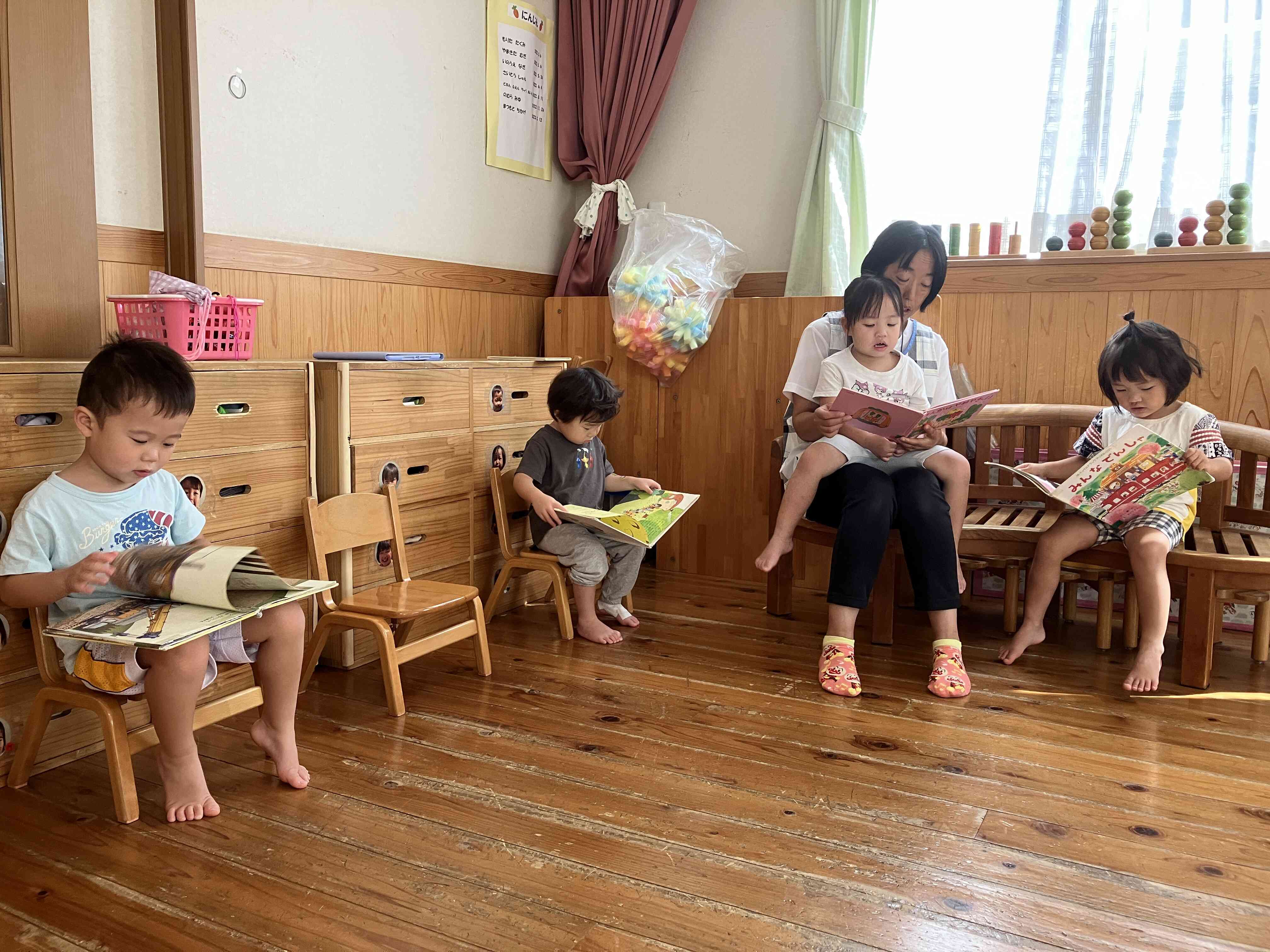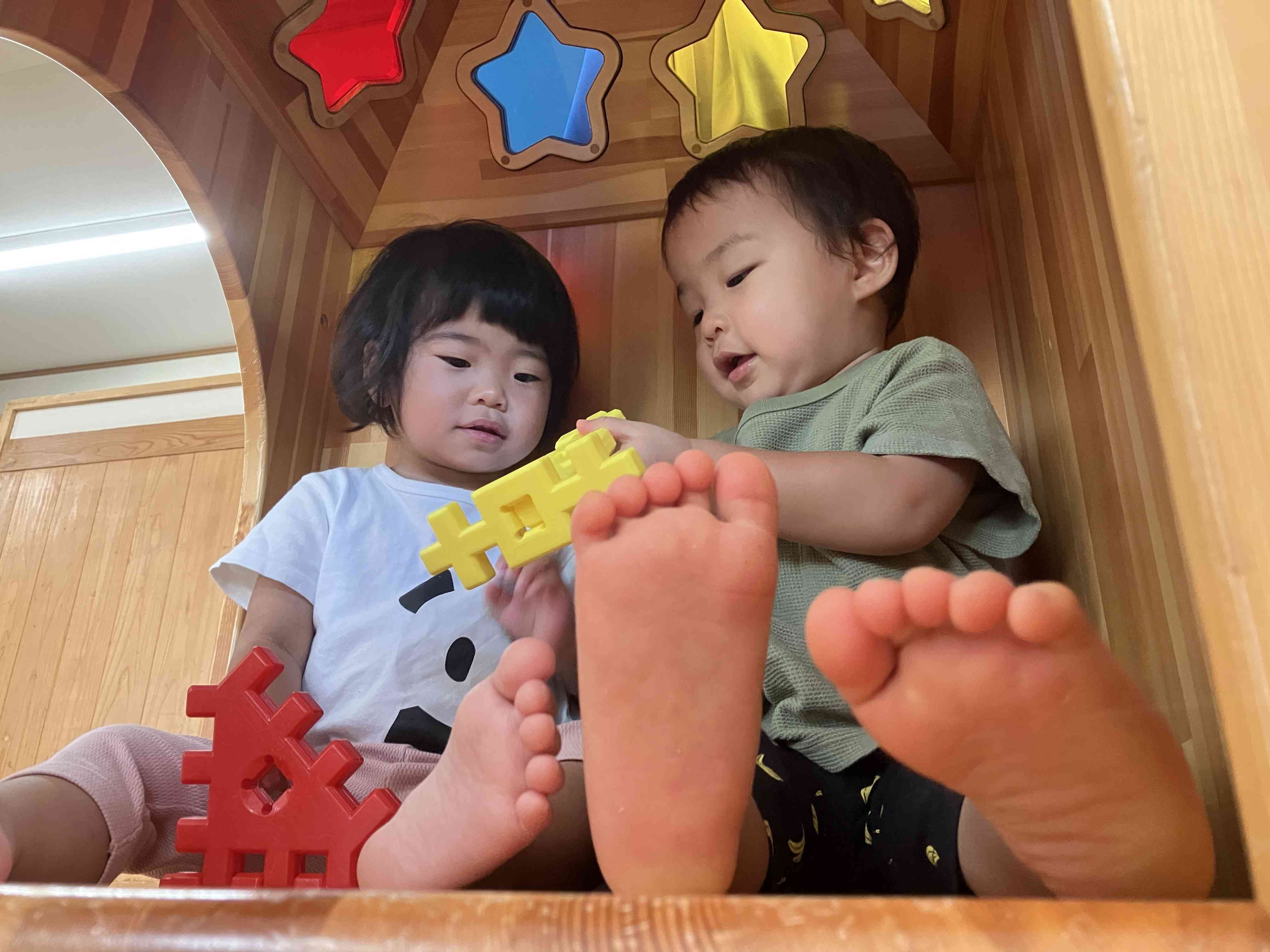 乳児朝の一場面。ごにょごにょお話ししながら星のお家でまったり。
