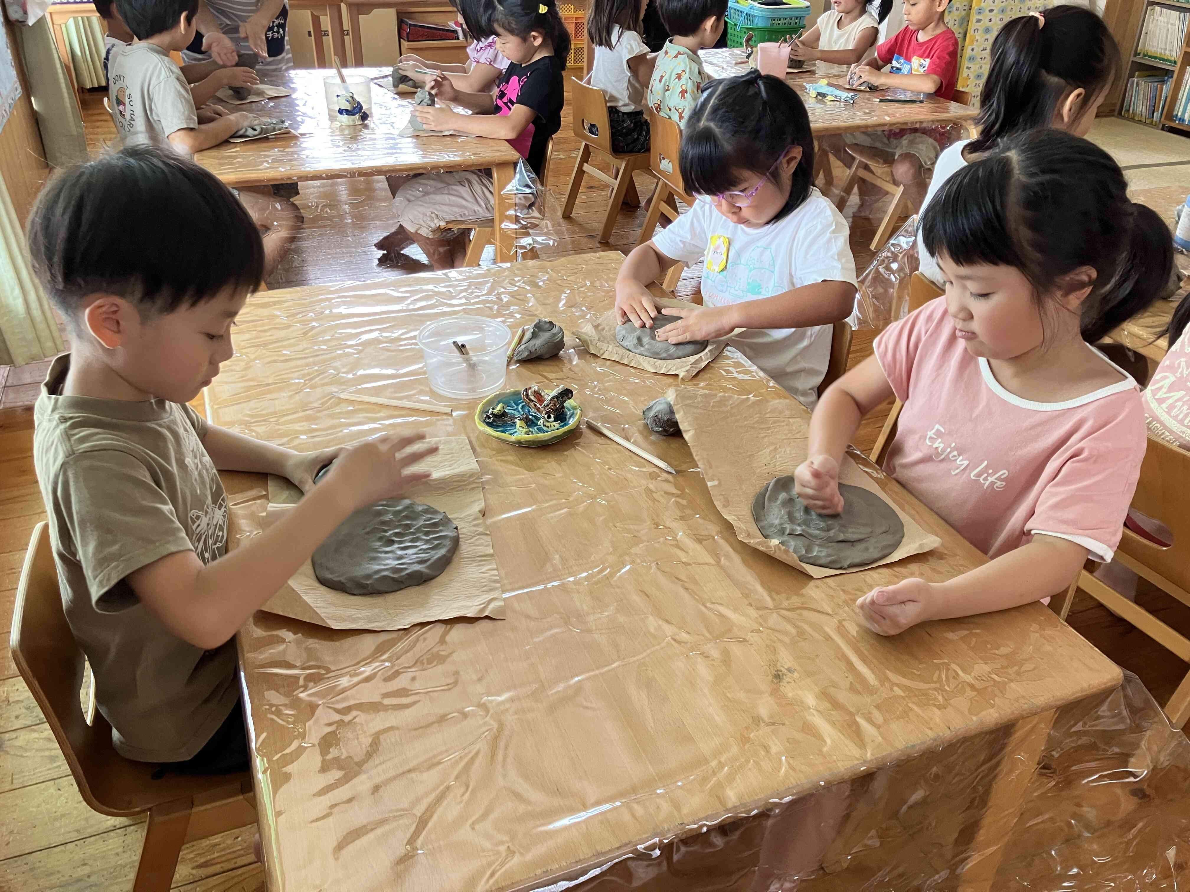 池作りからスタートした5歳児さん、カメやサメ、クラゲを作ってました。