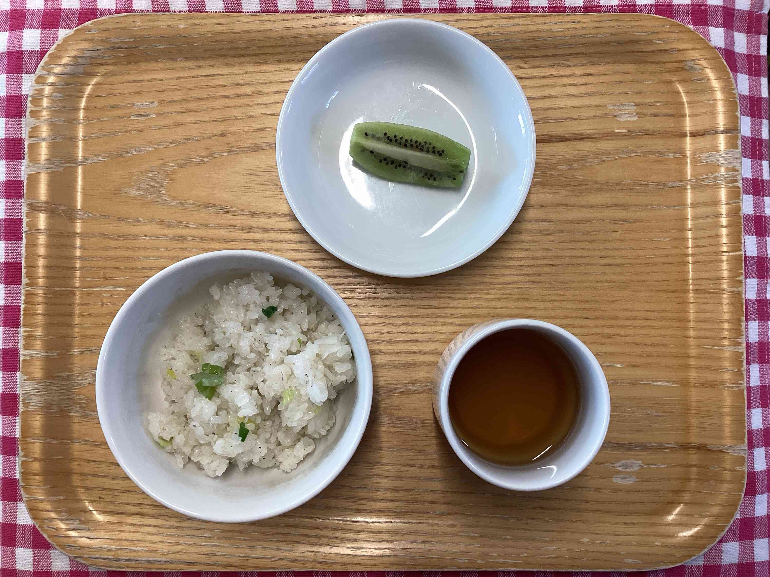 今日の献立 2025/12/22 ■ 給食 食パン(天然酵母) きのこクリームチキン ブロッコリーとツナのサラダ さつまいもの甘煮 ほうれん草スープ ■ おやつ ねぎとしらすチャーハン 麦茶 キウイフルーツ
